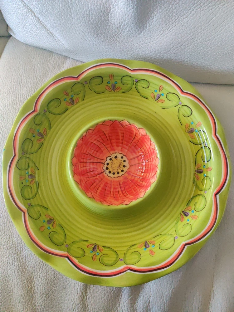 Pier 1 Pasilla Chip & Dip Bowl Appetizer Tray Fiesta nacho flower 13.5" hand painted. Good pre owned condition. Some crazing. 1 small pictured chip in the glaze. See photos for description....