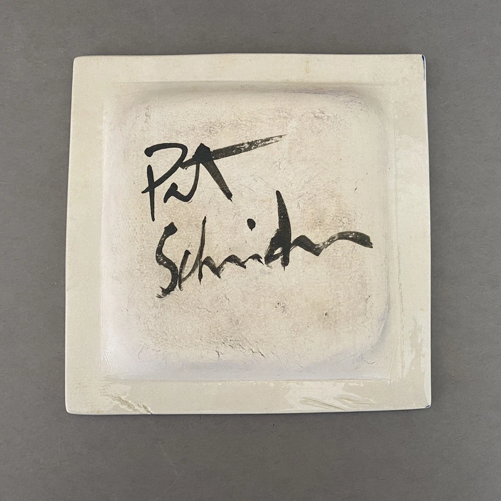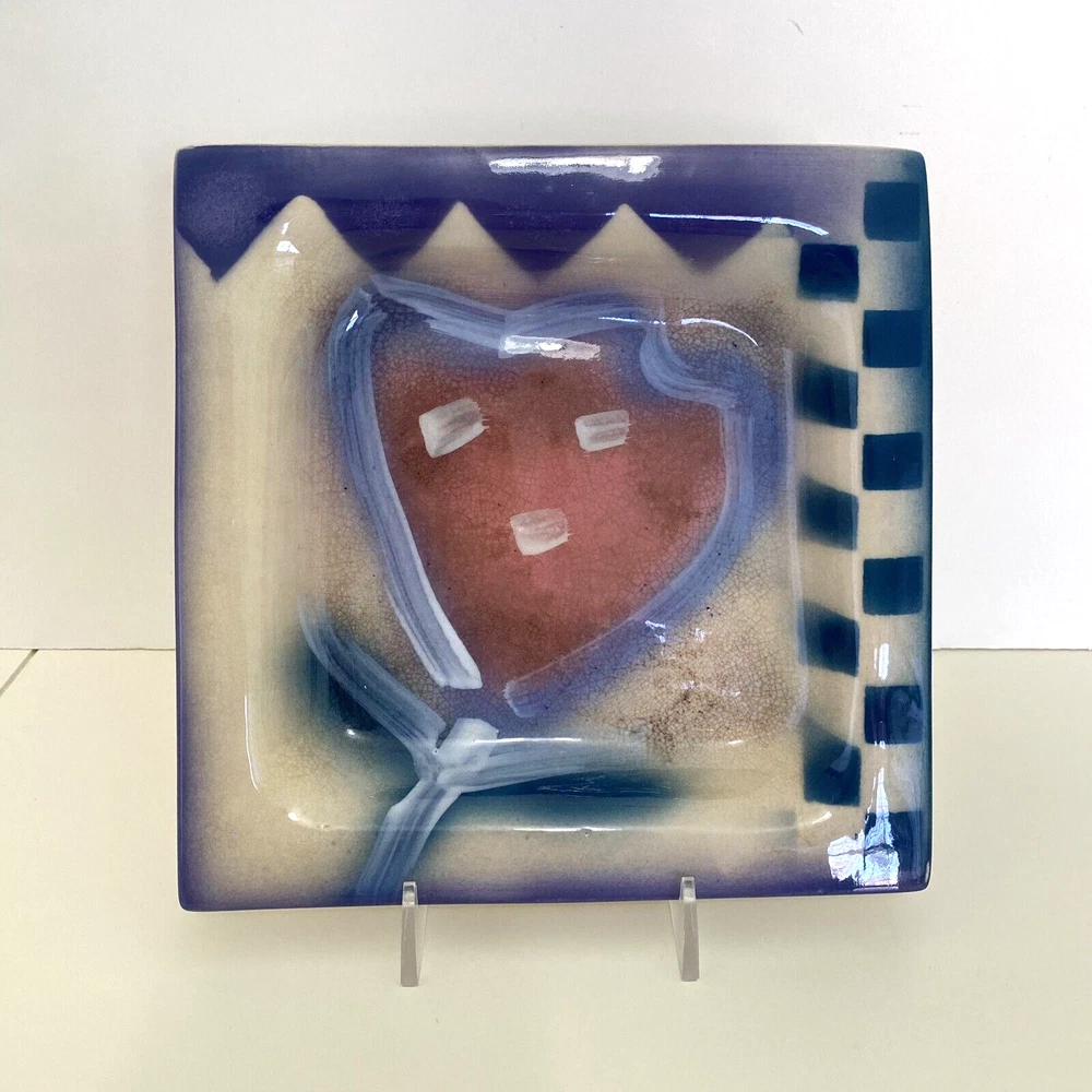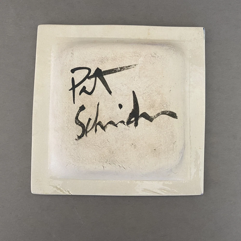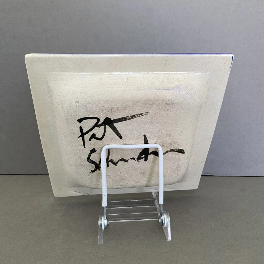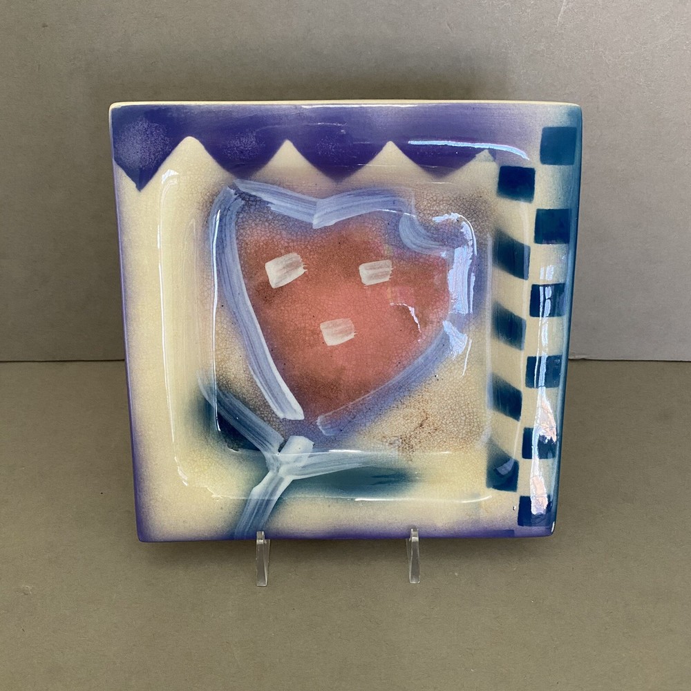 Up for your consideration is a Patricia Hughes-Schneider of Ohio studio art stoneware square dish or small tray that has been hand made and hand decorated with an abstract design of a flower. There is a zig-zag purple border at the top and a blue checkerboard design on the right. In the center is a pink flower surrounded by a white line and green / white stem with leaves. Light purple is visible along the bottom edge and on the left side. The rim of the dish is raised along the four sides, giving the dish some dimension. The dish stands 3/4ths of an inch tall, measures 7 inches across by 7 inches from front to back, and weighs 1 pound, 2 5/8 ounces. The back is hand signed Pat Schneider, an Ohio artist. The dish is in excellent, like-new condition, with no chips or cracks. There are no signs of wear or use. There is some discoloration but it is original to the dish or tray. Please see all the photos. Thanks for looking!