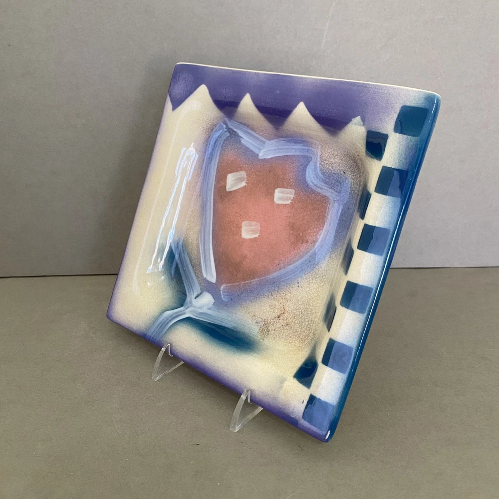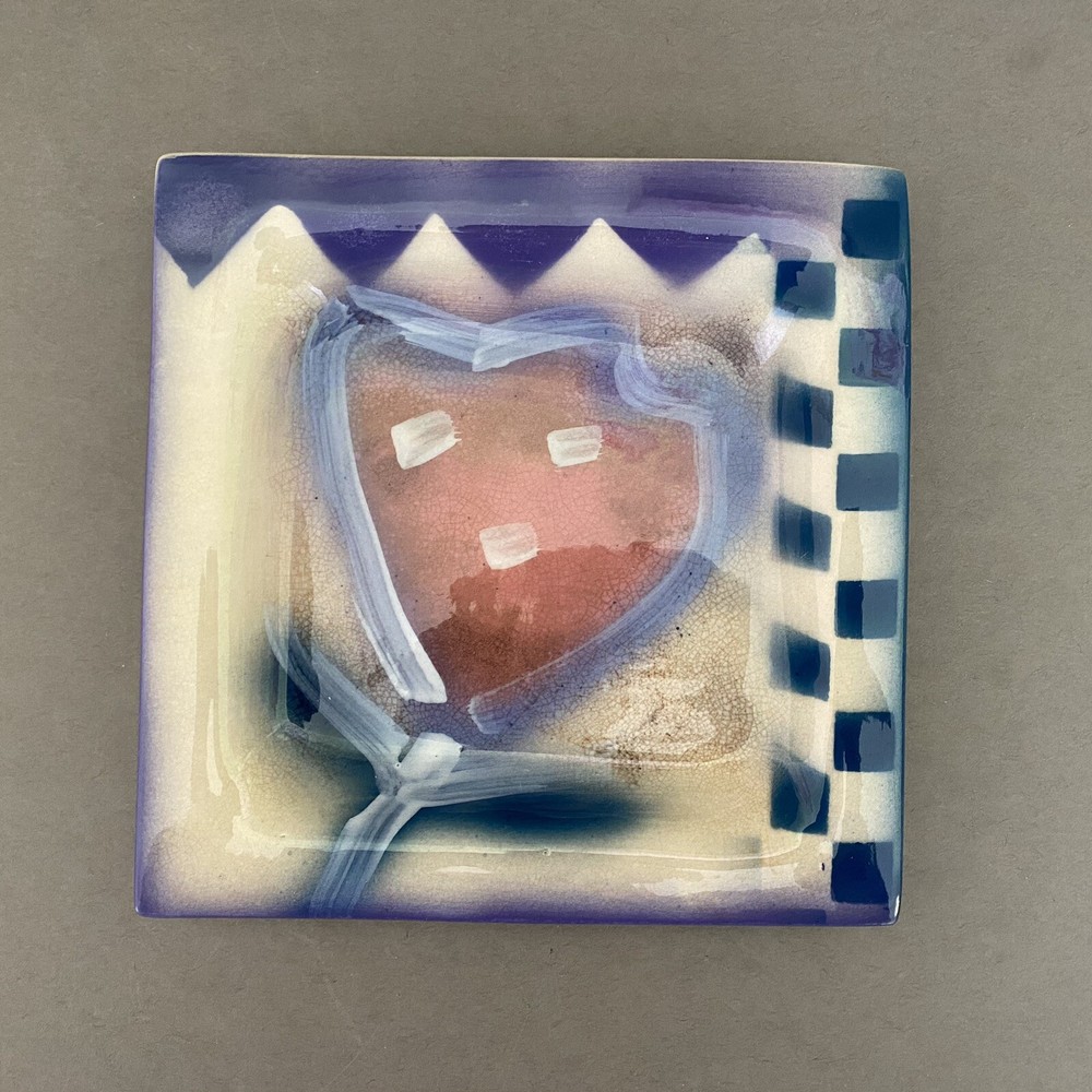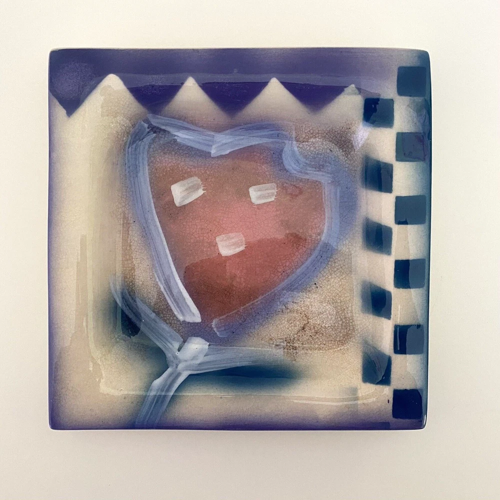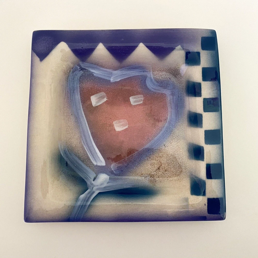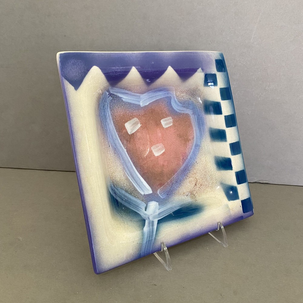 Up for your consideration is a Patricia Hughes-Schneider of Ohio studio art stoneware square dish or small tray that has been hand made and hand decorated with an abstract design of a flower. There is a zig-zag purple border at the top and a blue checkerboard design on the right. In the center is a pink flower surrounded by a white line and green / white stem with leaves. Light purple is visible along the bottom edge and on the left side. The rim of the dish is raised along the four sides, giving the dish some dimension. The dish stands 3/4ths of an inch tall, measures 7 inches across by 7 inches from front to back, and weighs 1 pound, 2 5/8 ounces. The back is hand signed Pat Schneider, an Ohio artist. The dish is in excellent, like-new condition, with no chips or cracks. There are no signs of wear or use. There is some discoloration but it is original to the dish or tray. Please see all the photos. Thanks for looking!