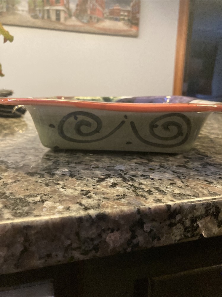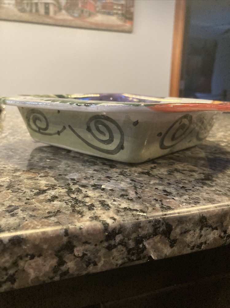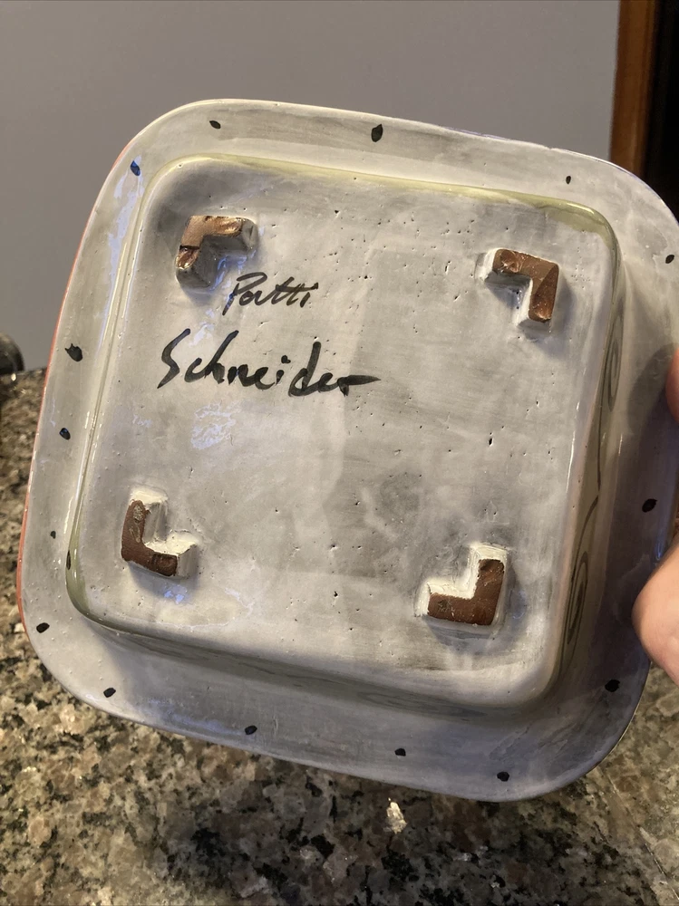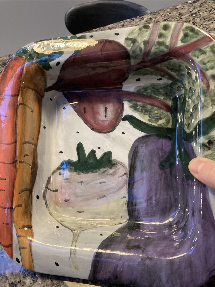 Absolutely love this vibrant, handcrafted square dish! The playful veggie details—carrots, beets, and more—are so whimsical and well-executed. Perfect for display or practical use, and the 10" size feels just right. Patti Schneider’s signature adds a special touch. A unique, charming piece with great heft and character!