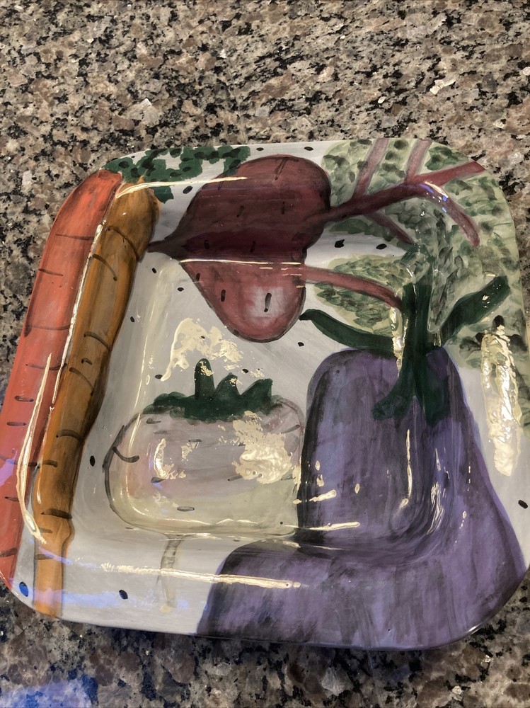 Studio / Handcrafted Pottery Square Bowl / Dish By Patti Schneider of Cleveland, Ohio..... a great whimsical bowl with vegetables including carrots, beet, turnip eggplant...great detail to the piece and great for display or use. 10" square including rim Weighs ~ 2 1/2 pounds View all photos as they are part of the description. Thanks for looking!
