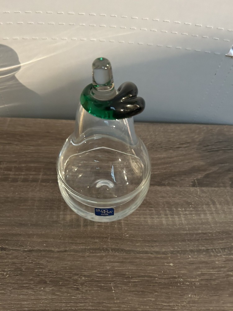 This beautiful candy bowl by Studio Nova is the perfect addition to any home decor. Its pear shape and clear glass material give it a unique and elegant look. The green glass leaf adds a touch of nature to this sweet treat bowl. Crafted with pressed glass production style in Poland, this bowl is not only stylish but also durable. Use it to serve candy, nuts, or any other small treats. Its size and shape make it a great centerpiece for any table or countertop. Add this pear-shaped candy bowl to your collection today!