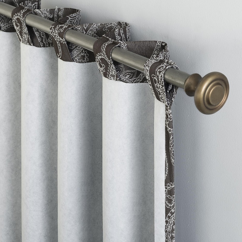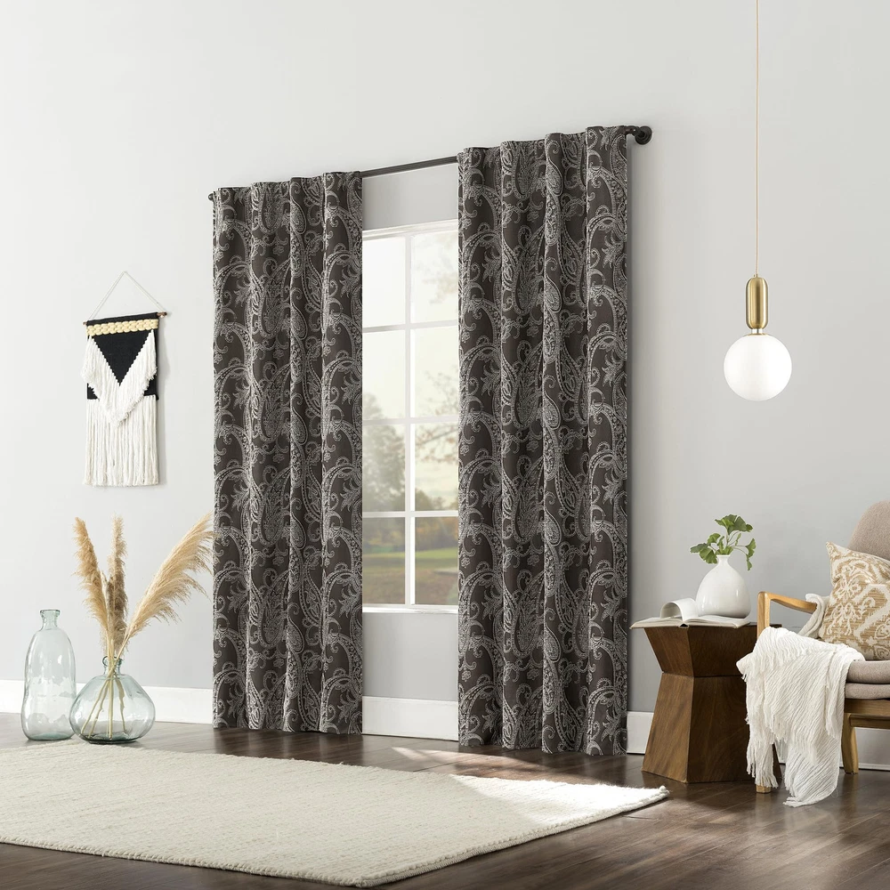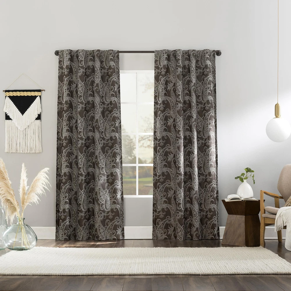 Featuring an intricately embroidered paisley pattern, Pedra Paisley Embroidery 100% Blackout Back Tab Curtain Panels add delicate detail to any living space. Equipped with back tabs for easy hanging on standard curtain rods up to 1.5" in diameter. Extreme Blackout™ Thermal Lining is laboratory tested to block out 100% of light, reduce outside noise by up to 40%, and decrease energy lost through your windows by up to 40%. Comfort is optimized with thermal properties that help keep summer heat and winter chill out of your home. Built-in metal grommets allow for easy slide-through installation on curtain rods up to 1.5" in diameter. Hang in your entertainment room to eliminate screen glare and reduce distracting outside noise, or in your bedroom for enhanced privacy and a sounder, more uninterrupted sleep. Sold as individual panels measuring 40" width by 96" length in color chocolate brown. Measure carefully before selecting your desired size and quantity. Rod not included. Machine wash cold on gentle cycle. Use non-chlorine bleach when needed. Tumble dry on low heat, using a cool iron as needed. Intricately embroidered paisley pattern adds delicate detail Extreme Thermal Blackout technology blocks out 100% of outside light Thermal properties help keep summer heat and winter chill out of your home Noise reduction up to 40% helps you get a sounder, more uninterrupted sleep back tabs fit curtain rods up to 1.5" in diameter Panels sold individually. Measure carefully prior to purchase (Image features 2 panels)