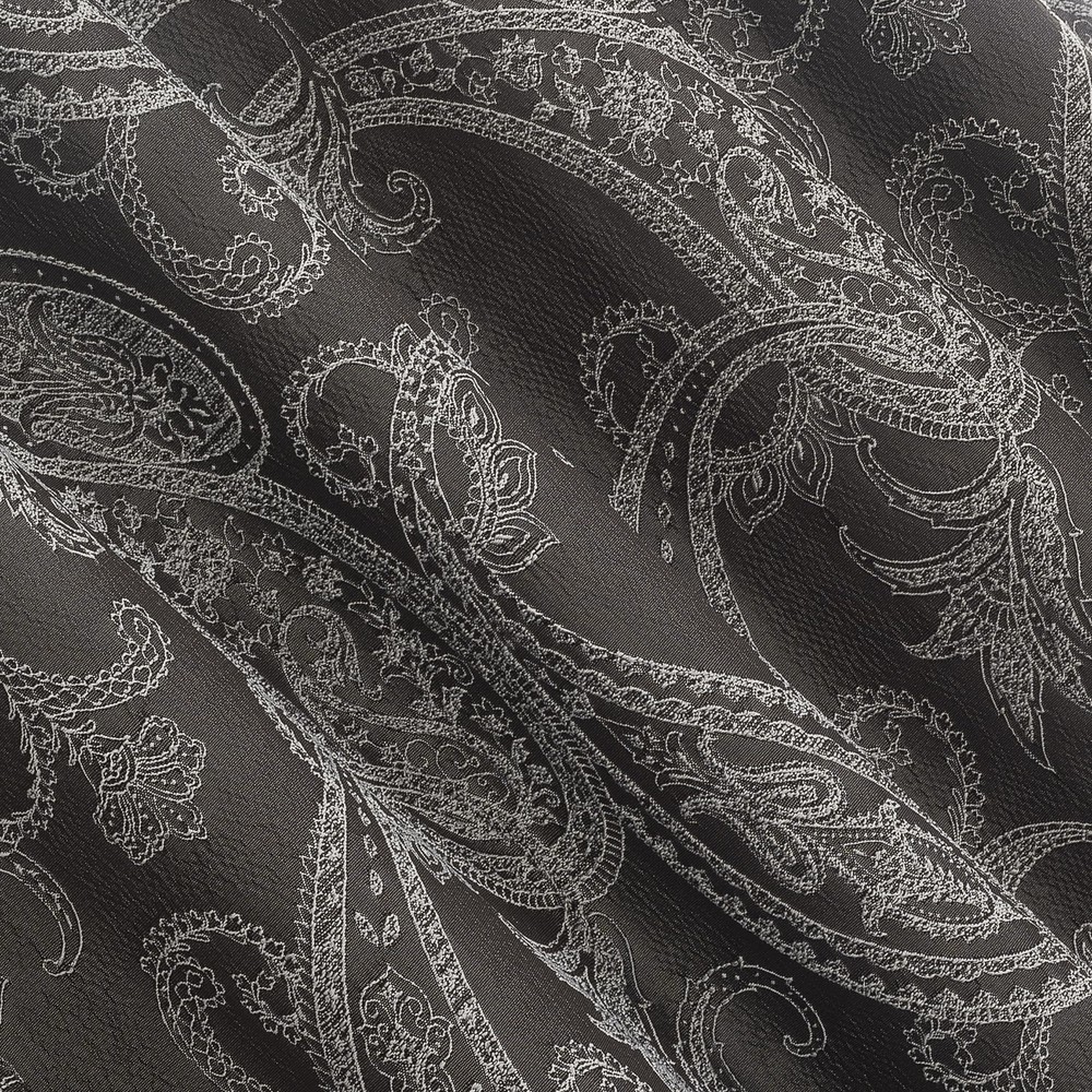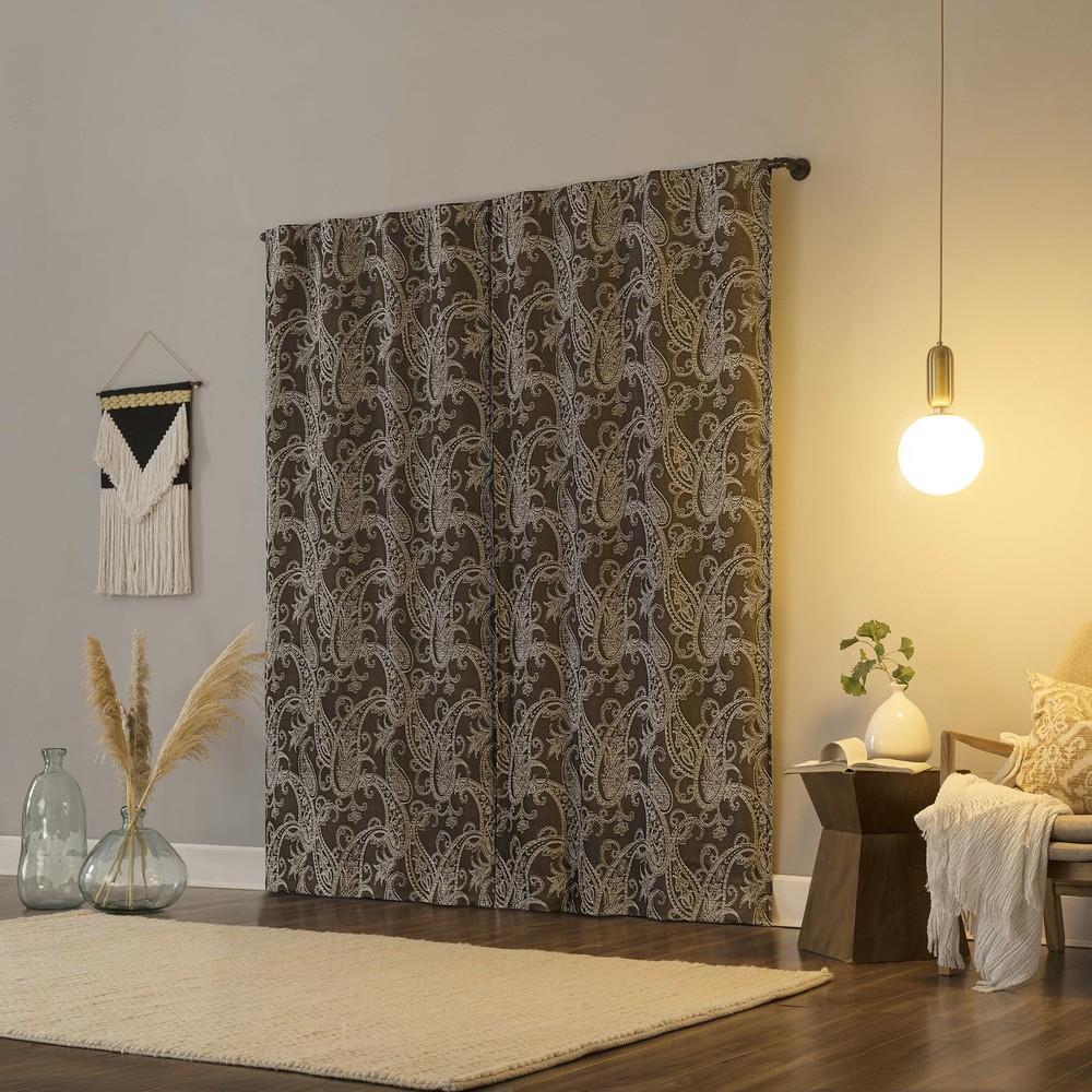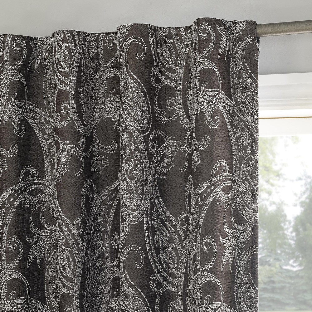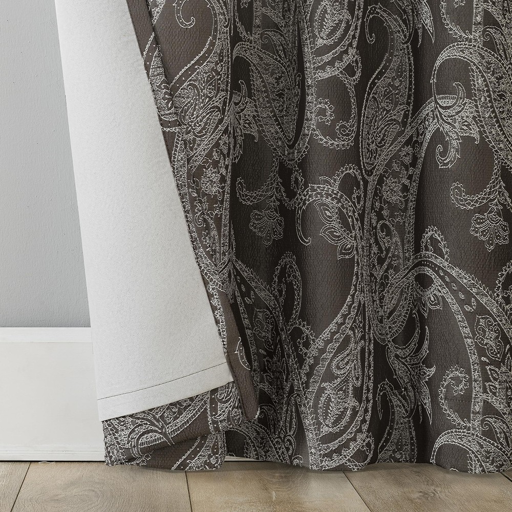 Featuring an intricately embroidered paisley pattern, Pedra Paisley Embroidery 100% Blackout Back Tab Curtain Panels add delicate detail to any living space. Equipped with back tabs for easy hanging on standard curtain rods up to 1.5" in diameter. Extreme Blackout™ Thermal Lining is laboratory tested to block out 100% of light, reduce outside noise by up to 40%, and decrease energy lost through your windows by up to 40%. Comfort is optimized with thermal properties that help keep summer heat and winter chill out of your home. Built-in metal grommets allow for easy slide-through installation on curtain rods up to 1.5" in diameter. Hang in your entertainment room to eliminate screen glare and reduce distracting outside noise, or in your bedroom for enhanced privacy and a sounder, more uninterrupted sleep. Sold as individual panels measuring 40" width by 96" length in color chocolate brown. Measure carefully before selecting your desired size and quantity. Rod not included. Machine wash cold on gentle cycle. Use non-chlorine bleach when needed. Tumble dry on low heat, using a cool iron as needed. Intricately embroidered paisley pattern adds delicate detail Extreme Thermal Blackout technology blocks out 100% of outside light Thermal properties help keep summer heat and winter chill out of your home Noise reduction up to 40% helps you get a sounder, more uninterrupted sleep back tabs fit curtain rods up to 1.5" in diameter Panels sold individually. Measure carefully prior to purchase (Image features 2 panels)
