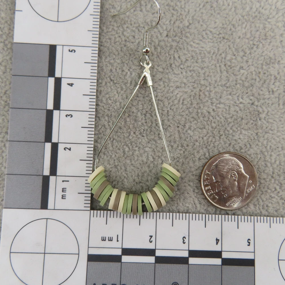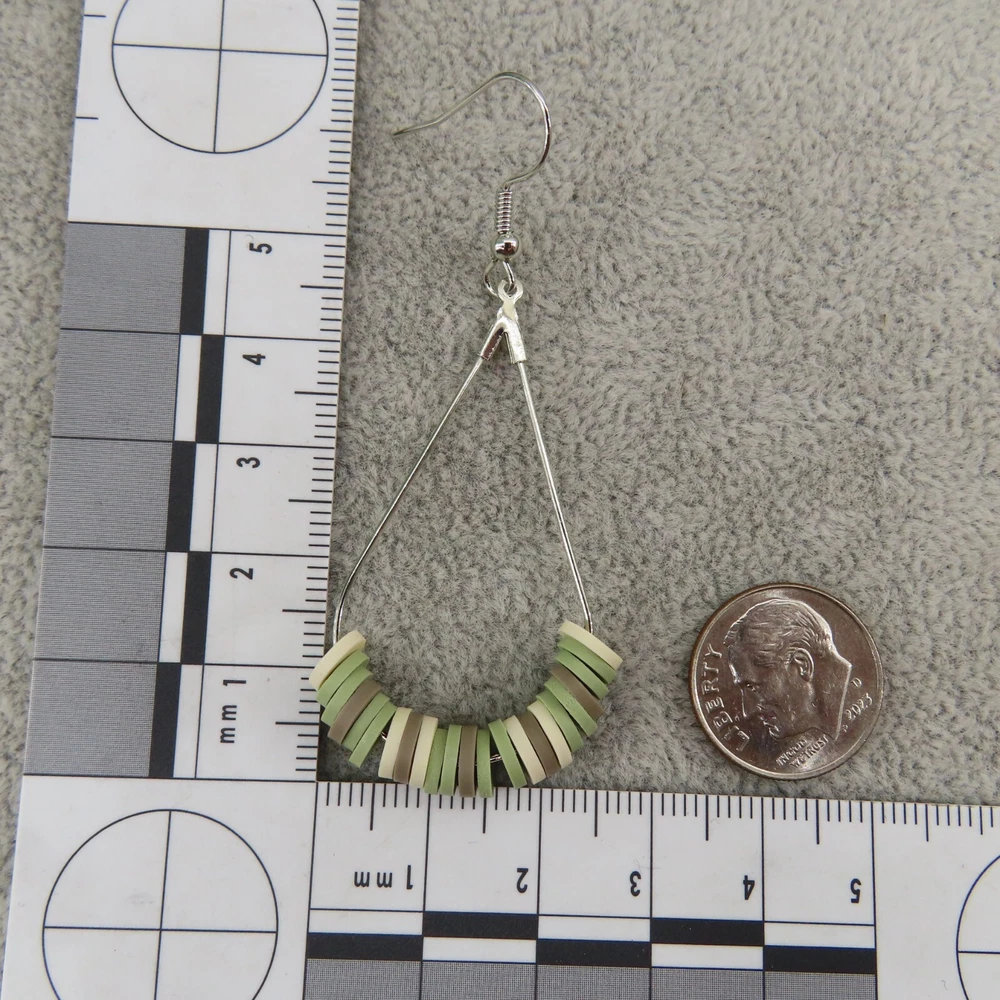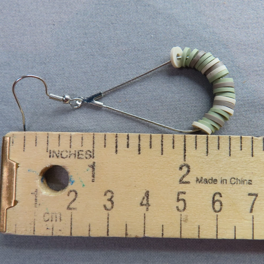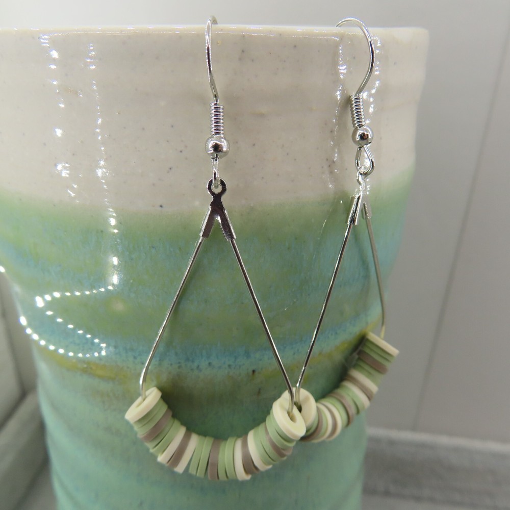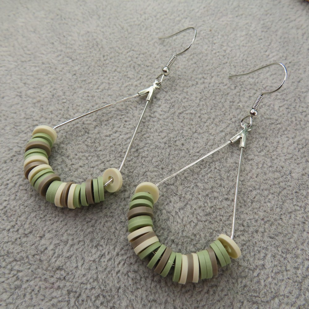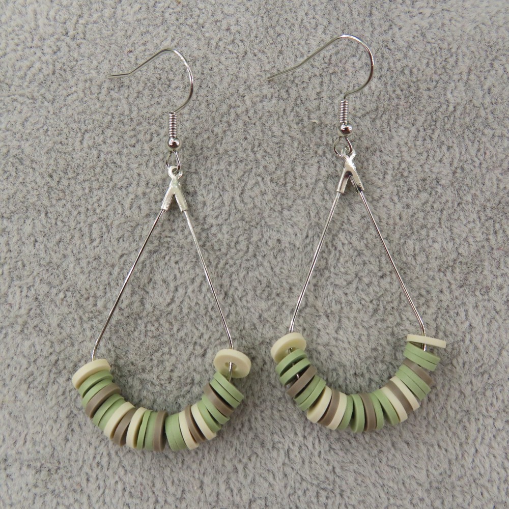 Army camo inspired sage green, khaki and cream soft clay beads with silver tone findings. Please see photos and ask any questions. Handmade by Pemby Studio. 4432