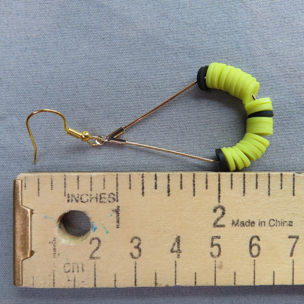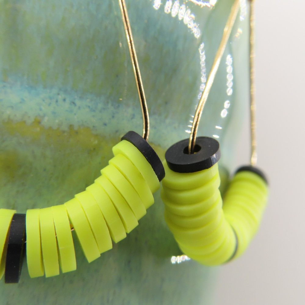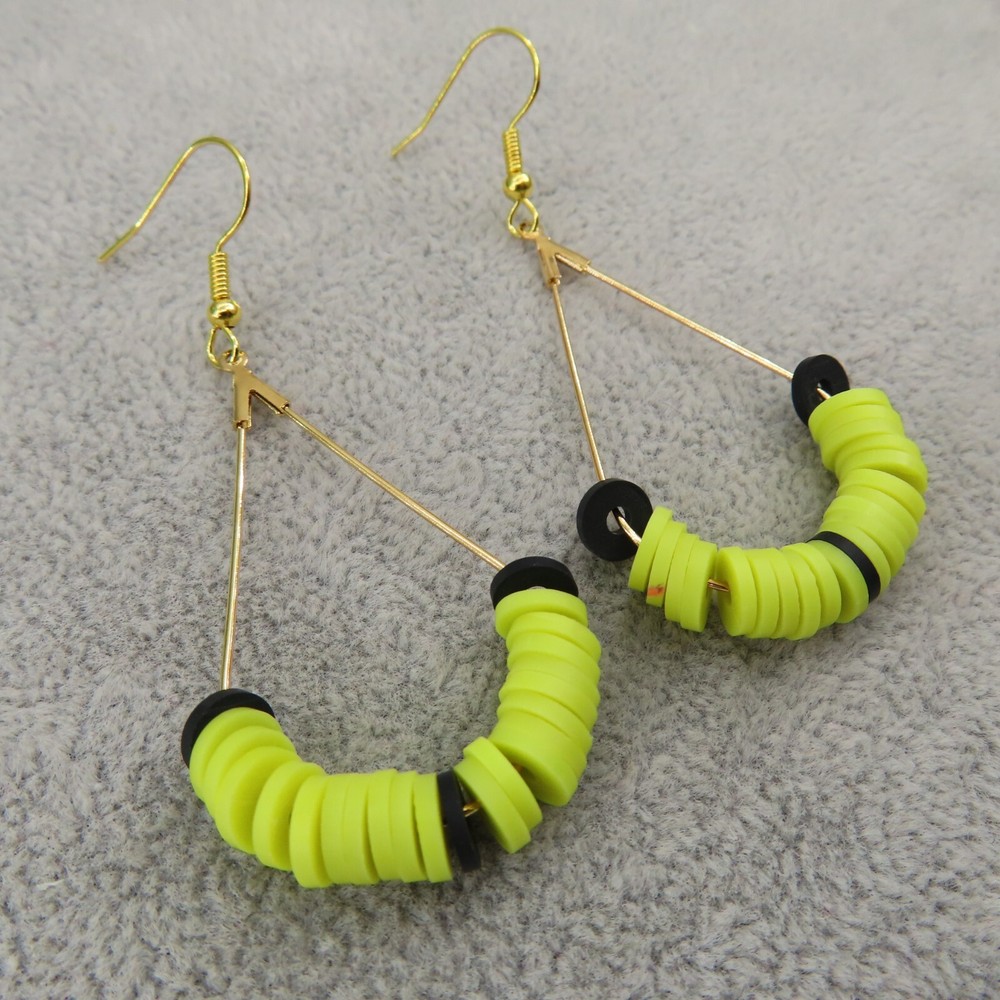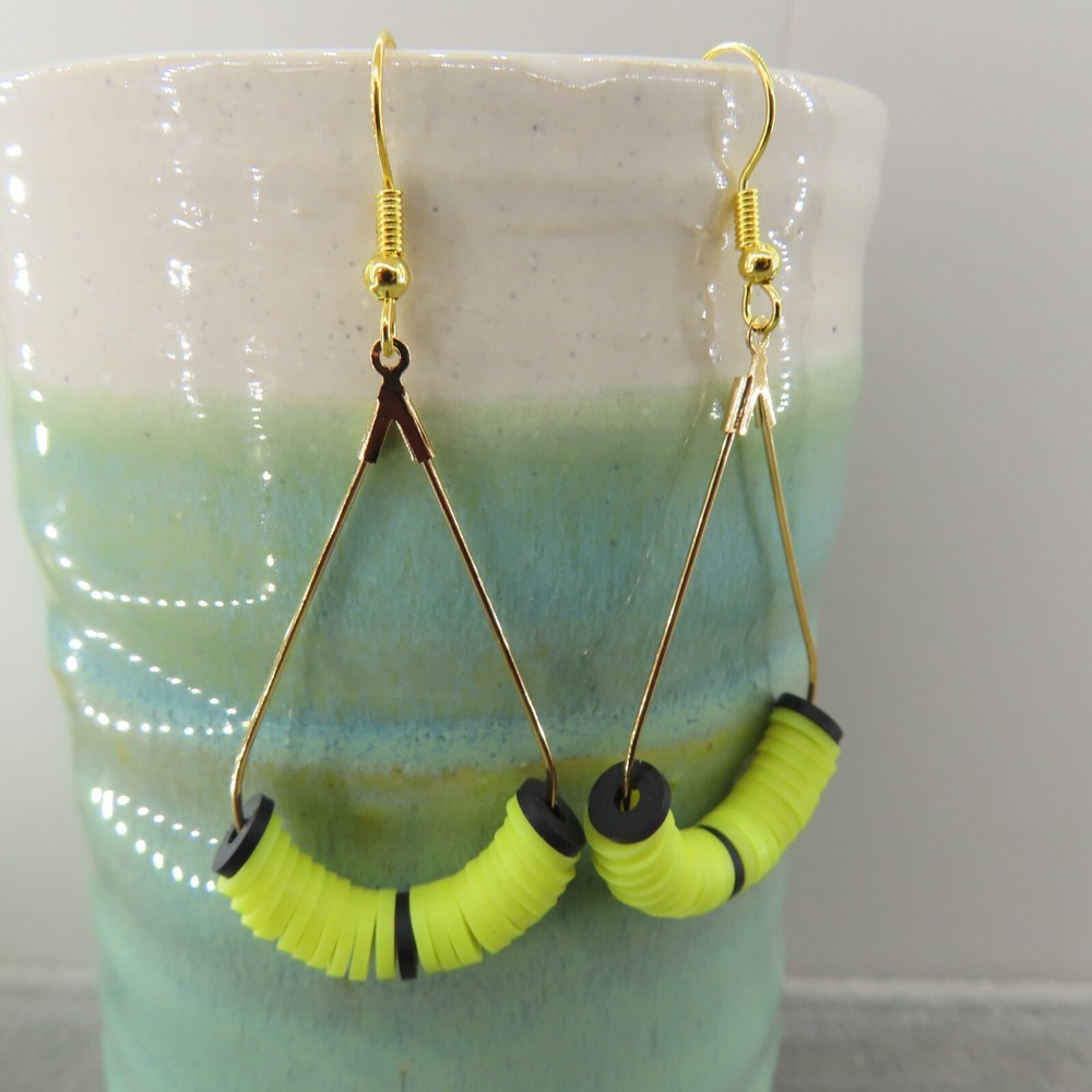 Black and neon yellow soft clay beads with gold tone findings. Please see photos and ask any questions. Handmade by Pemby Studio. 4440