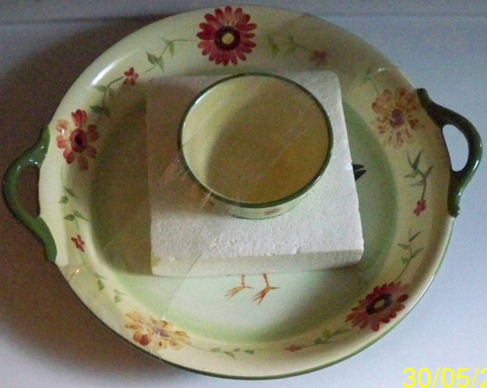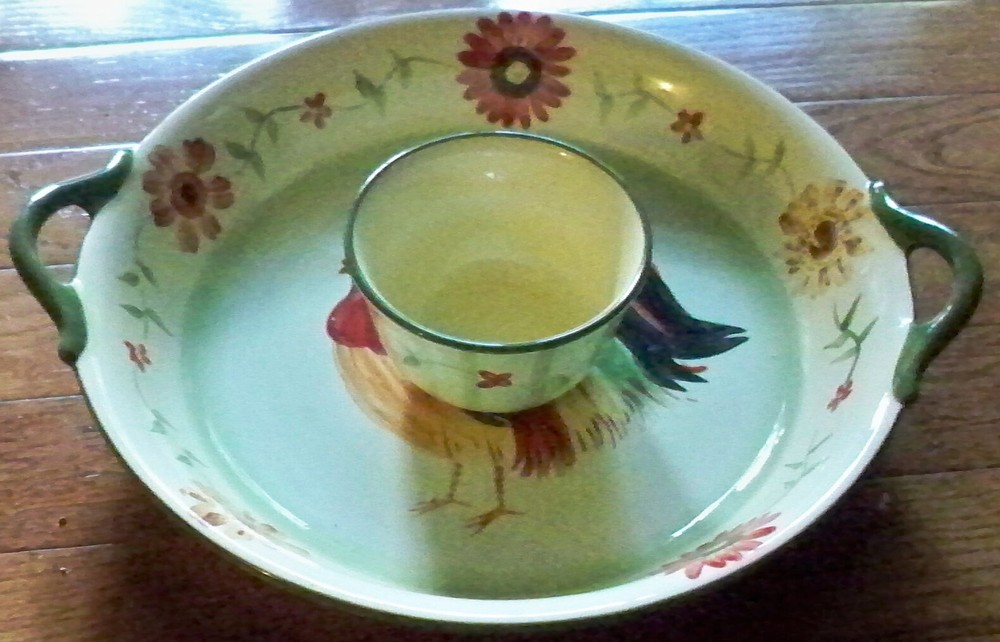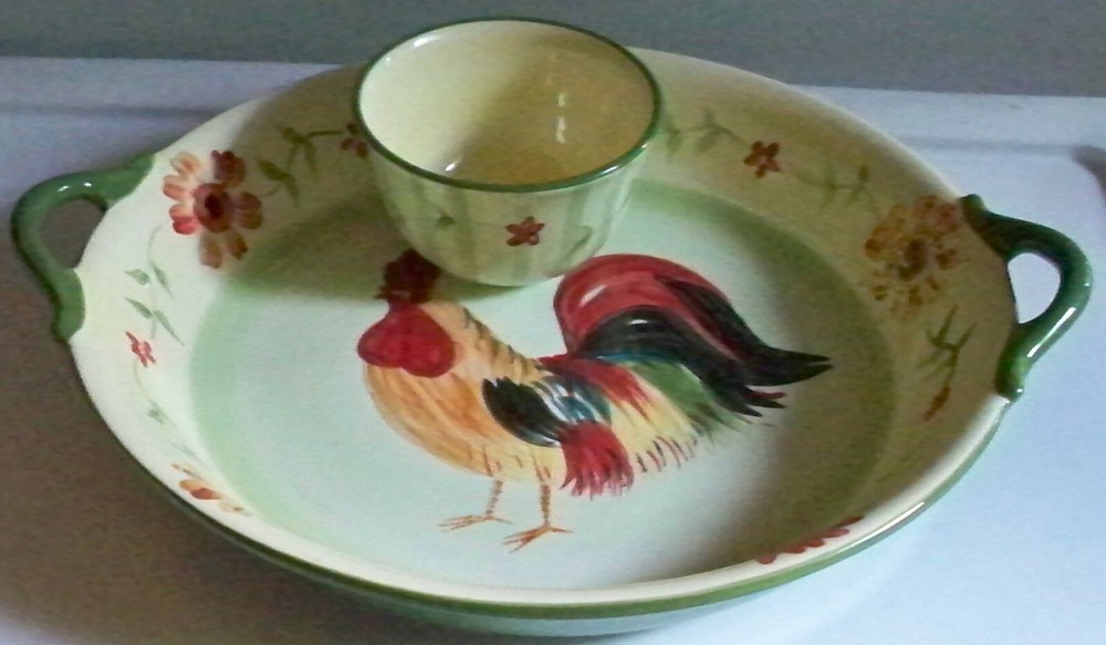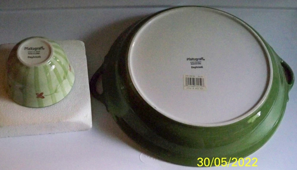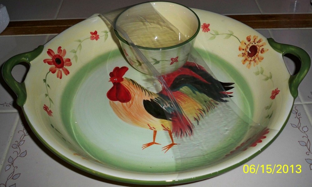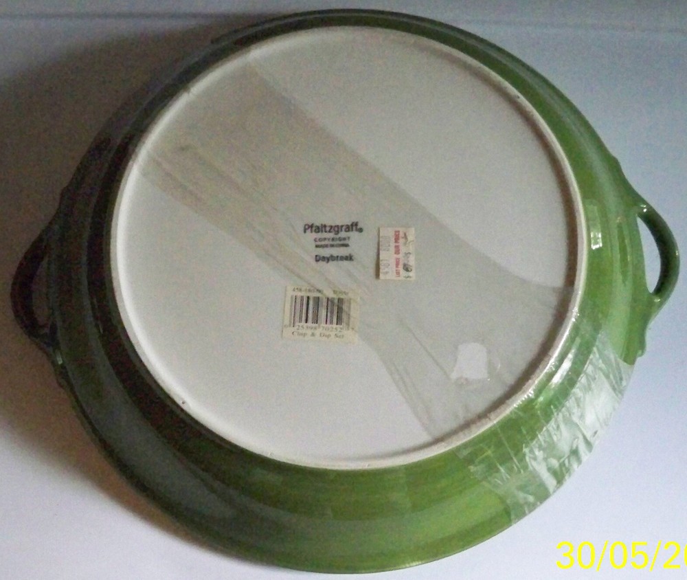 For Your consideration by Pfaltzgraff in the Daybreak Pattern I have a Beautiful Large Chip & Dip Set. Consists of 2 Pieces. The Large handled dish is approx. 16 & 1/4 Inches from handle-to-handle X the dish is 2 &1/2 Inches High X 3 & 1/8 Inches high at the handles. The dip bowl is approx. 3 Inches high X 5 Inch Diameter. On the bottom of the chip dish is printed Pfaltzgraff Copyright Made in China Daybreak, as is the same on the bottom of the bowl. Has the original tags on the bottom of the handled dish.Has been retired. Heavy Has been Stored in the closet. I try to describe the item to the best of my ability. Heavy. In excellent condition. The colors are very clear. From a Non-smoking home. Any questions, please ask. I do package well. I do combine shipping, but items must be able to be safely packaged together so as to prevent damage or breakage. Shipping by UPS. Please allow for the UPS hours of operation, weekend and Holiday hours. I mail parcels out Monday thru Friday before 3 PM Thank you for viewing my auction.