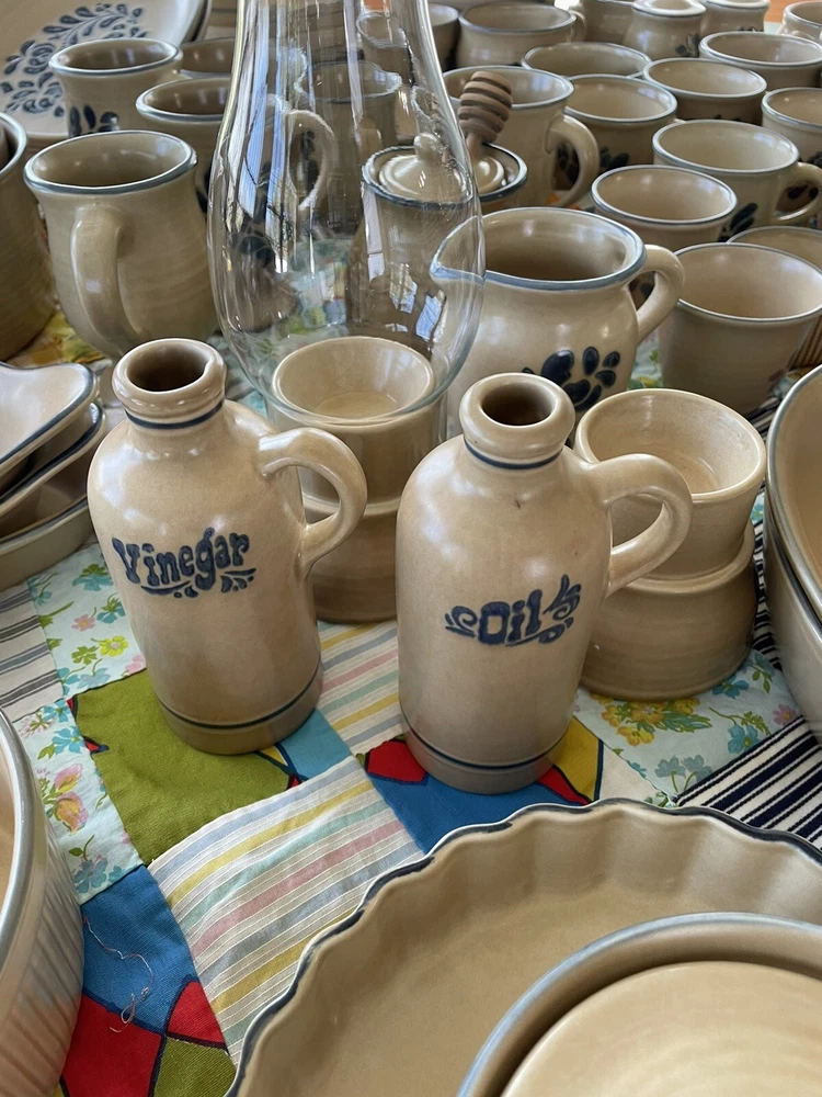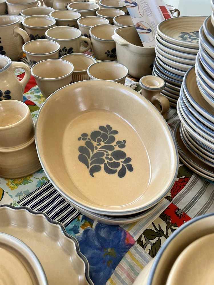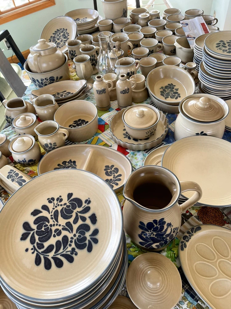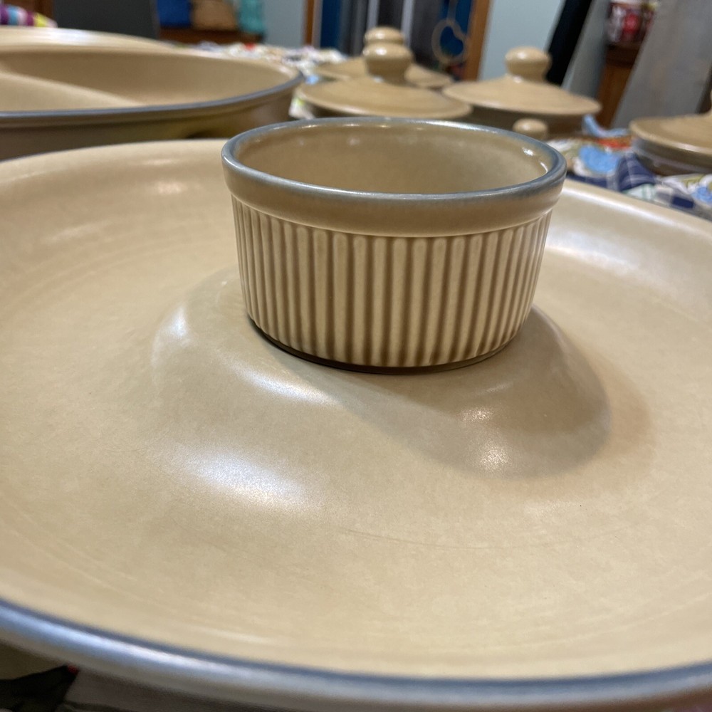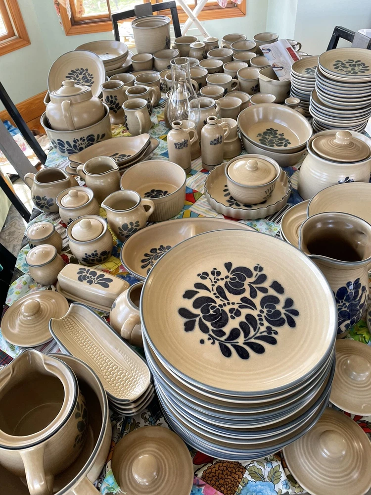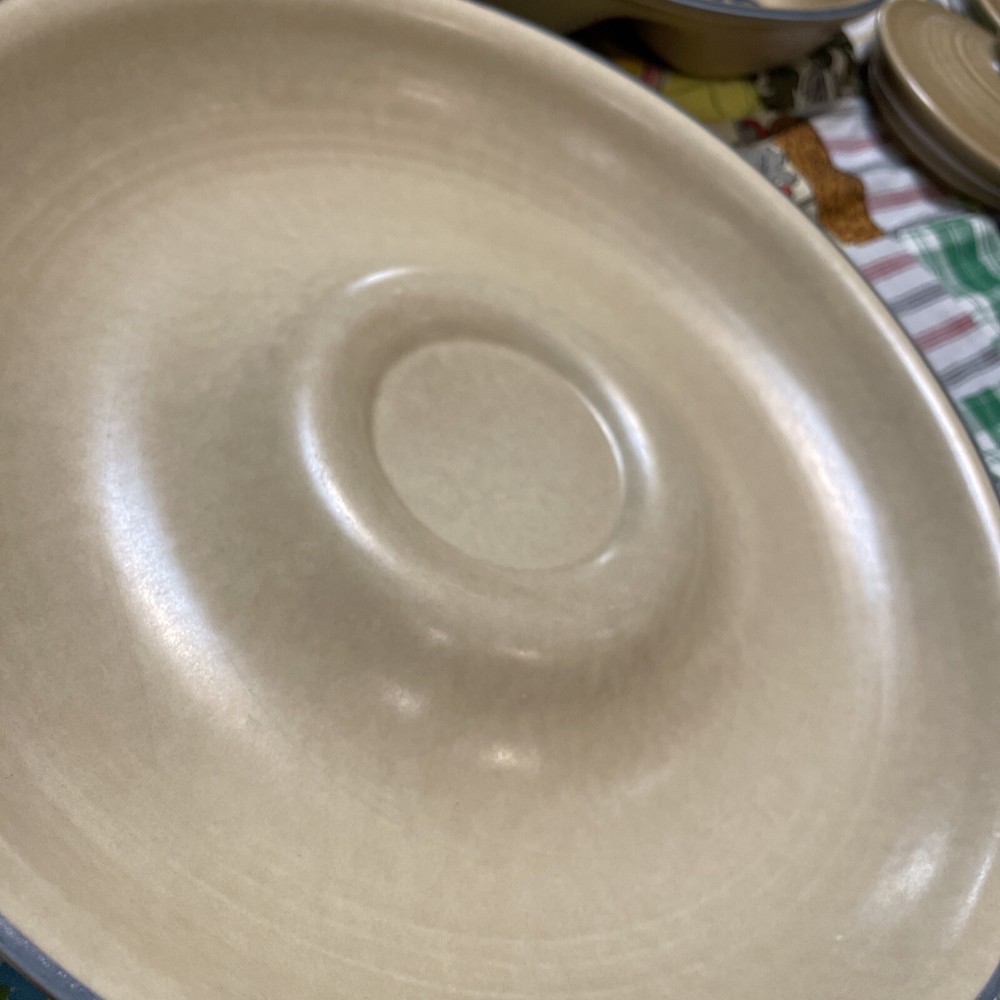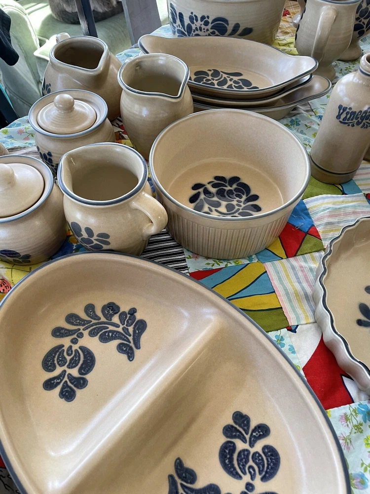I have a bunch of Vintage 1980’s Pfaltzgraff Folk Art Dinnerware to sell. Please see the photos. This listing is for 1 round platter and one dip bowl #405. It is 11.5” diameter. They are in excellent shape with no chips or cracks. This beautiful Pfaltzgraff Folk Art Blue and Tan Chip & Dip serving bowl is perfect for entertaining guests or serving your favorite fruits and veggies. The ceramic stoneware material and round shape make it a durable and stylish addition to any kitchen. With a diameter of 11.5 inches, this bowl is large enough to hold plenty of snacks for your guests. The blue and tan colors and country kitchen style add charm to any setting. Whether you're hosting a party or just enjoying a quiet night in, this original Pfaltzgraff piece is sure to impress.