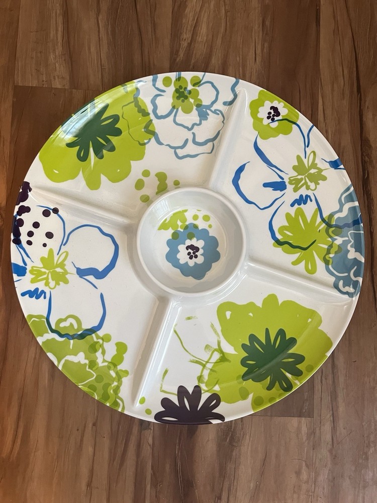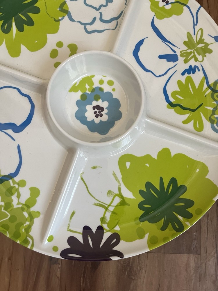 Pier 1 Melamine Flower Lime Green Blue Chip & Dip Bowl Appetizer Tray Divided @3...
