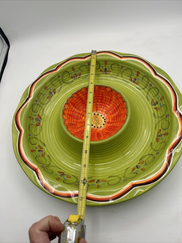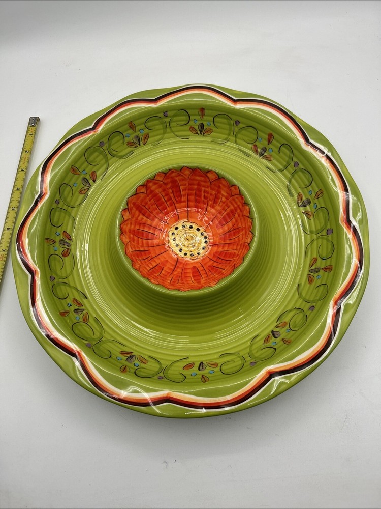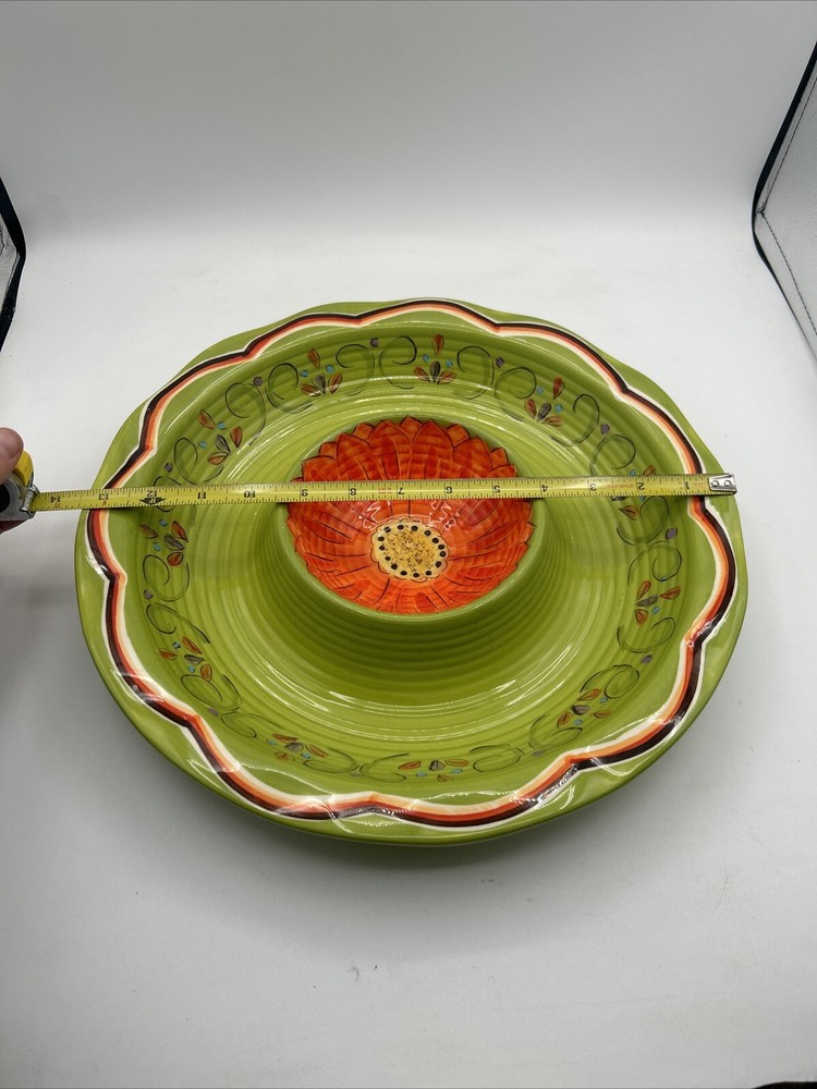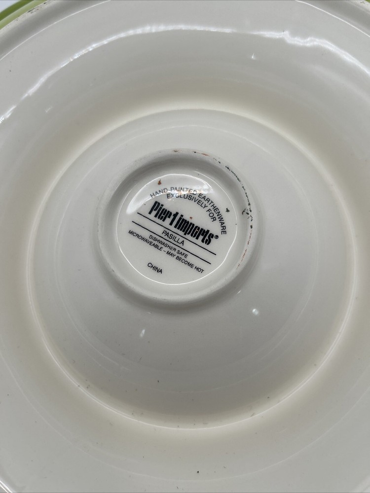 Add some festive flair to your next party with this Pier 1 Imports Mexicali Chip & Dip Bowl. Hand-painted with a vibrant Mexican Fiesta theme, this round stoneware bowl is the perfect addition to any occasion. Measuring 13.5 inches in diameter and 1 5/8 inches tall, this bowl is the perfect size for serving chips and dips, dips and snacks, or even as a decorative piece. Crafted in China using art pottery techniques, this bowl features a glossy finish and a printed backstamp. The Mexicali pattern is perfect for a Fiesta or Mexican-themed party, and the bowl is a great way to impress your guests. Whether you're looking for a unique serving piece or a decorative accent, this Pier 1 Imports Mexicali Chip & Dip Bowl is sure to impress.