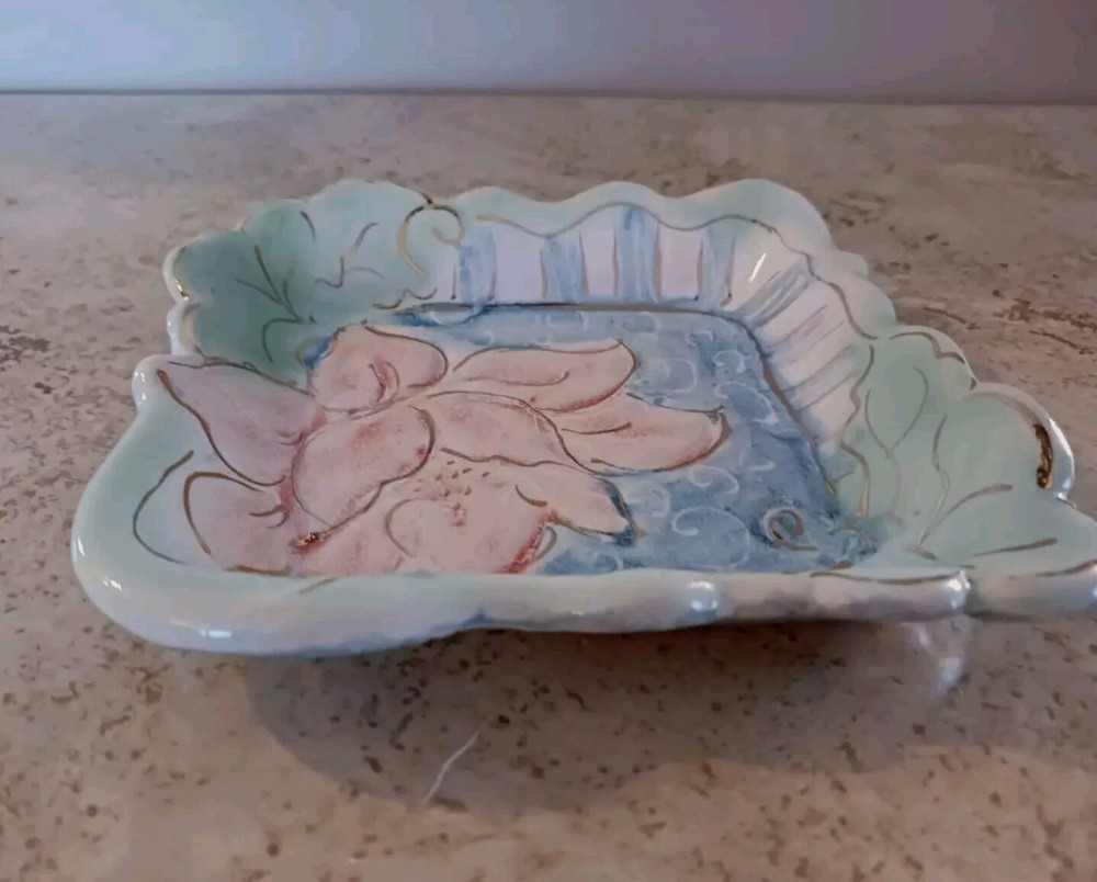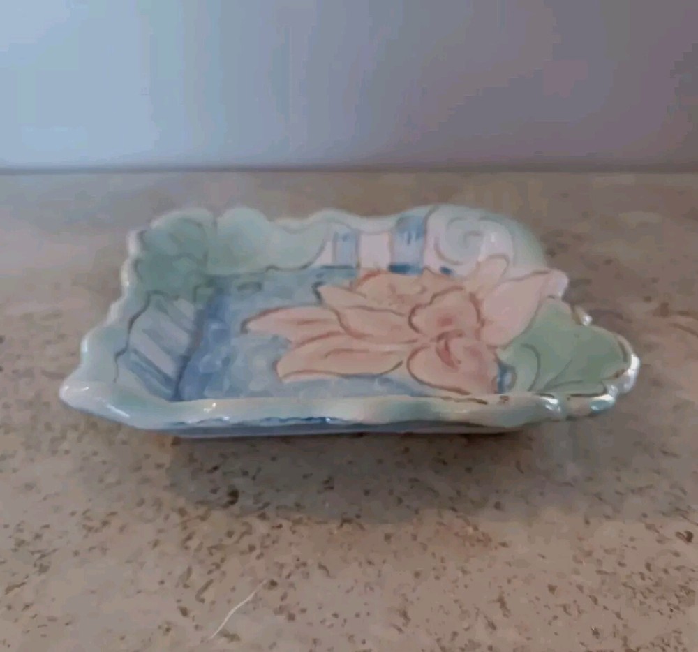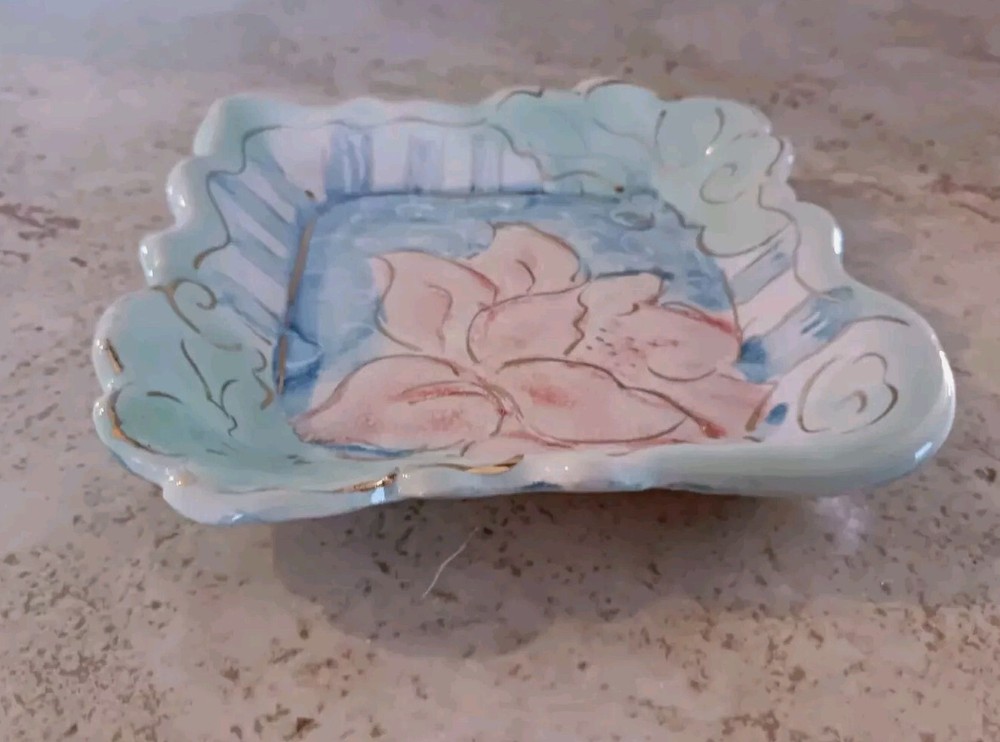 Beautiful handmade sudio pottery art trinket dish in pink, blue, green pastel floral motif with gold embellishments and a scalloped edge. Item is well constructed and in great shape with no chips, cracks or stains. Bottom signed by artisan. Item measures 4 3/4" x 4 3/4" x 5/8".