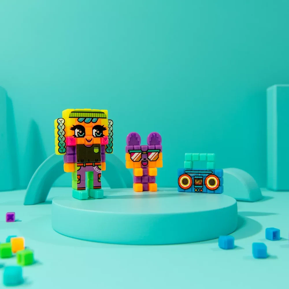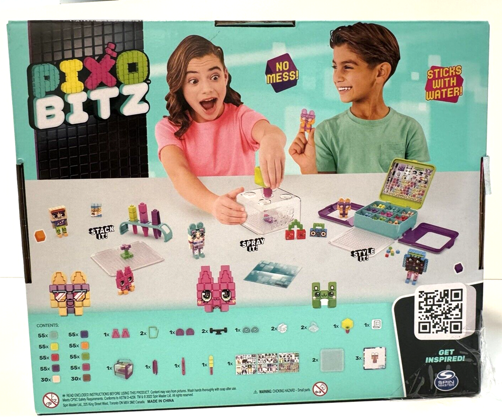 No heat, mess-free Bitz (cube-shaped beads) stick with water! Stack on the tray, spray each layer and style with unique Pixobitz accessories and water transfer decos! With 14 accessories like keychains and photo clips and over 100 decos like facial expressions, outfits, letters and more, style your way! Follow the templates or make your own creations! Make 3D and 2D creations like avatars, a boombox and more with 500 Bitz in 10 colors, 4 tools, 3 templates (for 12 designs), 14 accessories and over 100 water decos! The Pixobitz Studio toy fits everything inside and becomes a carrying case. Store the water fuse beads kit with your crafts and art supplies or take it on-the-go! Pixobitz crafts for kids are great gifts! Discover endless ways to create with Pixobitz! Perfect arts and crafts toys for creative kids who enjoy DIY, self-expression, craft kits, building toys and more.