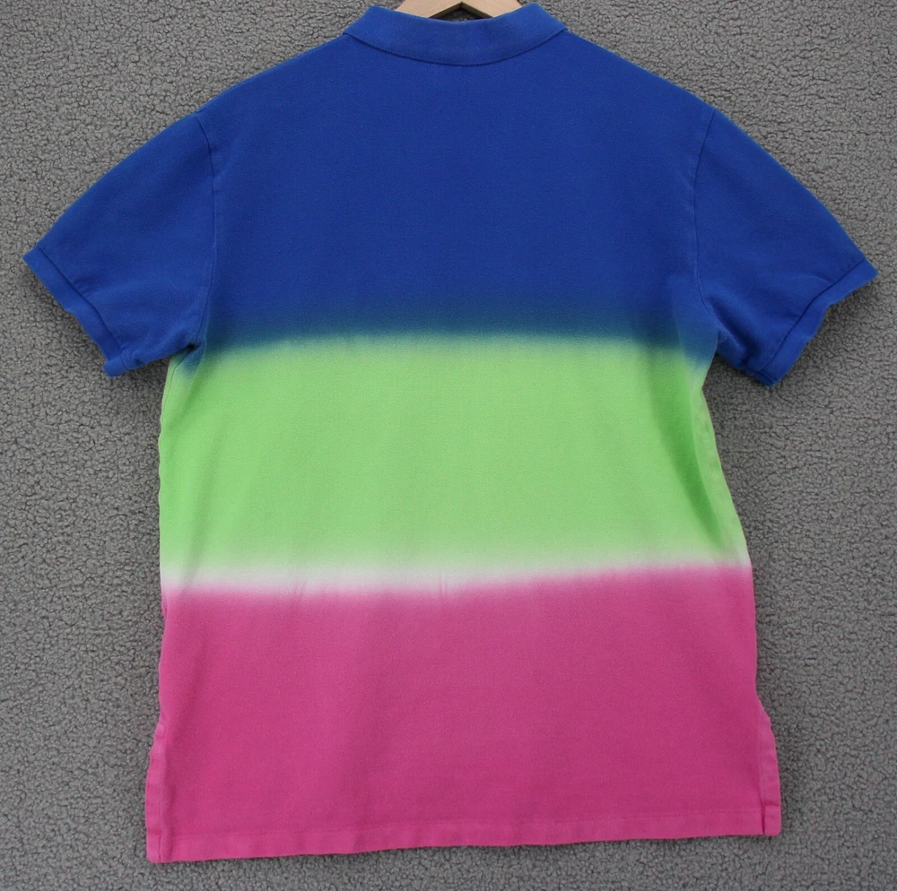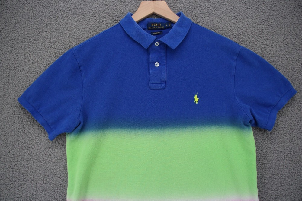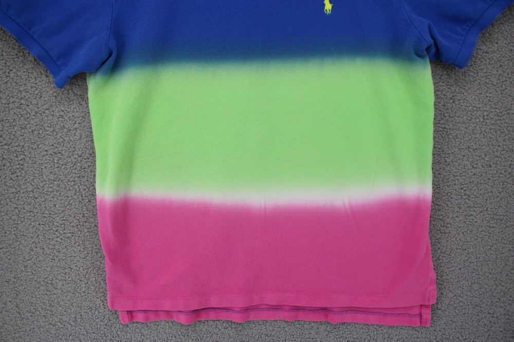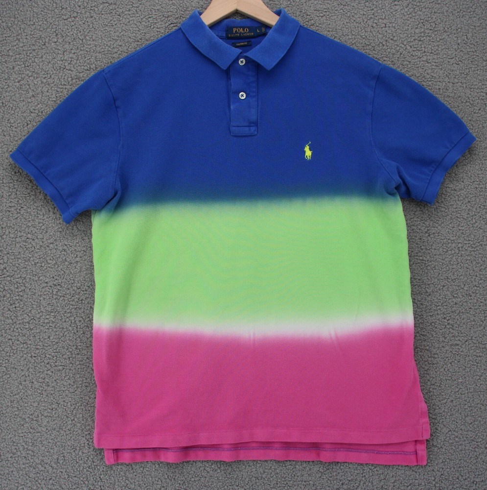 For sale is a Polo Ralph Lauren Shirt Men Large Custom Fit Dip Dye Striped Blue Green Pink Size: Large Chest (Armpit to Armpit): 22" Length: 26" Condition: Some fading to the blue and the collar. Overall good gently used, preowned condition We ship out Monday through Friday, same or next business day Offer includes hassle free 30 days returns, even for fit or just don't like it. Please see photographs of the item for details of condition and measurements Purchase with Confidence from The Scouting Owls!