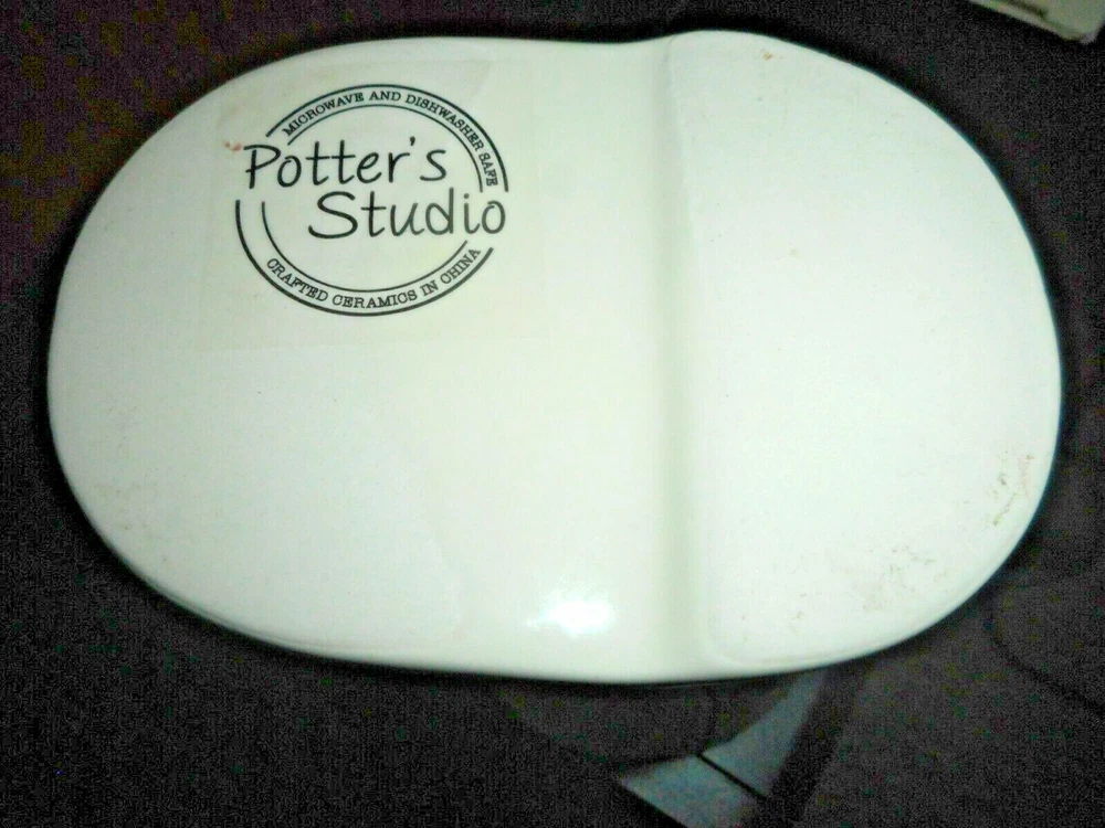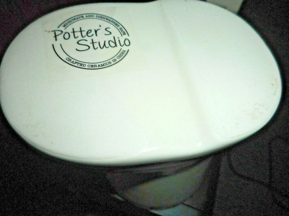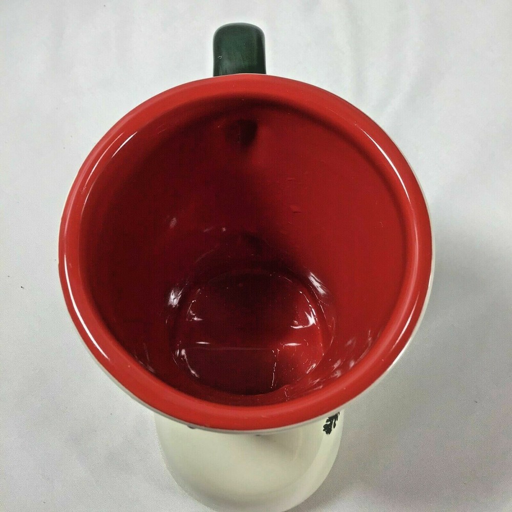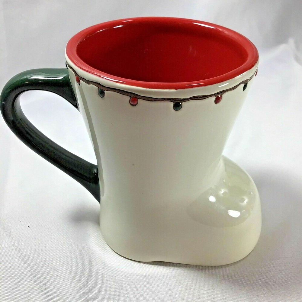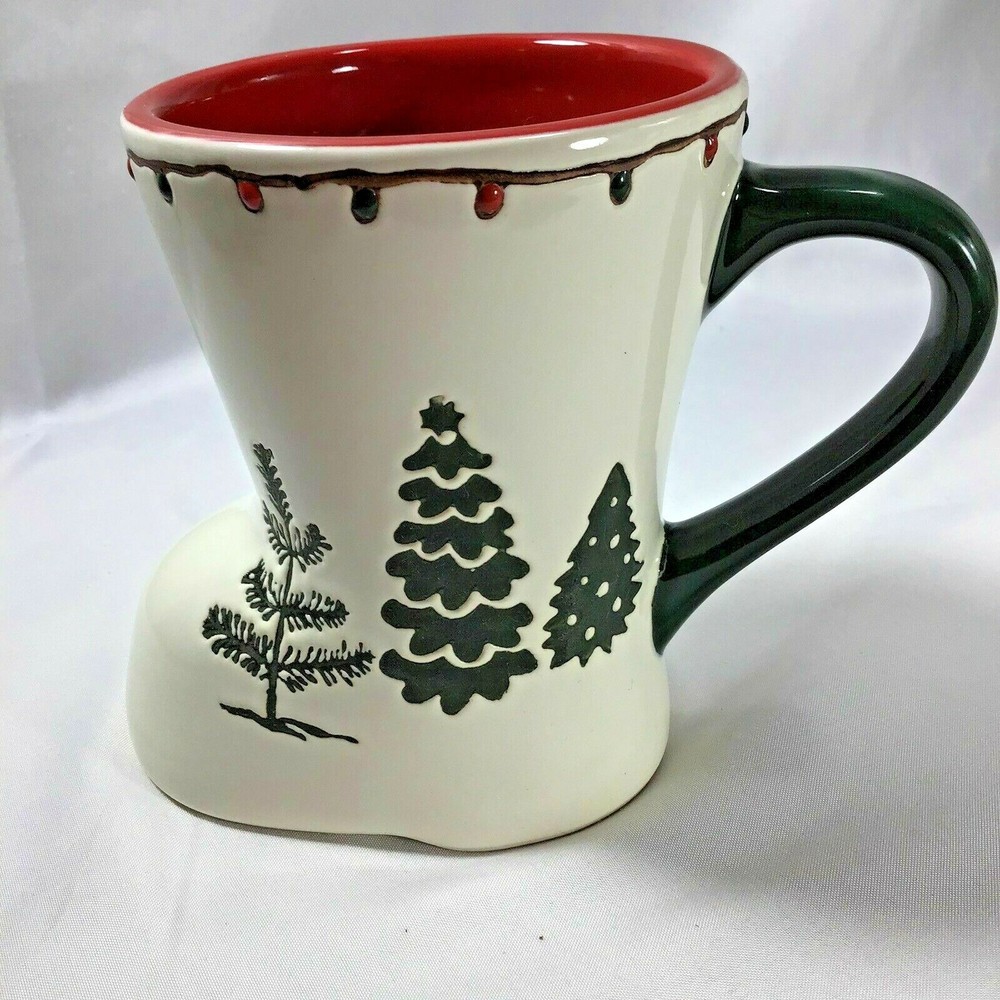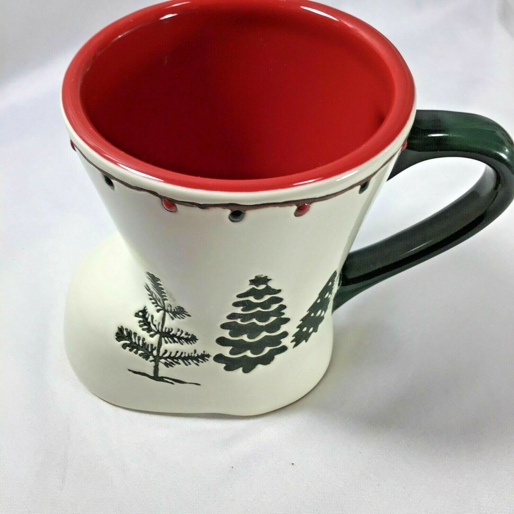 Whimsical Christmas Tree Potter's Studio Boot Shaped Coffee Cup/Mug 3 Different Types of Christmas Trees show on only one side of the mug. The other side is just plain white Top edge has different colors of Christmas lights hung Inside of the boot is bright Red lining No chips No stains Holds 12 ounces of your favorite hot or cold drinks Measures 4 1/2 " tall, 3 1/2 " diam, 4" length boot