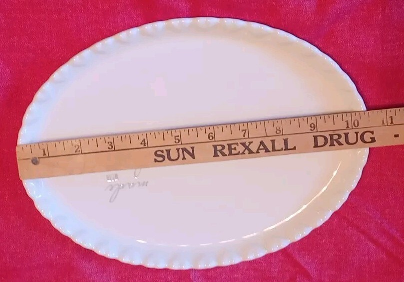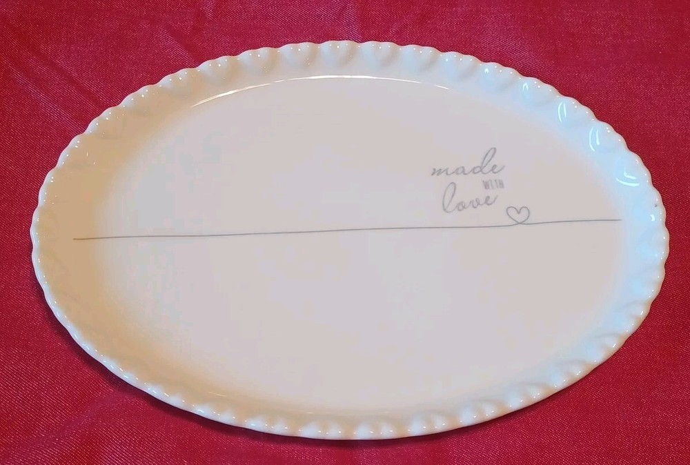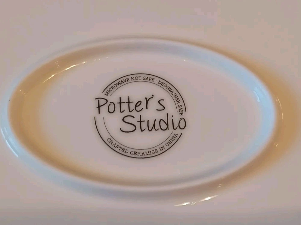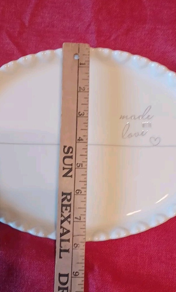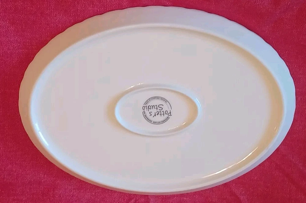 This beautiful Potter's Studio plate is a must-have for any collector. The white ceramic material is carefully crafted with a solid pattern and an oval shape, measuring 10.5 inches in length and 8 inches in width. The heart border adds a touch of love to the piece, making it perfect for all occasions. The plate is made with art pottery production style and pottery technique in China. It has a glossy finish and is printed with a backstamp. The item is not antique, vintage, or handmade. It is a single item and comes from the brand Potter's Studio. This plate is perfect for decorative purposes, such as displaying as a decorative piece for dinnerware and serve ware.