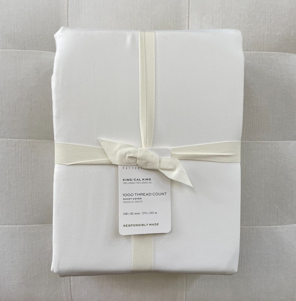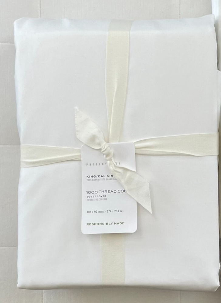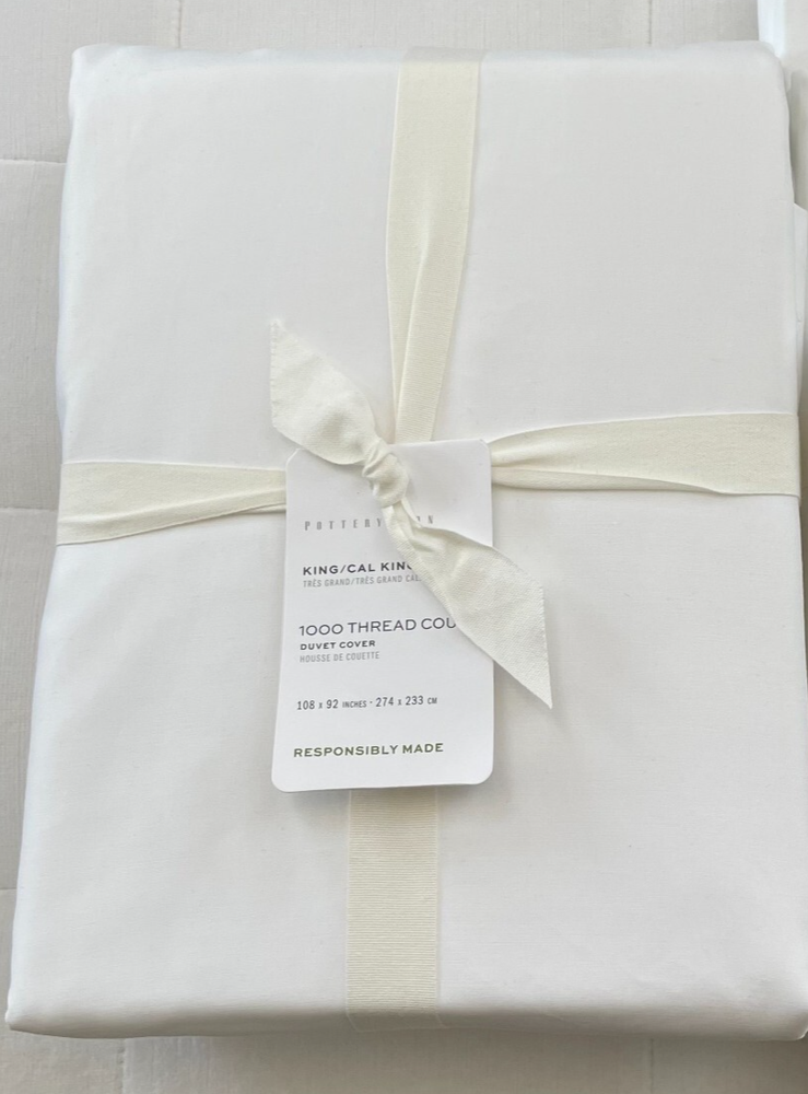 Pottery Barn 1000 THREAD COUNT SATEEN King/California King Duvet Cover ~White New with Tag PB describes as: Our highest thread count to date, the new 1000 Thread Count Cotton bedding is the kind of luxury you never knew you needed. With a generous number of threads per inch, it’s supersoft and silky, and only gets better with time. The fabric is spun of 100% cotton fibers, which are naturally easy to care for, wrinkle resistant and breathable, so you can have sweeter dreams, every night. Material: Made of 100% supima cotton; 1000-thread count. Secure Design: Duvet features a button closure and interior ties to help keep insert (sold separately) in place. Reversible Design: Duvet reverses to the same. Components: Insert sold separately. Certification and Standards: STANDARD 100 by OEKO-TEX® certified. Tested in an independent lab and verified to be safe from over 350 harmful substances. Place of Manufacture: Imported. Machine wash cold; gentle cycle with like colors. Use only non-chlorine bleach if needed. Tumble dry low; remove promptly. Warm iron as needed. King/Cal. King: 92" l x 108" w Pet & Smoke Free Ships within 1 business days Thank you