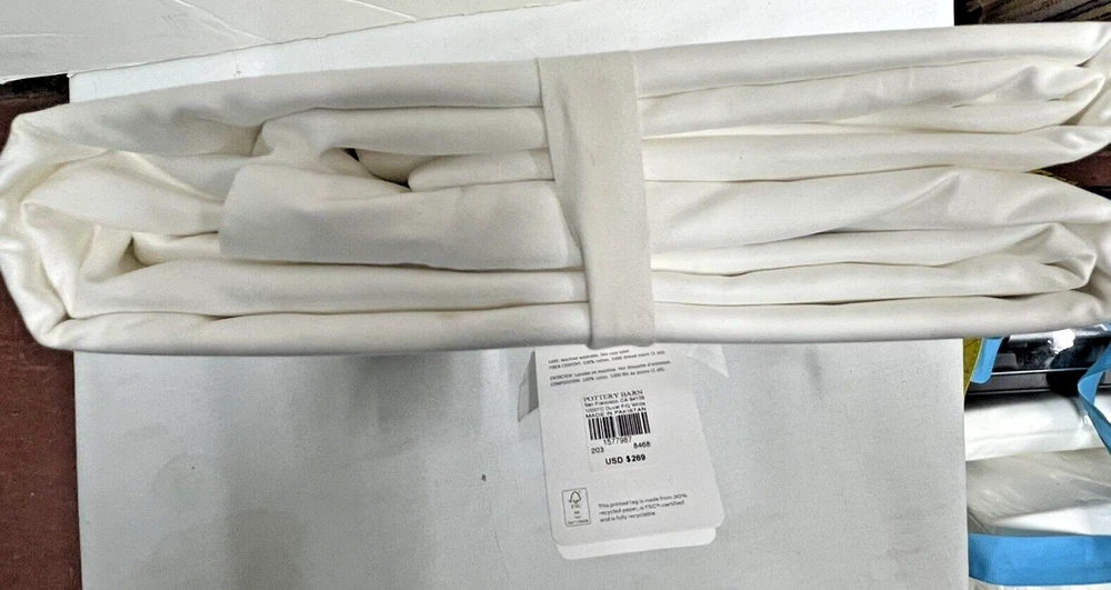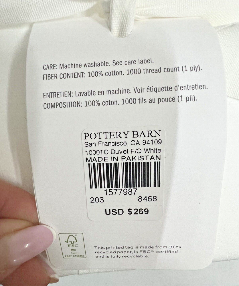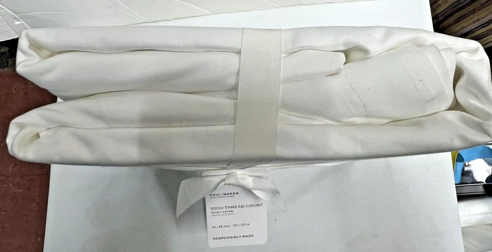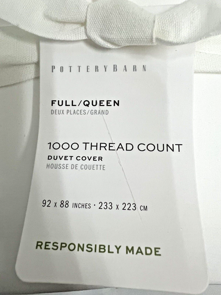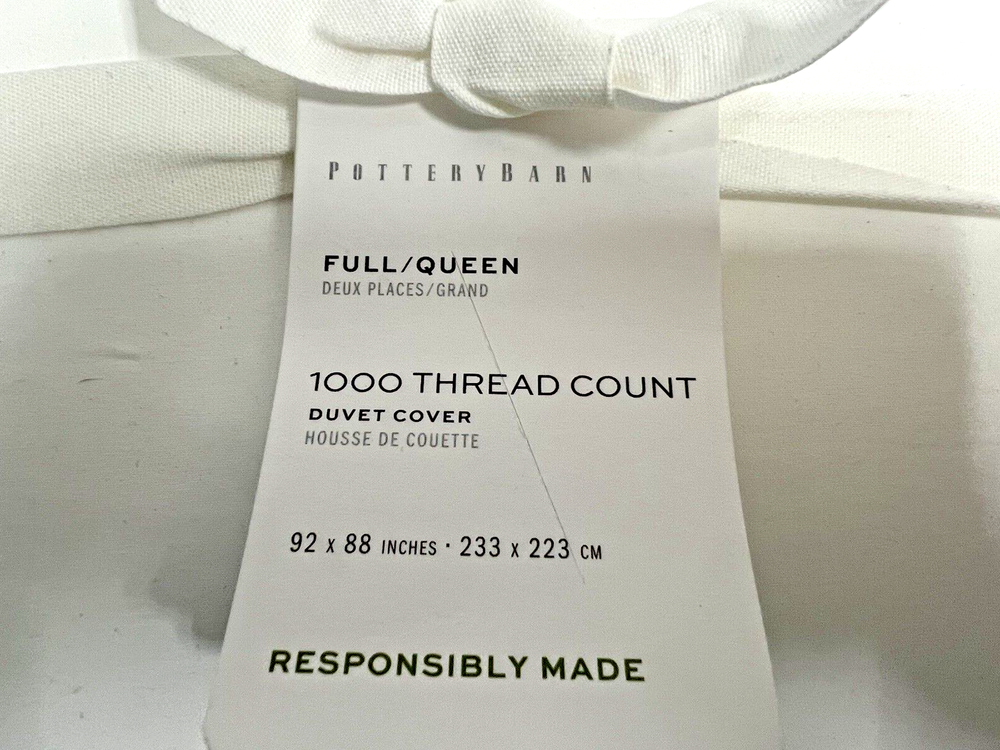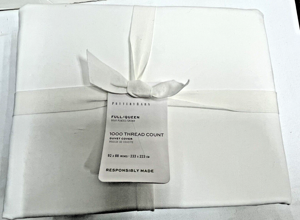 Pottery Barn 1000 THREAD COUNT FULL/ QUEEN DUVET COVER White Full/Queen: 88" l x 92" w Brand New With Tags! retails $269+ Never Been Used! Ready For Immediate Use! SAVE MONEY NOW! Product Details DETAILS Material: Made of 100% supima cotton; 1000-thread count. Secure Design: Duvet features a button closure and interior ties to help keep insert (sold separately) in place; sham features an envelope closure. Reversible Design: Duvet and sham reverses to the same. Components: Duvet cover and insert sold separately. Shams sold individually. Certification and Standards: STANDARD 100 by OEKO-TEX® certified. Tested in an independent lab and verified to be safe from over 350 harmful substances. Place of Manufacture: Imported. CARE INSTRUCTIONS Machine wash cold; gentle cycle with like colors. Use only non-chlorine bleach if needed. Tumble dry low; remove promptly. Warm iron as needed. DIMENSIONS Full/Queen: 88" l x 92" w Product Comes As Pictured (Refer To All Images Above!) Actual Images! FAST Free Shipping! Thank You!