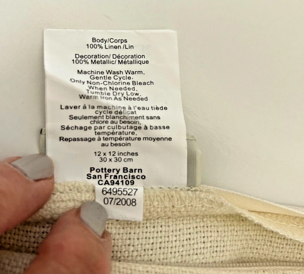Pottery Barn pillow cover/sham 100% linen with 100% silver metallic stitching WISH. 12" square with zipper closure. Pillow not included....