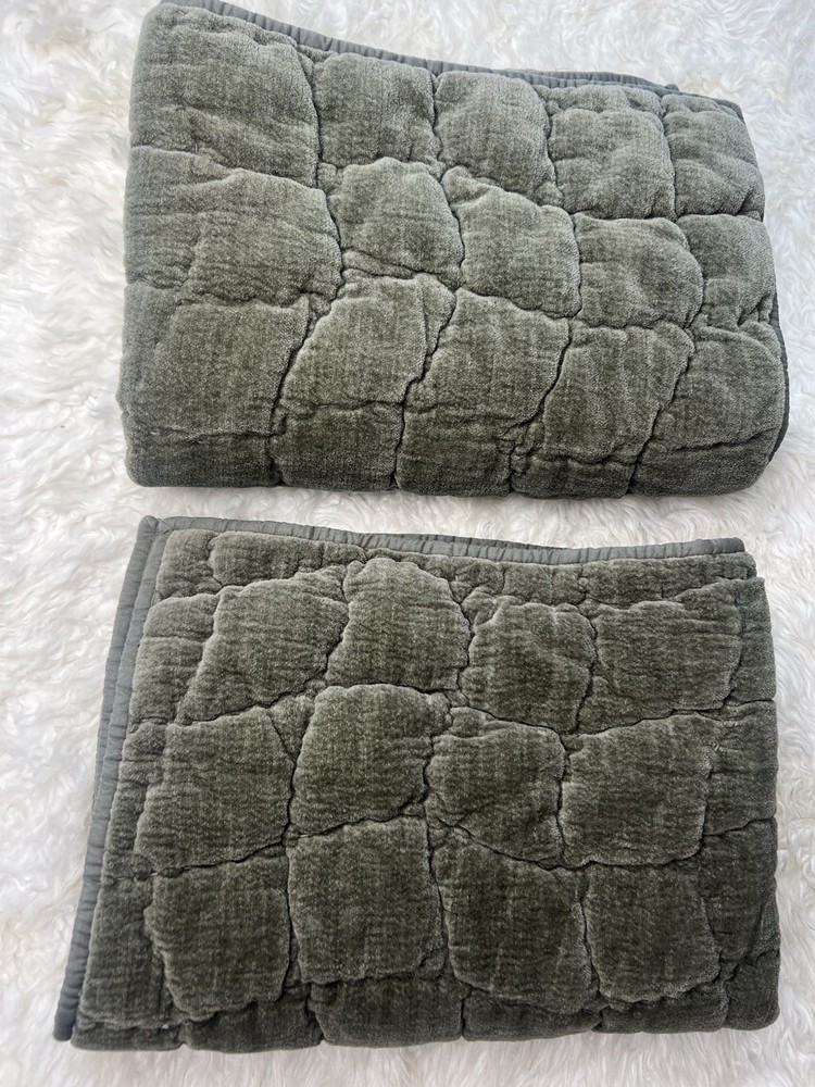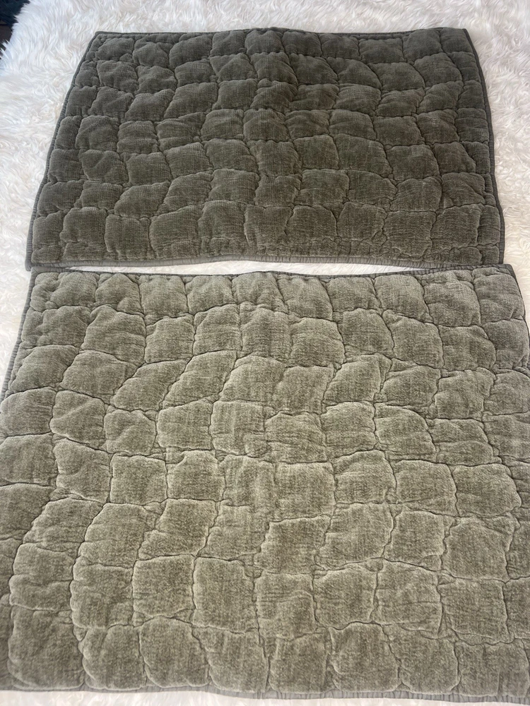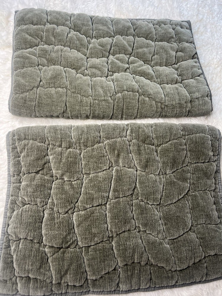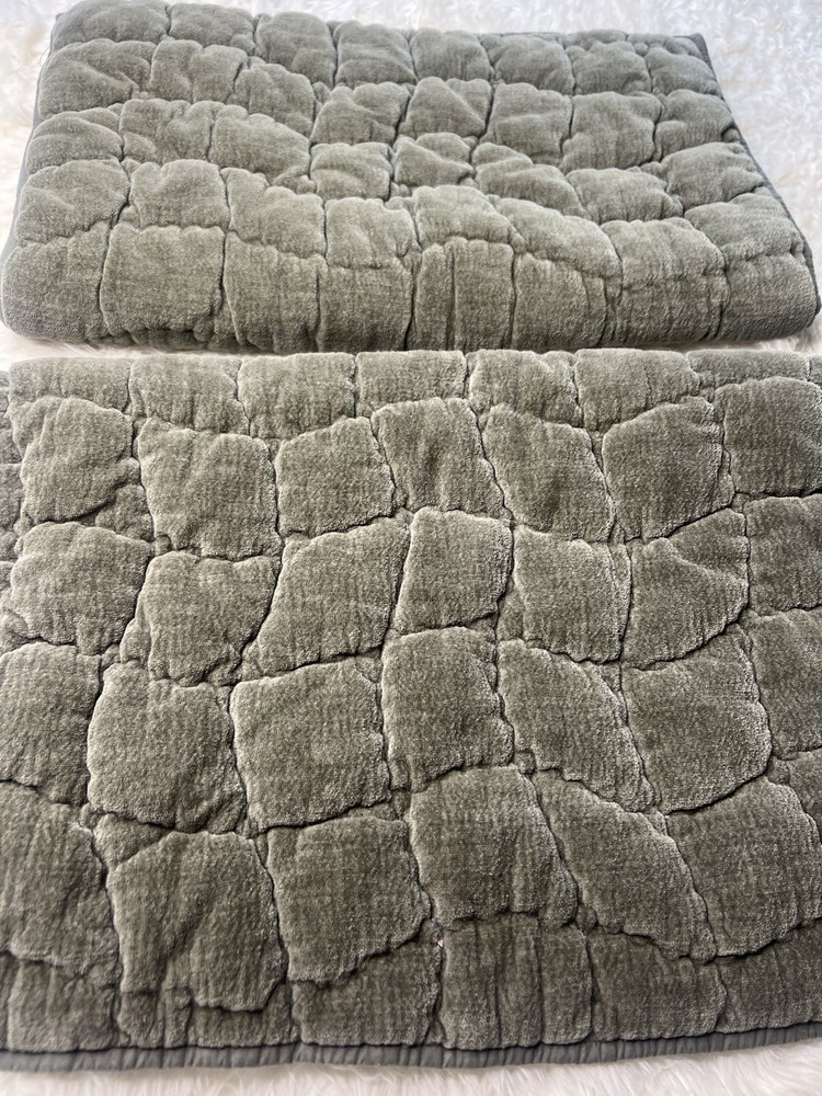 Beautiful Pottery Barn green velvet lattice quilted pillow shams 29” long 21” wide was displayed for a short amount of time in quest room Green colors are the exact same sorry for flash 2 Standard size pillow shams in looks rarely used condition Clean smoke free home We ship everyday