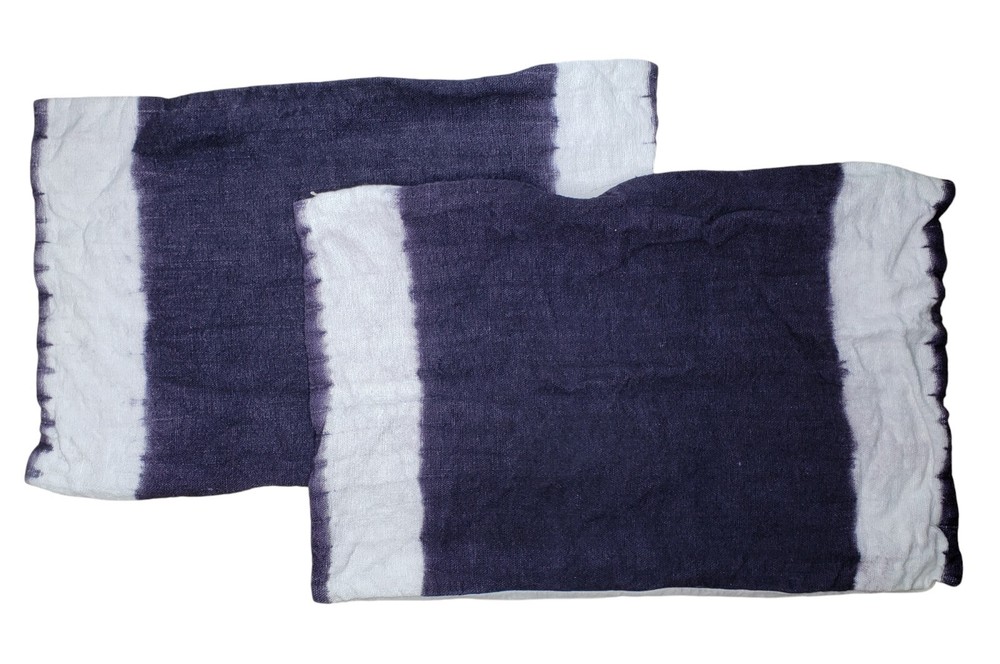 Pair of Pottery Barn pillow covers in good condition. Purple and white tie dyed in 100% linen front, 52% linen, 48% cotton back. Zip closure, measures approx 16" x 25".