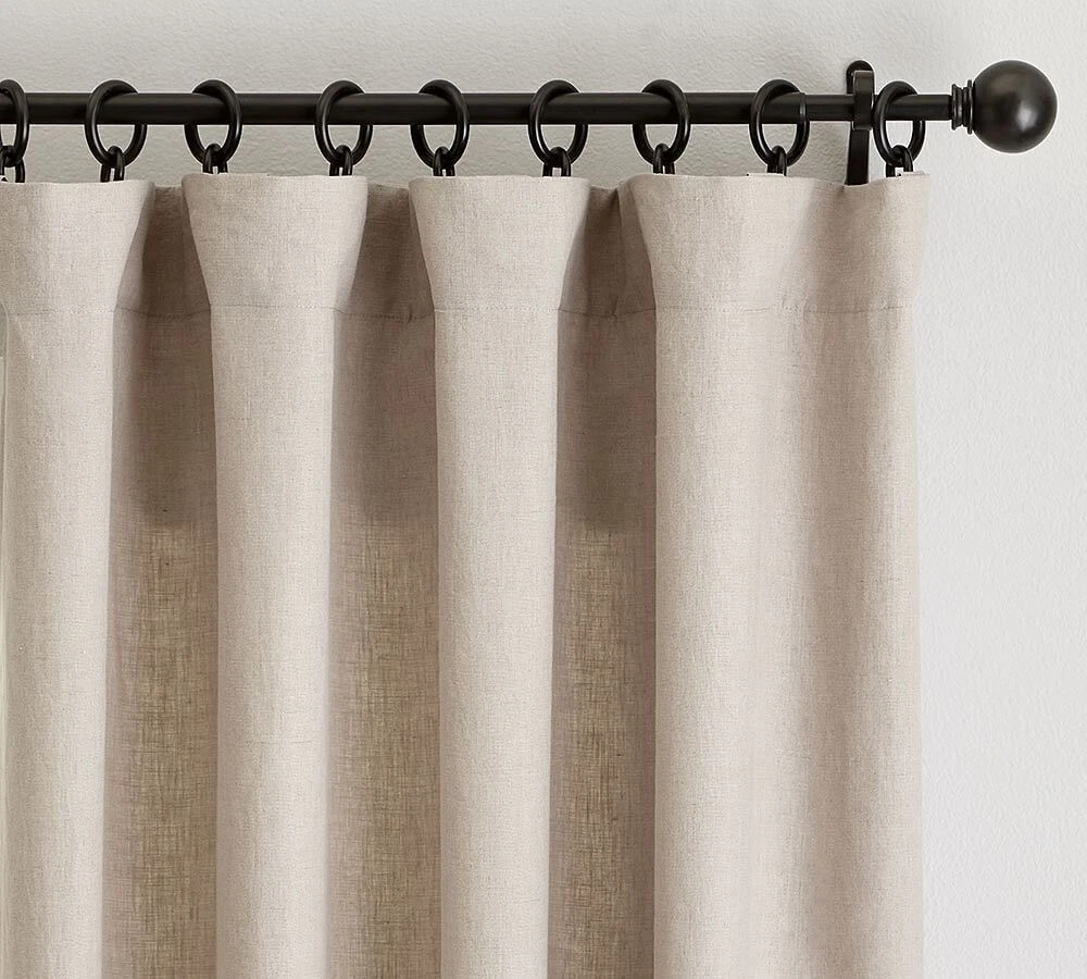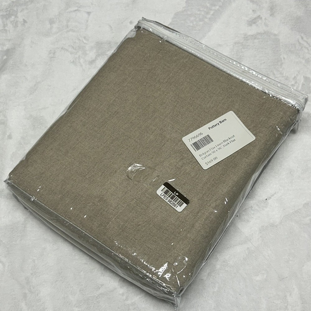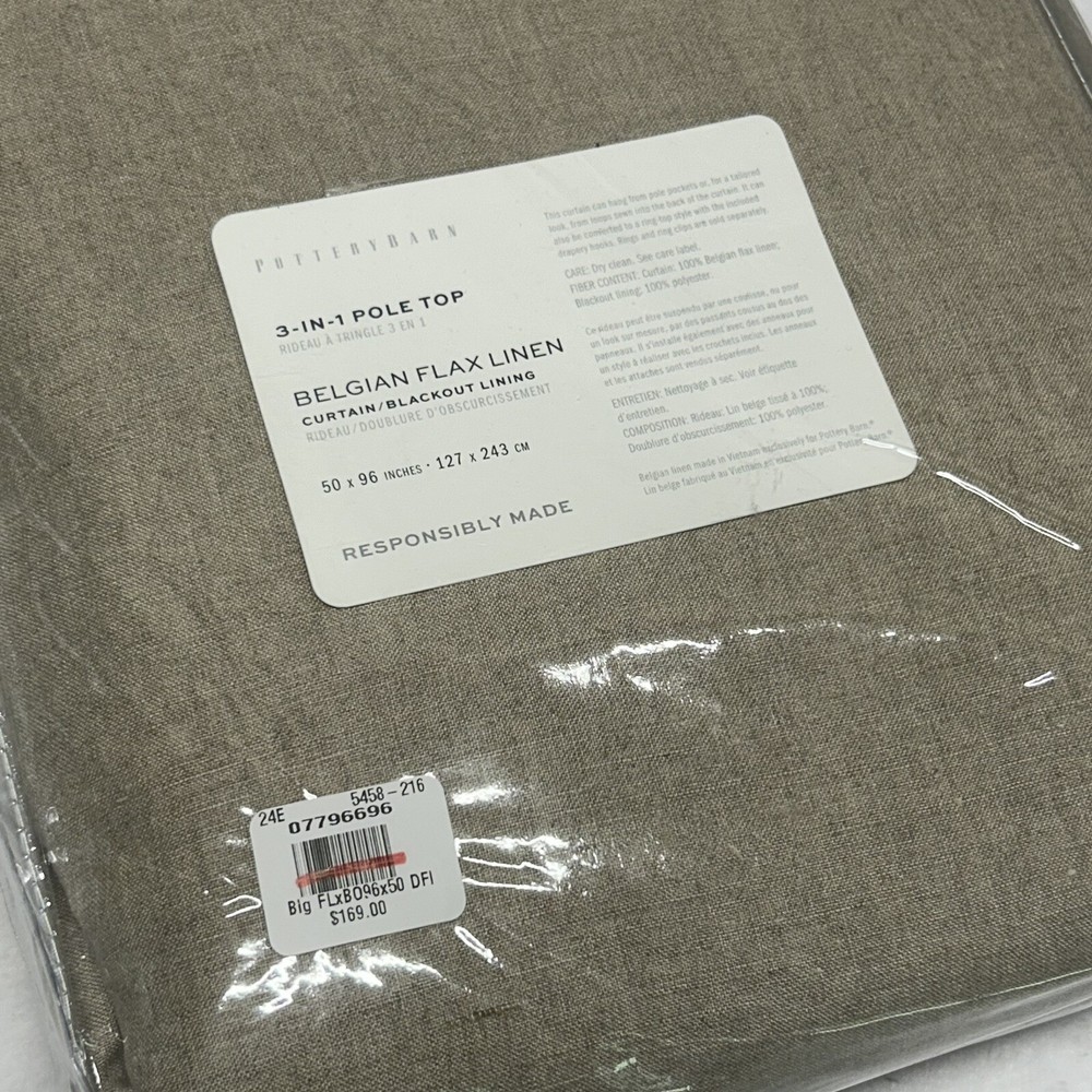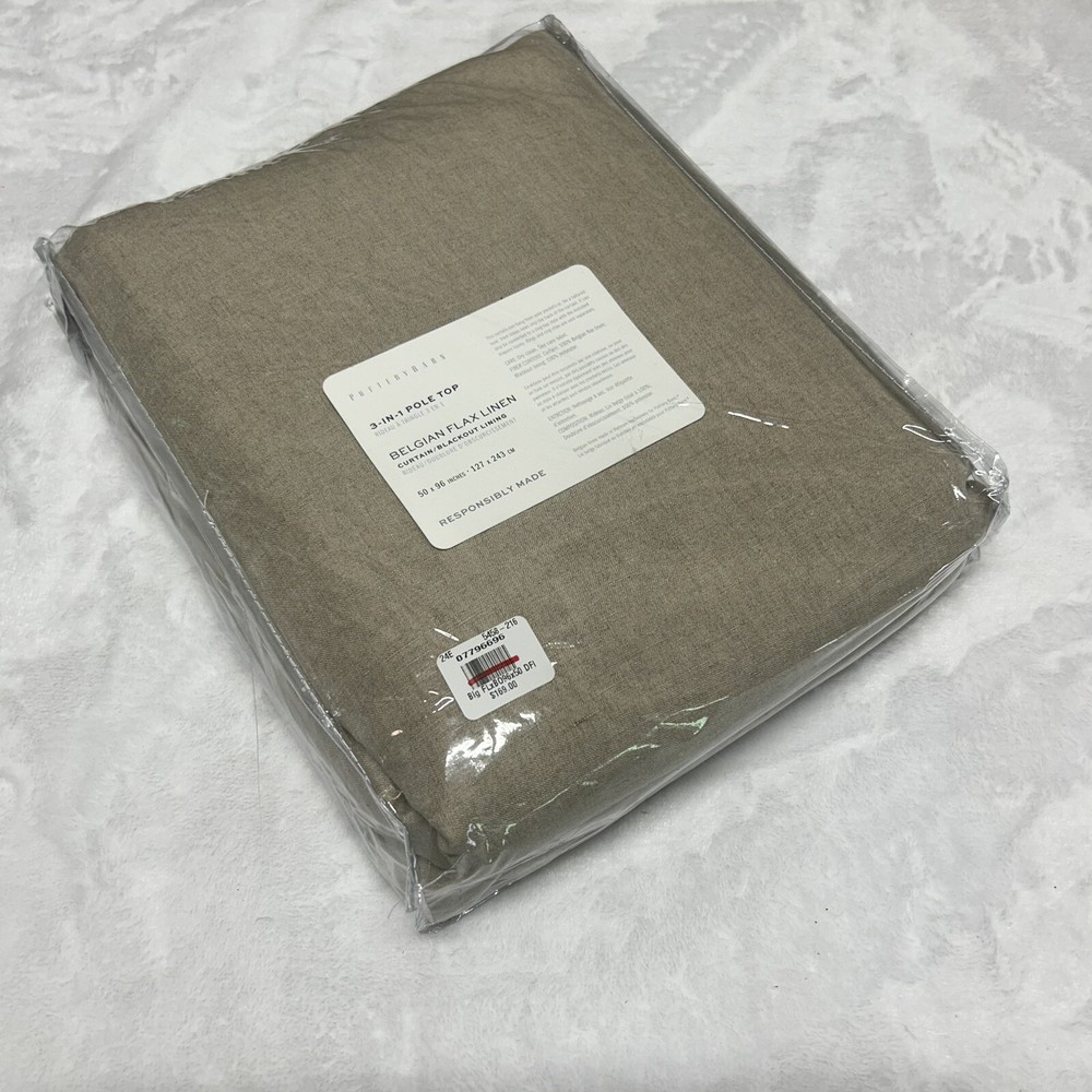 Pottery Barn 3 in 1 Pole Top Belgian Dark Flax Linen Curtain Blackout Lining Brand new with tag! NWT Measures 50" W x 96" L This listing is for 1 panel Made of 58% Polyester and 42% Cotton. Light-filtering liner: Crafted from 100% cotton, it lets daylight shine through. Our curtain’s 3-in-1 construction offers three hanging options: pole pocket, hanging loops, ring top. Detailed with blind-stitched hems. 50" wide panels have a visible seam where the panels are sewn together. Every additional 50" will add a visible seam. Length includes height of rod pocket.