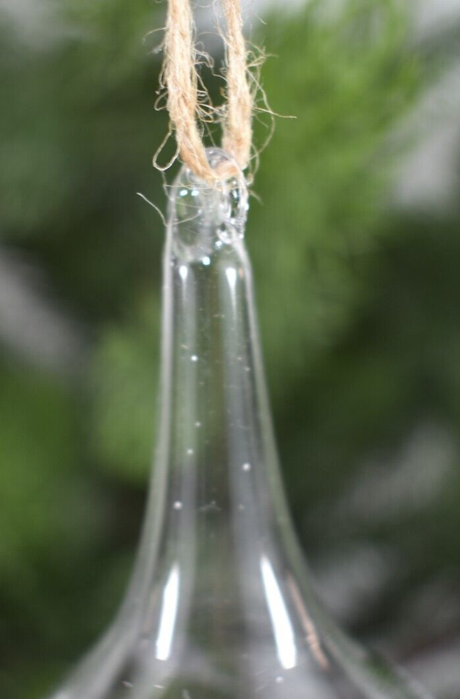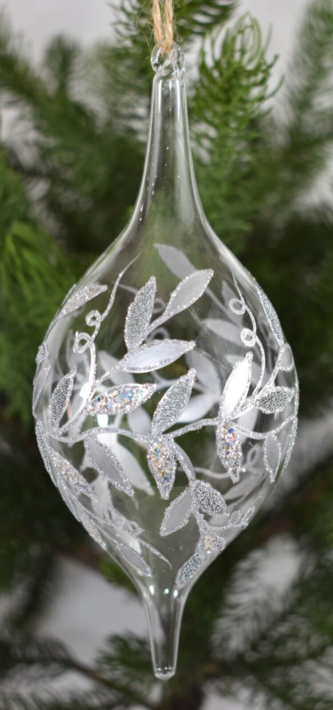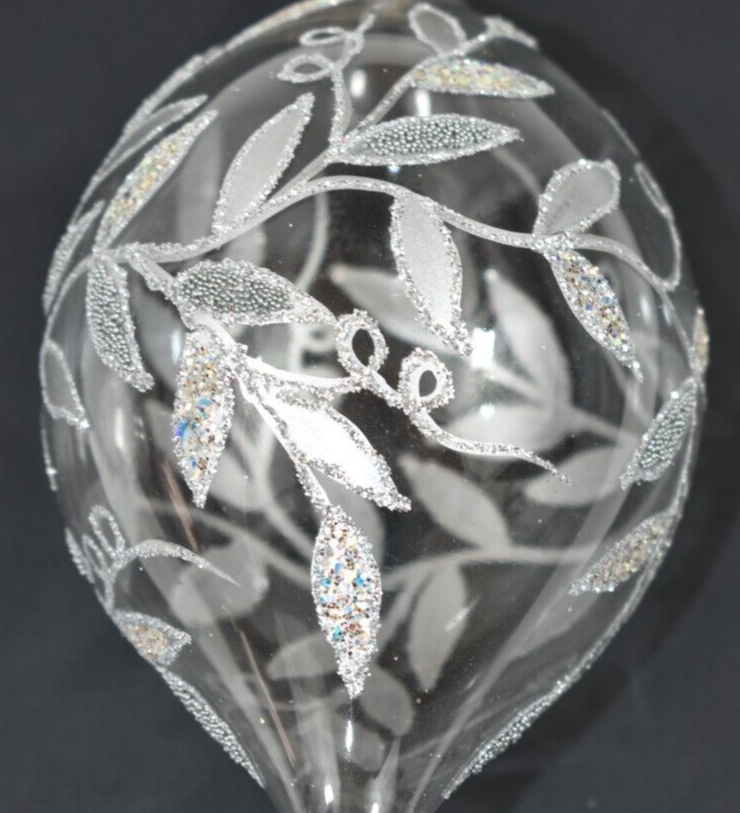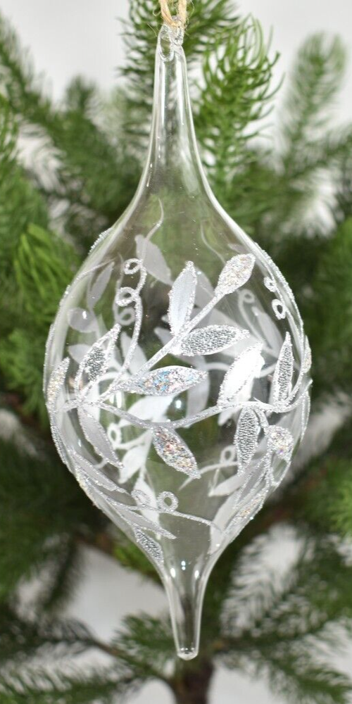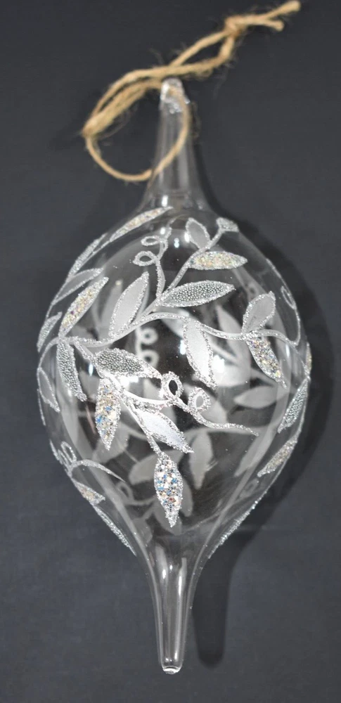 This listing is for a fantastic Pottery Barn 7.5" Clear Blown Glass Silver Glitter Beads Christmas Tree Ornament! Ornament is clear with a silver leaf or vine design with glitter and tiny bead embellishments! This ornament is no longer available from Pottery Barn and is VERY RARE and hard-to-find! There are no Pottery Barn tags or labels, this item was used once for a Pottery Barn Christmas Tree Photo shoot. Condition: Very good, clean, very gently used condition. Please see all photos and entire Description section for any additional information. Ornament has a jute loop for hanging on a tree. Size: Approximately 7.5" long (from bottom tip to top of glass hanging loop x 3" wide (at widest point). Color: Clear glass with Silver decoration. Buyer pays $5.90 shipping. Thanks so much!
