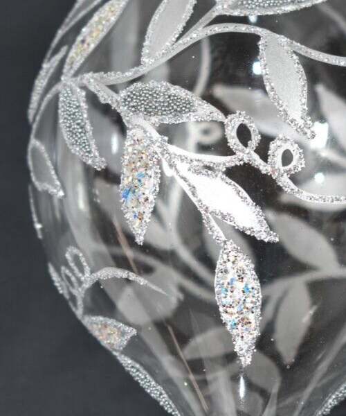 Absolutely love this gorgeous ornament! The clear glass with delicate silver vine details and sparkling glitter adds such elegant shimmer to my tree. The tiny beads give it extra charm—it truly stands out. Even though it’s gently used, it looks flawless and feels so premium. So happy to have found this rare piece—it’s a stunning addition to my holiday decor!