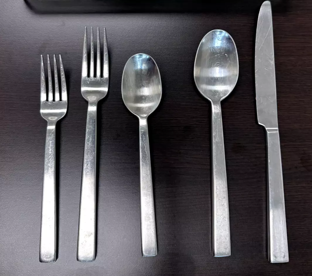 This listing is for a single, used piece of Pottery Barn Atlas stainless steel flatware that was made in China. Pricing is by the piece, and please use the drop down menu to select choice(s) for purchase. Dinner Fork - 7-7/8" Salad Fork - 7" Knife, round tip - 9-3/4" Soup Spoon - 8" Teaspoon - 7" Above measurements are approximate. Every piece in this listing is used, and it should be expected that the item will show evidence of use/wear including scratches, scuffs, and other wear patterns typical of regular use. All items will be in a condition suitable for use as originally intended.