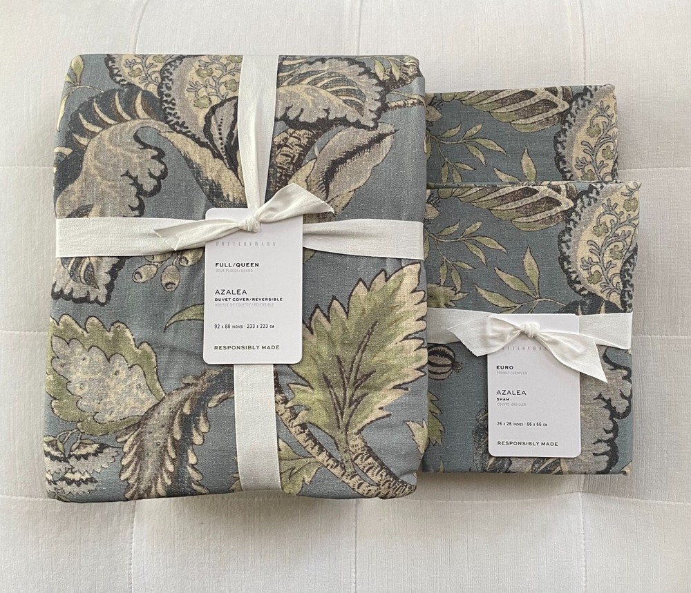 Pottery Barn Azalea Palempore Duvet Cover Full/Queen & Two Euro Shams New with Tag PB describes as: A classic palempore-inspired pattern finds a new sense of tranquility in soothing shades of chambray. Crafted of cotton with a touch of linen, the traditional motif is highlighted with embroidered accents that bring subtle definition to the design. Material: Front is woven from 85% cotton and 15% linen. Back is woven from 100% cotton sheeting. Secure Design: Duvet features a hidden button closure with inner ties that keep insert in place; sham features an envelope closure. Components: Iinserts sold separately. Certification and Standards: Made in a Fair Trade Certified™ factory, empowering workers who made it. OEKO-TEX® STANDARD 100 certified, tested for 1000+ harmful substances (14.HUS.42449 HOHENSTEIN HTTI). By choosing our cotton products, you’re supporting our investment in Better Cotton’s mission. This product is sourced via mass balance and therefore may not contain Better Cotton. Place of Manufacture: Imported. Linen will get softer with every wash. Machine wash in warm water separately on gentle cycle. Use only non-chlorine bleach, if needed. Line or tumble dry on a low temperature. Full/Queen Duvet: 88" l x 92" w Euro Sham: 26" sq. Pet & Smoke free Ships within 1 business day. Thank you