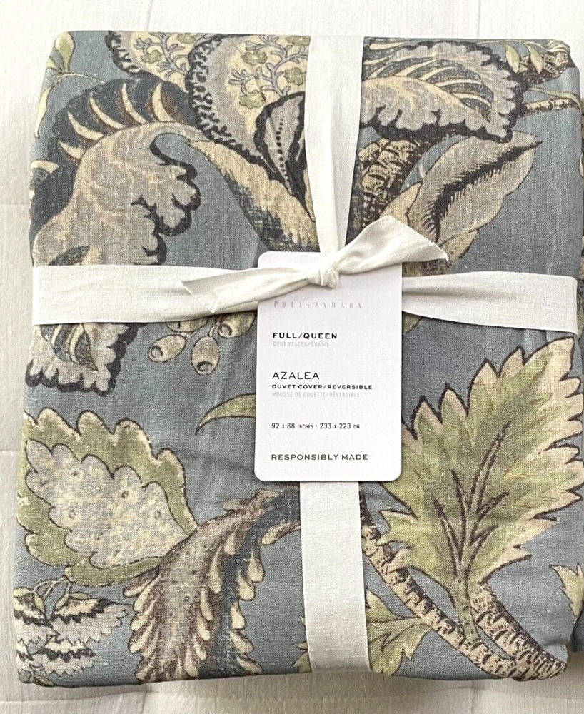 Pottery Barn Azalea Palempore Full/Queen Duvet Cover New with Tag PB describes as: A classic palempore-inspired pattern finds a new sense of tranquility in soothing shades of chambray. Crafted of cotton with a touch of linen, the traditional motif is highlighted with embroidered accents that bring subtle definition to the design. Material: Front is woven from 85% cotton and 15% linen. Back is woven from 100% cotton sheeting. Secure Design: Duvet features a hidden button closure with inner ties that keep insert in place. Components: Inserts sold separately. Certification and Standards: Made in a Fair Trade Certified™ factory, empowering workers who made it. OEKO-TEX® STANDARD 100 certified, tested for 1000+ harmful substances (14.HUS.42449 HOHENSTEIN HTTI). By choosing our cotton products, you’re supporting our investment in Better Cotton’s mission. This product is sourced via mass balance and therefore may not contain Better Cotton. Place of Manufacture: Imported. Linen will get softer with every wash. Machine wash in warm water separately on gentle cycle. Use only non-chlorine bleach, if needed. Line or tumble dry on a low temperature. Full/Queen Duvet: 88" l x 92" w Pet & Smoke free Ships within 1 business day. Thank you