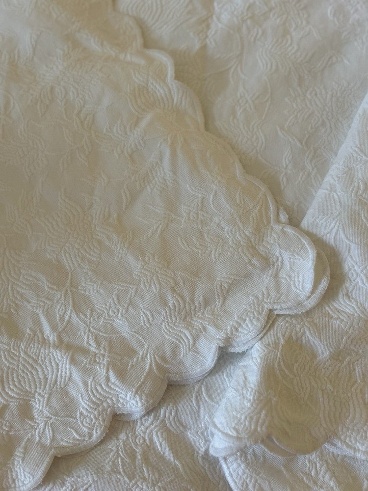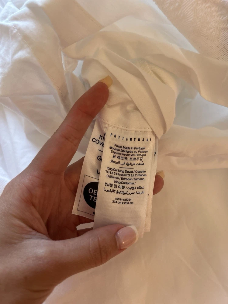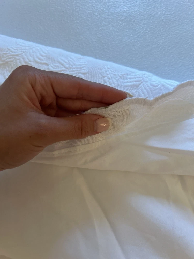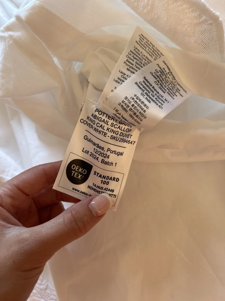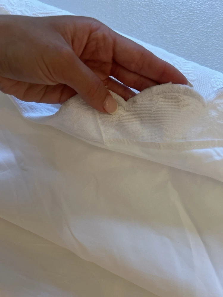 Pottery Barn Abigail Scalloped Textured KING/CAL. KING Duvet Cover NWOT OB READ New without tags / Open box - Size king/cal. king - There was some scuff on the duvet cover that I treated. Pictures 2,3,4 show the spot where the scuff was. It is barely noticeable. There are also two scuffs near the edge of the duvet cover that were not treated, please reference all photos! - In the color white - Scalloped - Duvet cover only