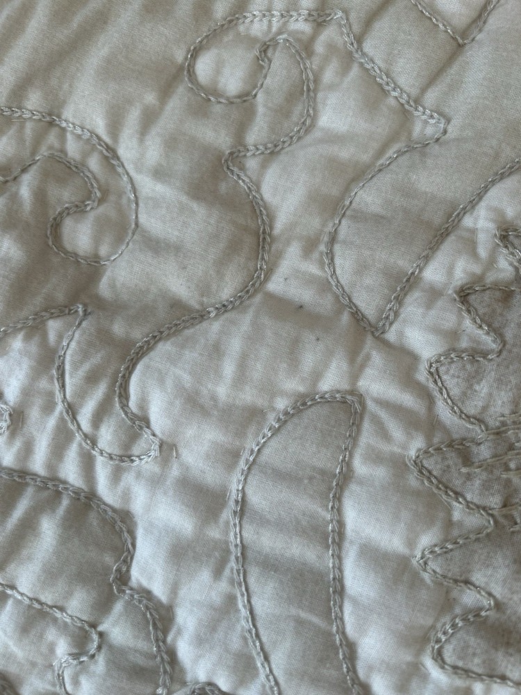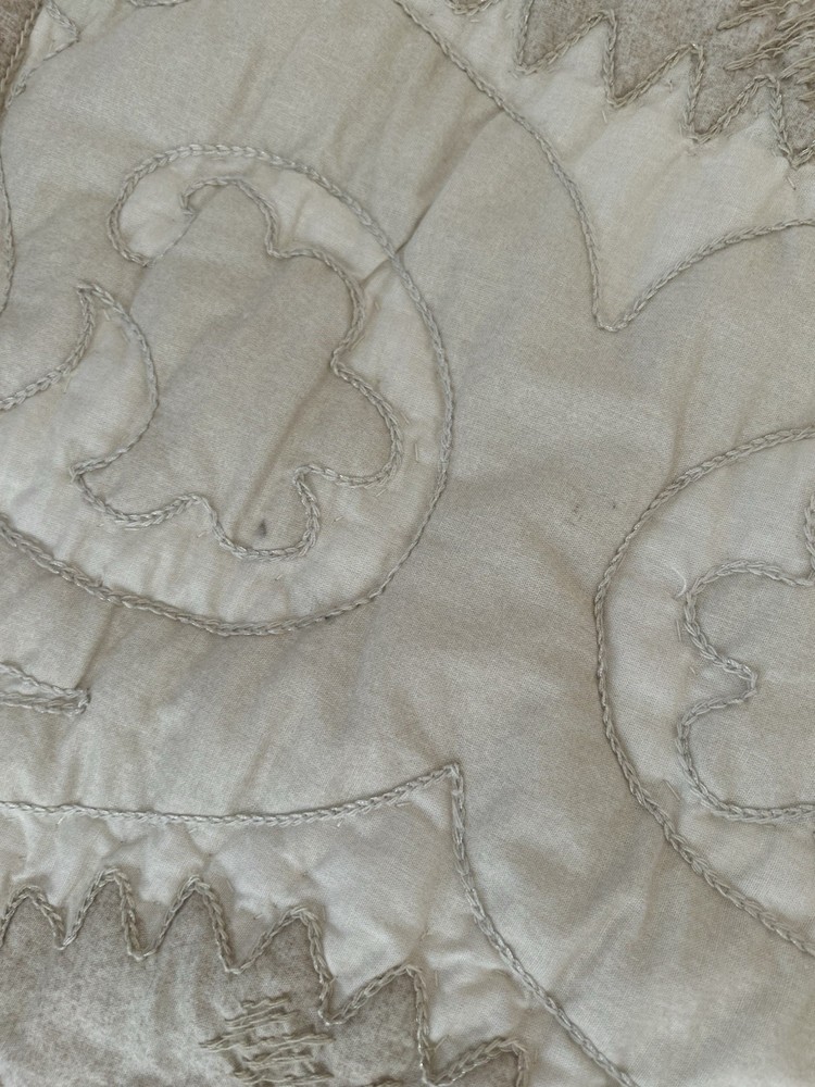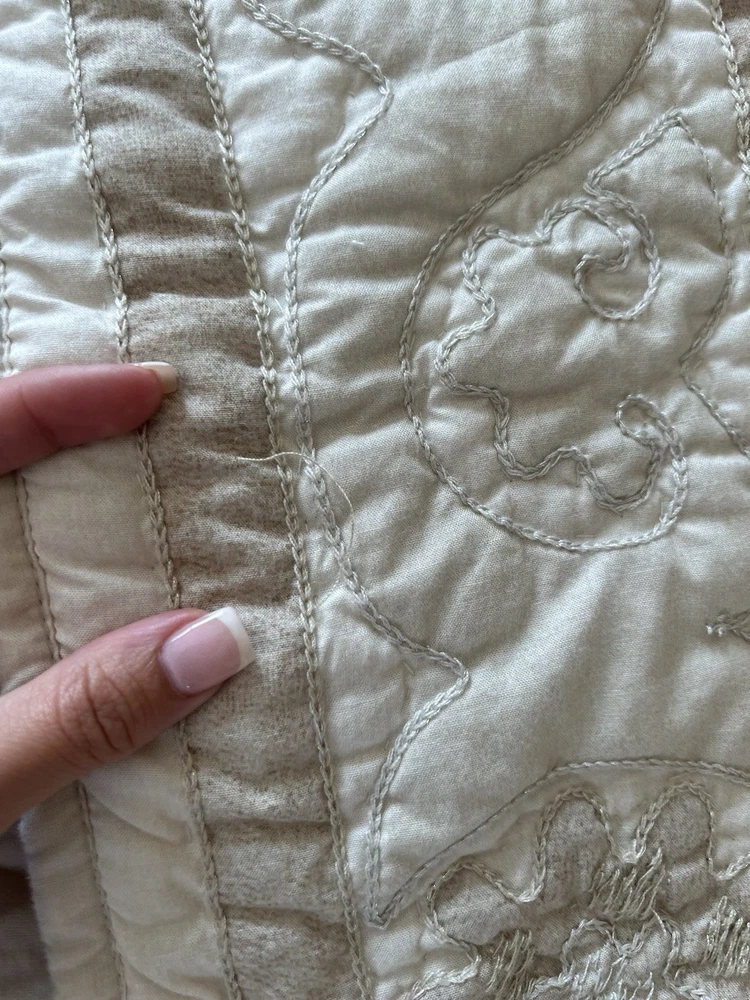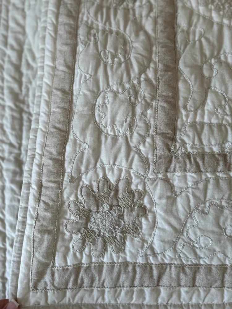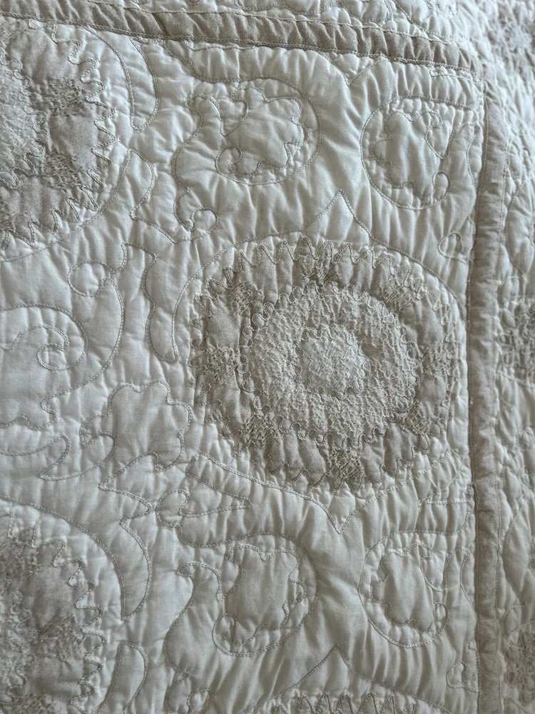 Pottery Barn Alanya Suzani Embroidered KING/CAL. KING Quilt PRE-OWNED READ Pre-owned, no tears/holes - There are some spots on the quilt as well as loose threads in the embroidery throughout the quilt. Please reference all photos - Size king/cal. king