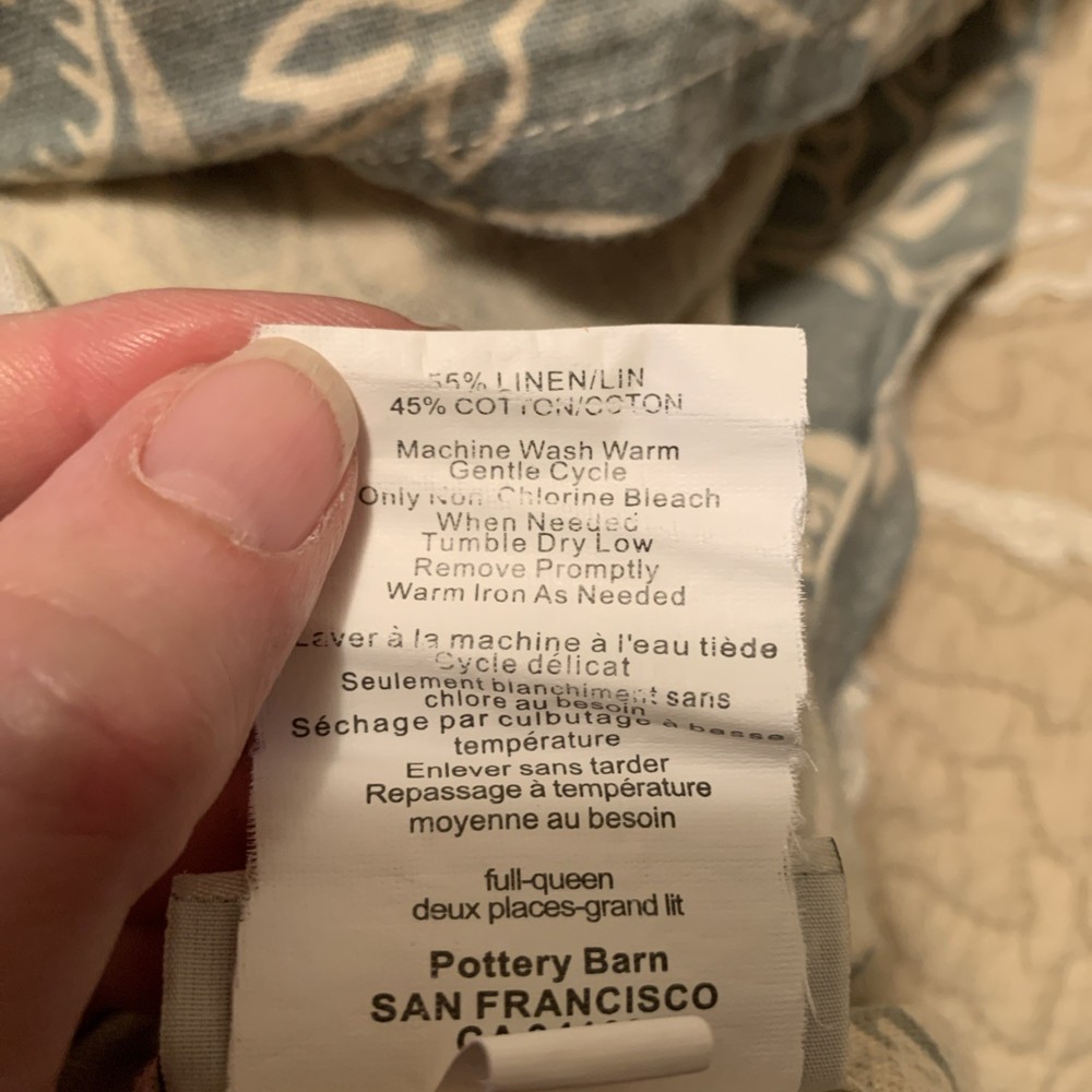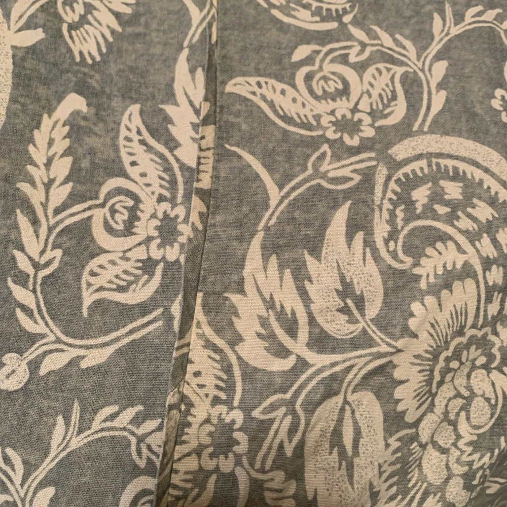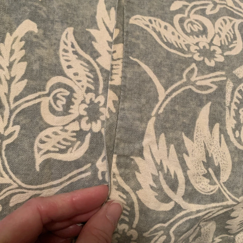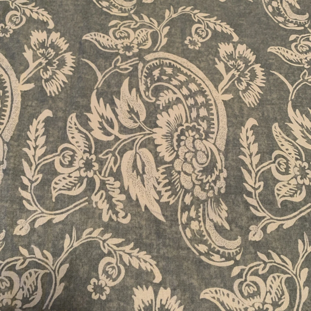 Found at a humane society resale store. This is really nice linen blend. 1 tiny worn area, (not a hole) at very corner. Also, I will say there is more fade to one side. The color is difficult for me. I think it’s sage green and have showed 2 family members who agree with this.