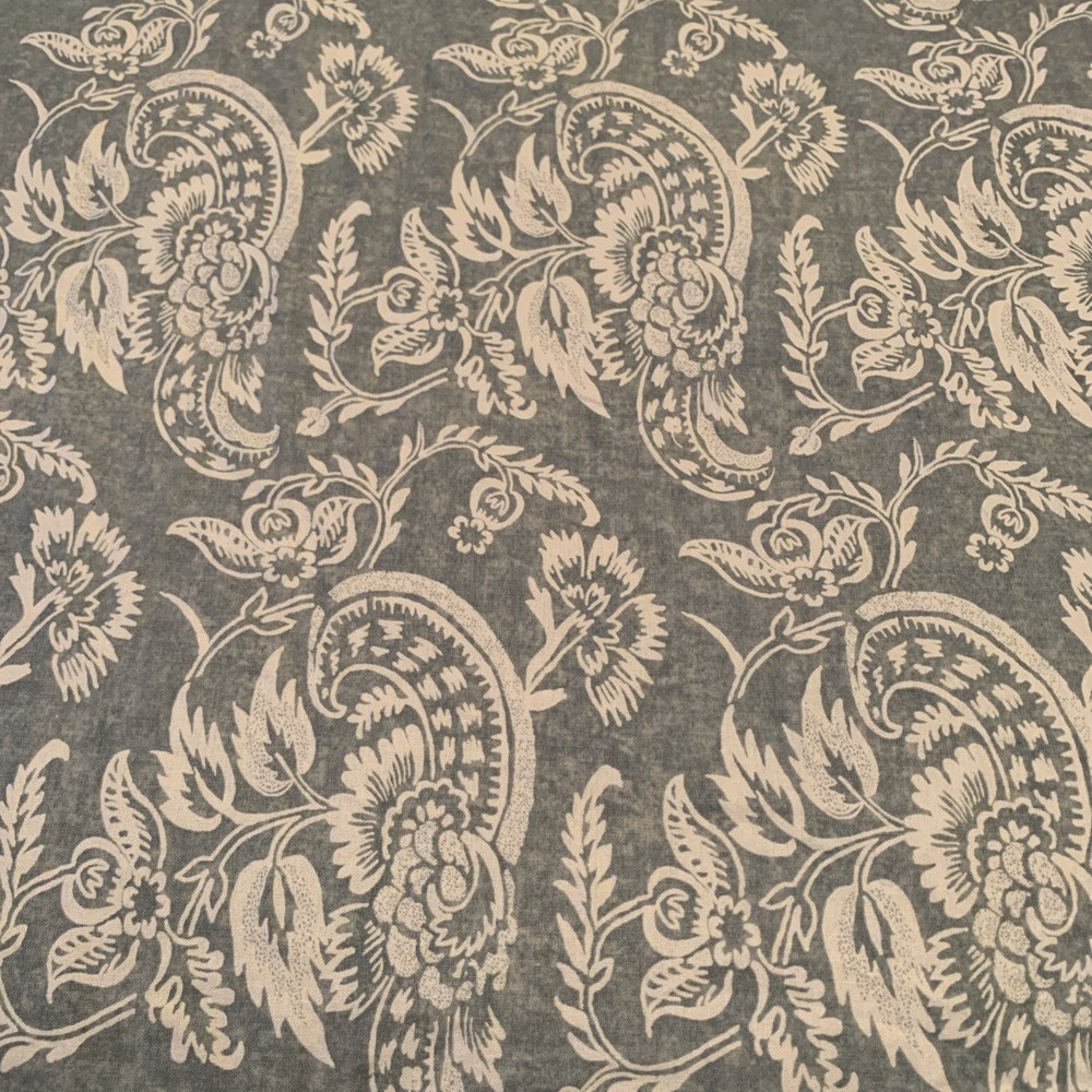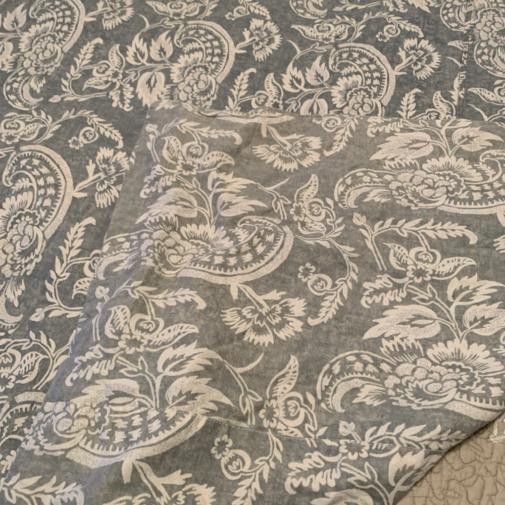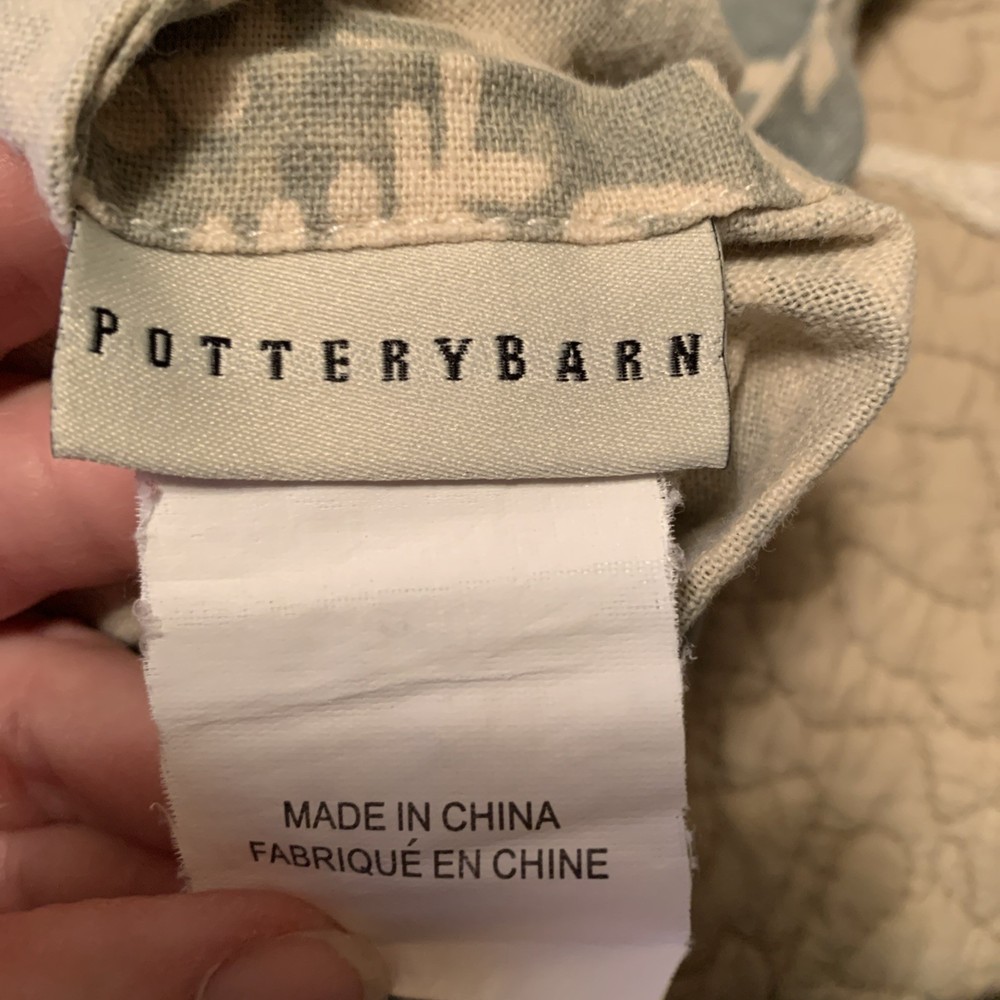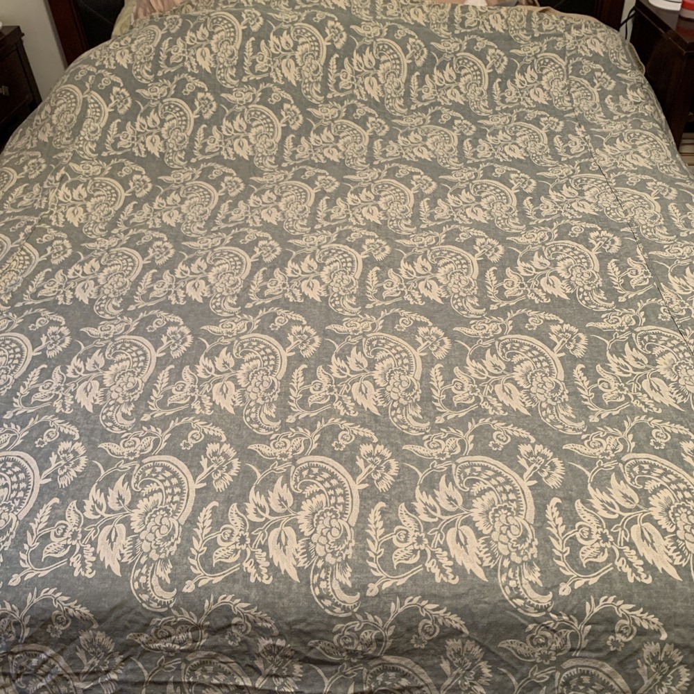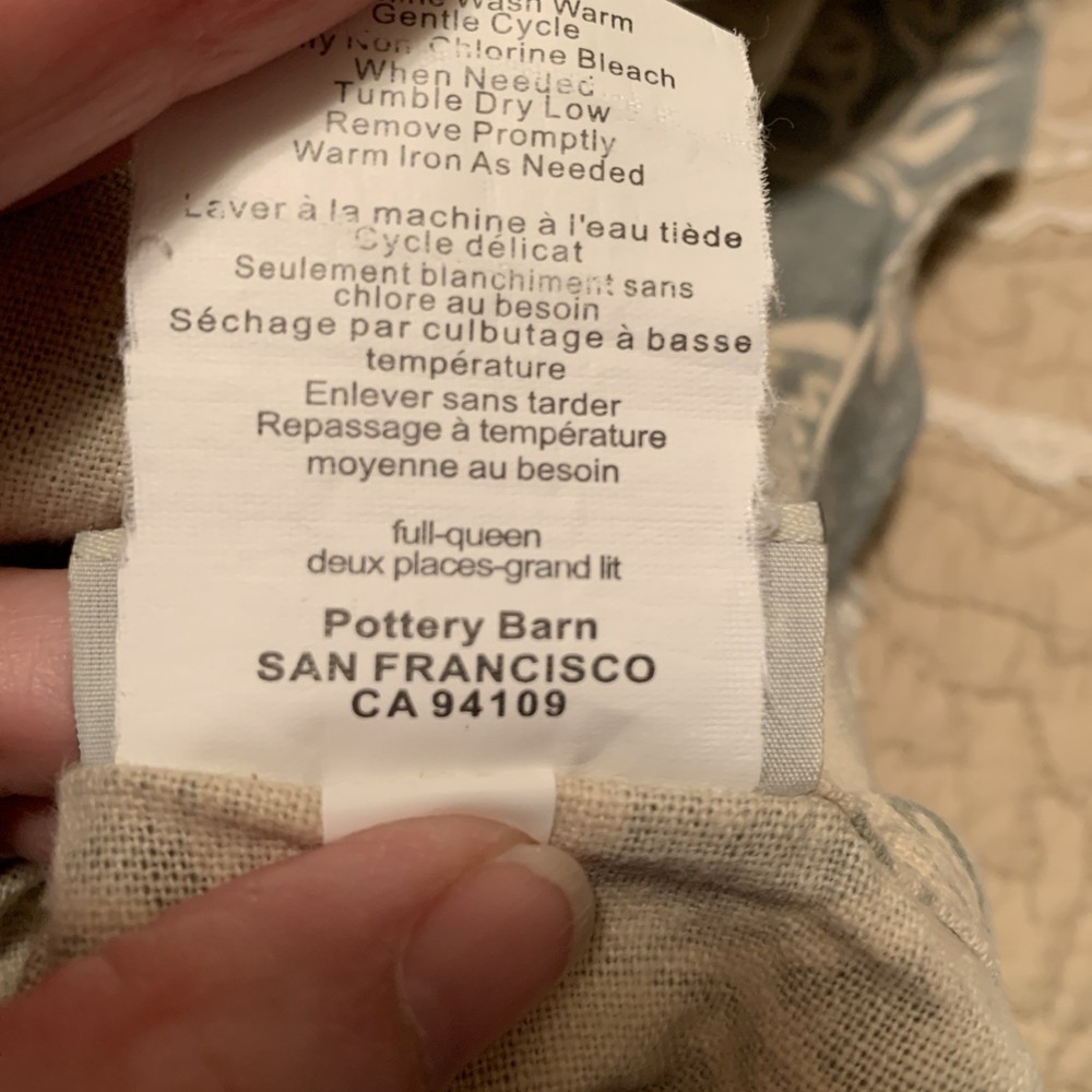 Found at a humane society resale store. This is really nice linen blend. 1 tiny worn area, (not a hole) at very corner. Also, I will say there is more fade to one side. The color is difficult for me. I think it’s sage green and have showed 2 family members who agree with this.