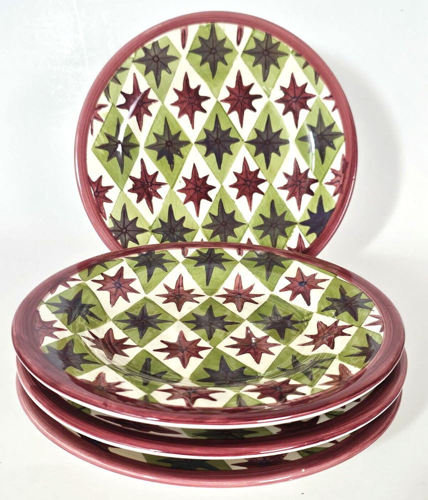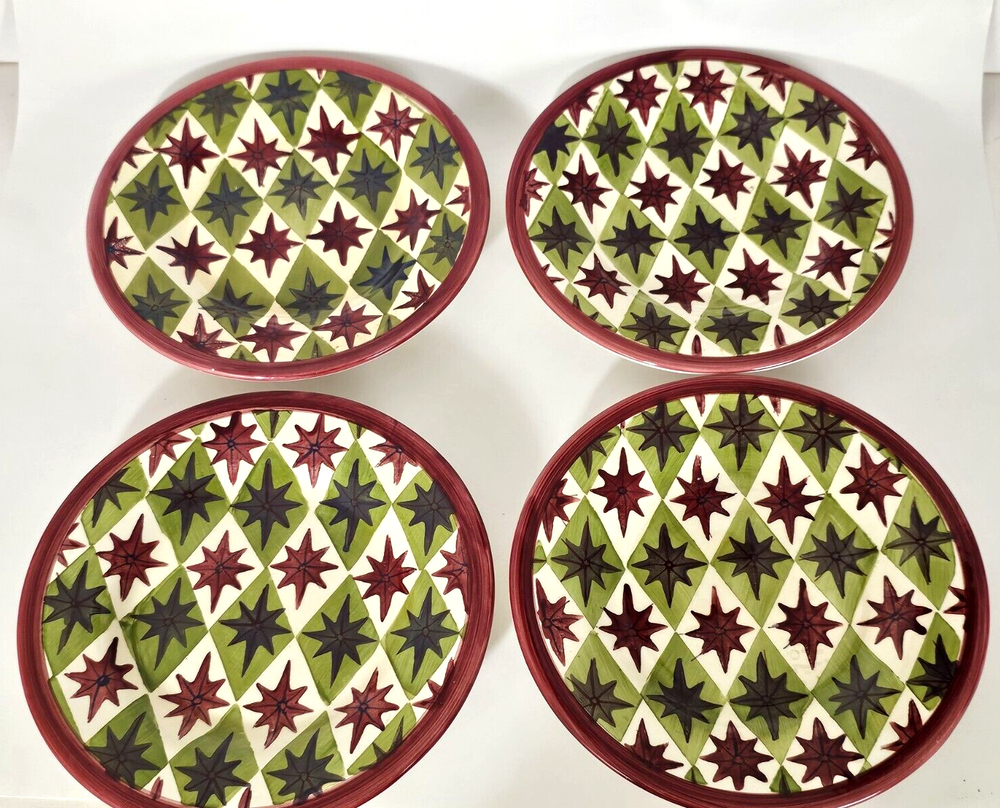 Pottery Barn Allegra Salad Plates 8.5" Set of 4 Burgundy & Green Stars & Burgundy Trim. READ: One plate has a chip on back rim where stamp is, Please see photos...