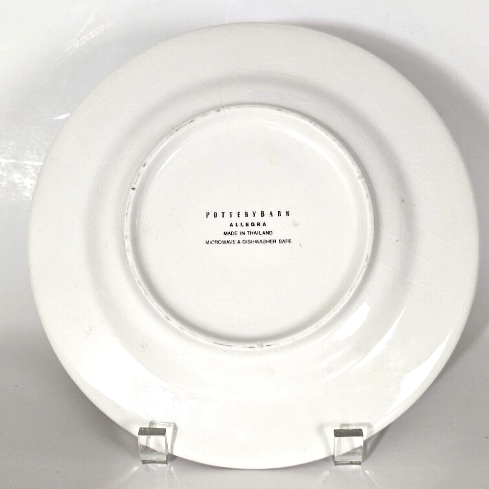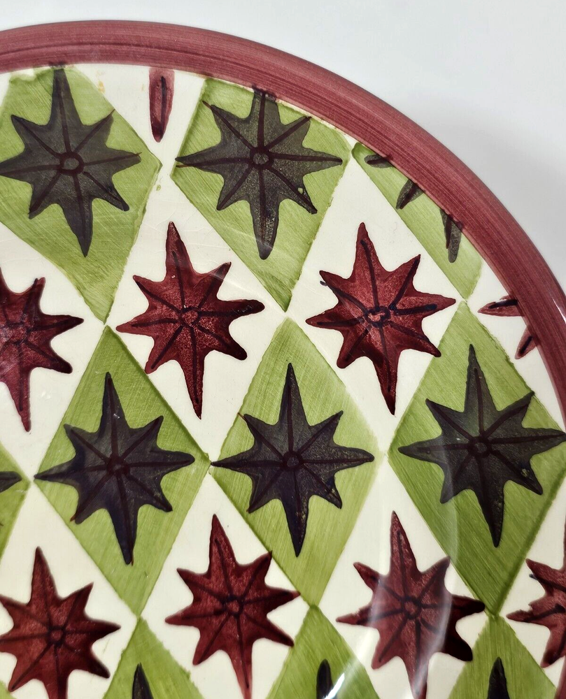 Pottery Barn Allegra Salad Plates 8.5" Set of 4 Burgundy & Green Stars & Burgundy Trim. READ: One plate has a chip on back rim where stamp is, Please see photos