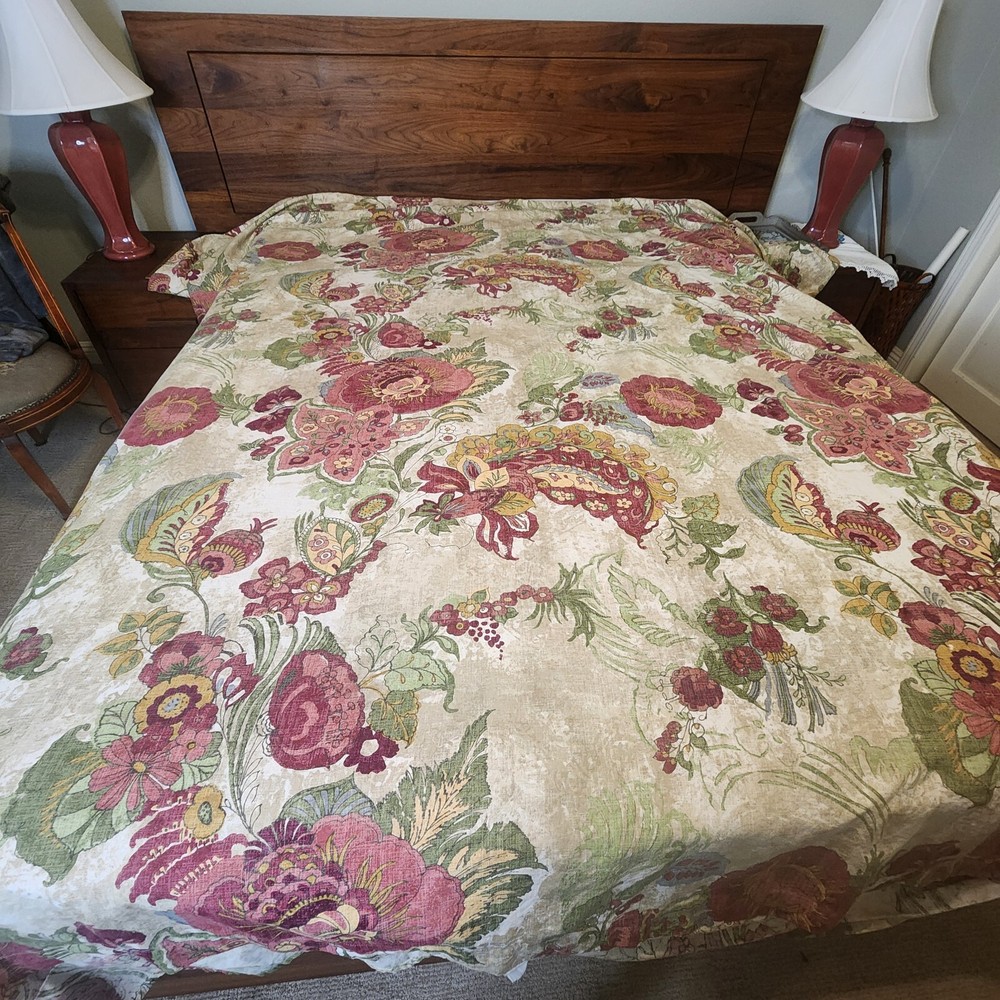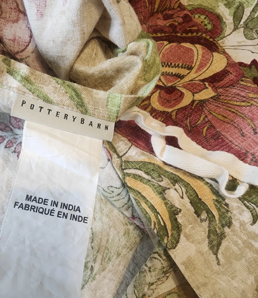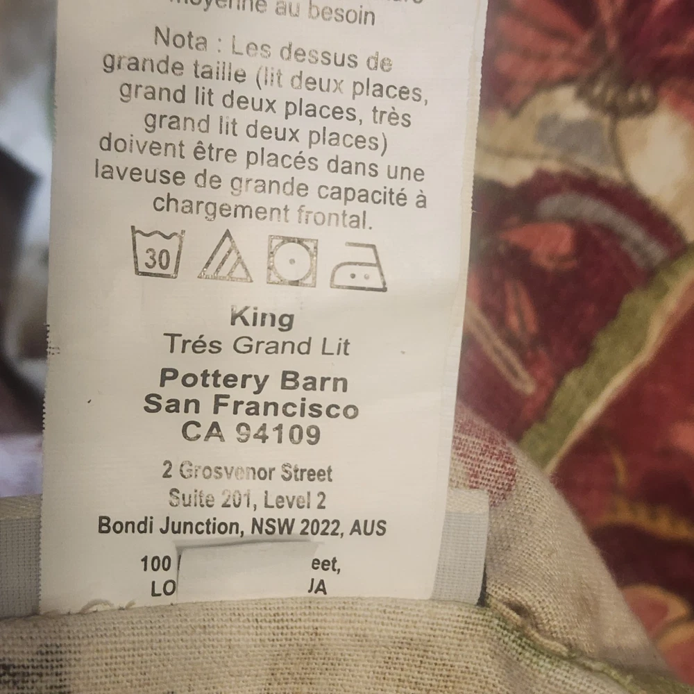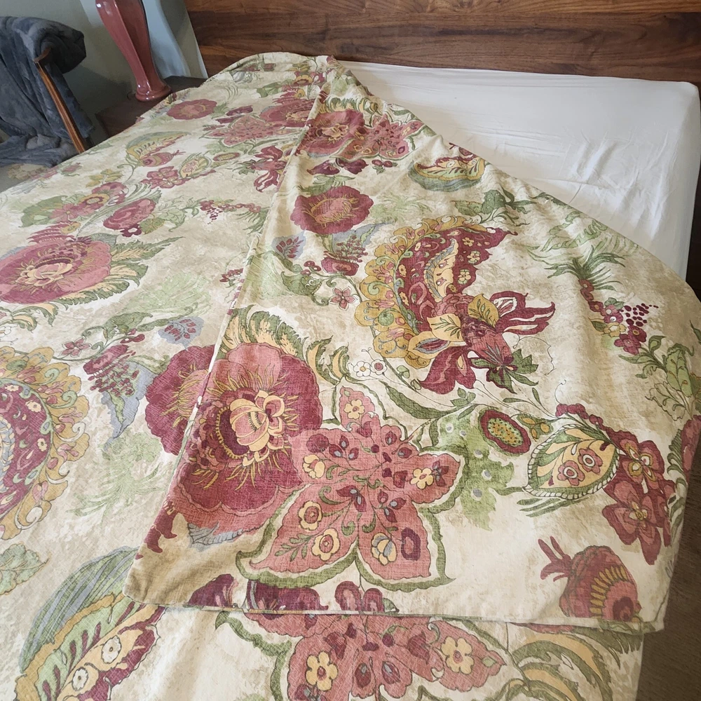 Pottery Barn Amaya Palampore King Size Duvet Cover Linen Cotton Burgundy Floral Reverses to same print. Inside ties, button closure. Shown on queen size bed, is swallowed up - king size - 108" wide x 92" long.
