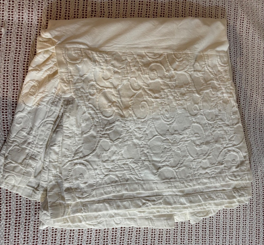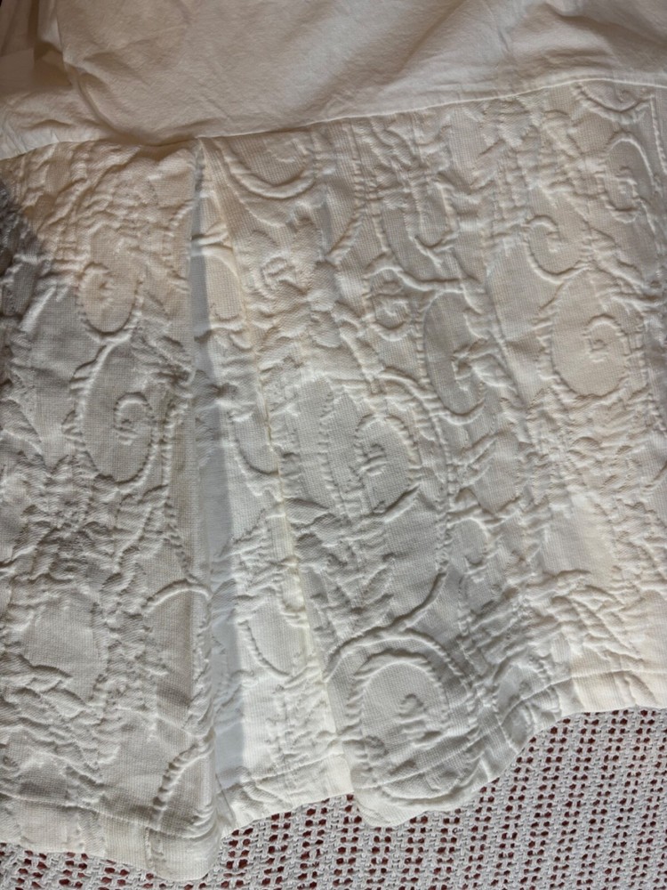 Elevate your bedroom with the Pottery Barn Ambrosia Matelasse Cotton Bedskirt. Designed for a king-sized bed, this luxurious white bedskirt features a timeless solid color pattern and a sophisticated 14-inch drop length, providing a clean and modern look. The matelassé fabric adds a subtle texture that enhances its elegance. Crafted with care in Portugal, this machine-washable bedskirt is easy to care for and fits seamlessly into a busy lifestyle. The rectangle shape measures 80 inches in length and 76 inches in width, ensuring a perfect fit for your king bed. The floral theme adds a touch of nature-inspired charm, making it an ideal choice for those who appreciate a blend of simplicity and beauty in their decor.