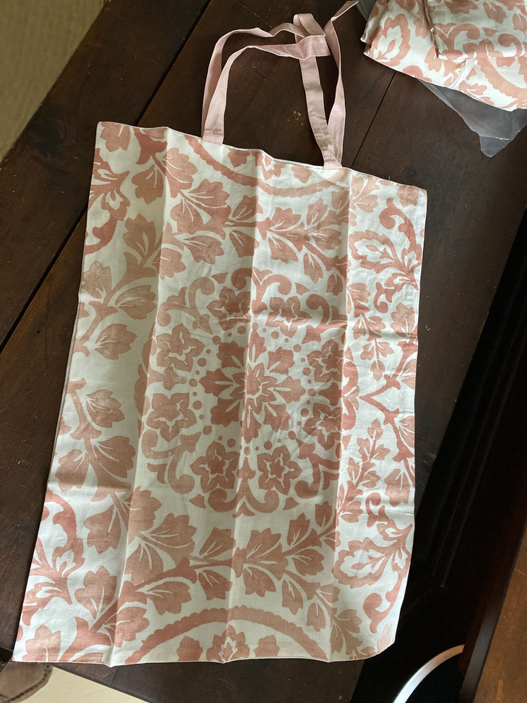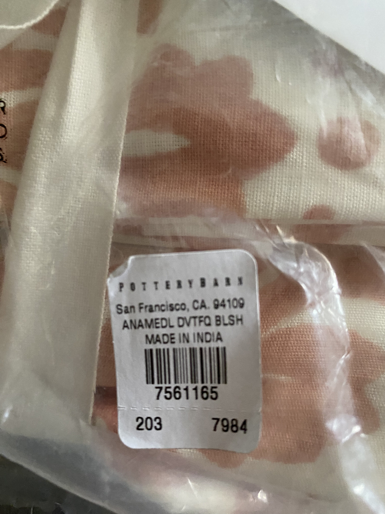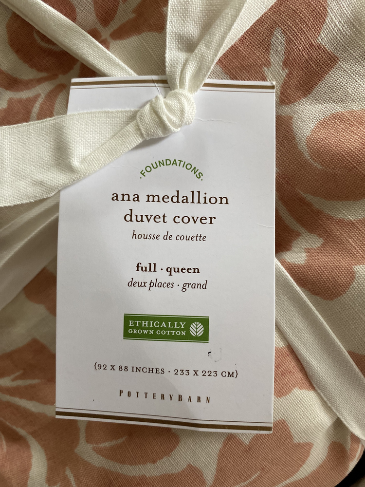 Pottery Barn Ana Medallion full/queen duvet cover and 2 standard shams. 55% linen/45% cotton. Color is blush (peachy coral) on ivory background. Reverses to solid ivory. Lovely wide blush ties at corners of duvet, and the shams have blush ties at one end for closures.