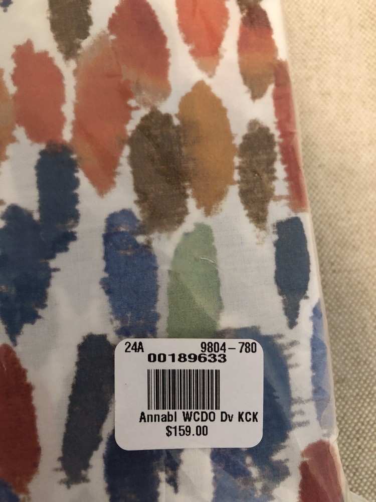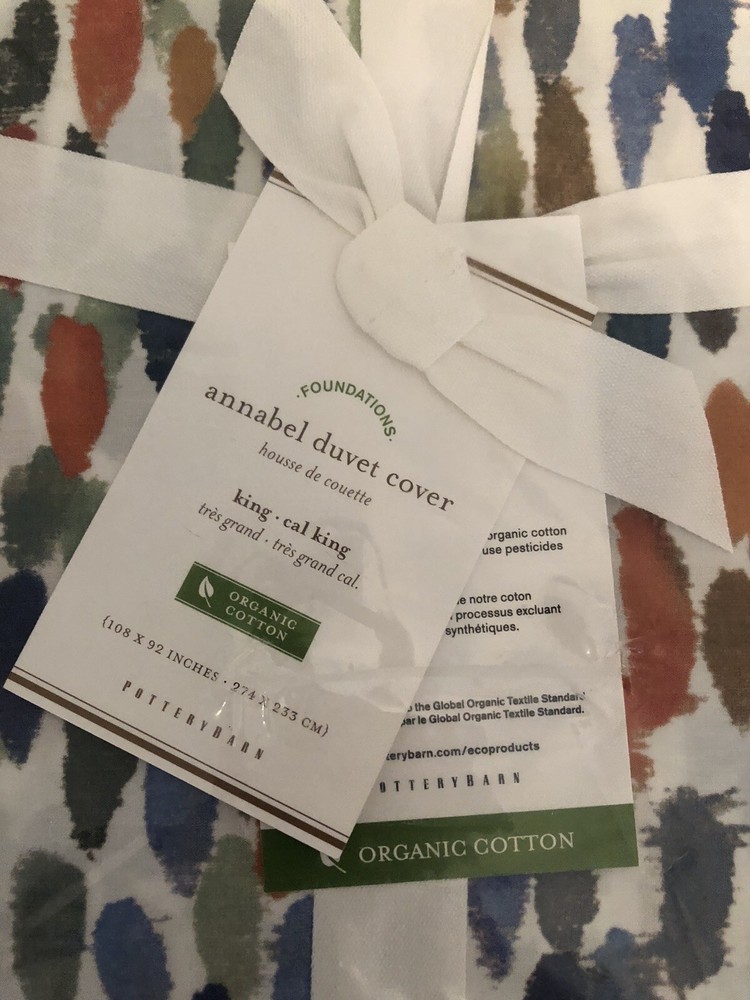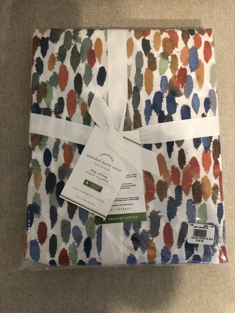 Pottery Barn Annabel Watercolor Dot Organic Percale KING Duvet Cover ~ Multi Details: Woven of 100% organic cotton percale. Reverses to same pattern. Duvet features a hidden button closure. 200-thread count Sham and inserts sold separately. Machine wash. Imported. Size: Duvet Cover: King: 92" l x 108" w Care: Machine wash in cold water, gentle cycle. Use only non-chlorine bleach when needed. Tumble dry on low heat; remove promptly. Warm iron as needed.