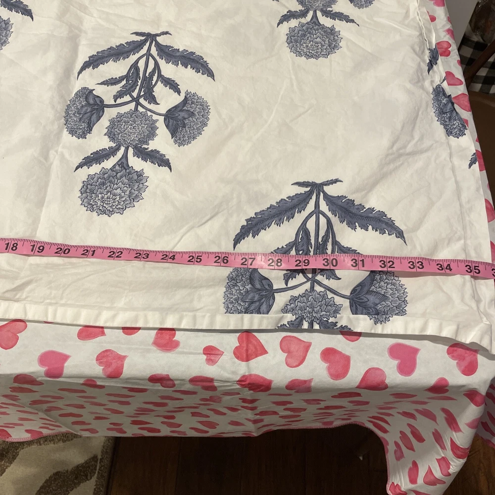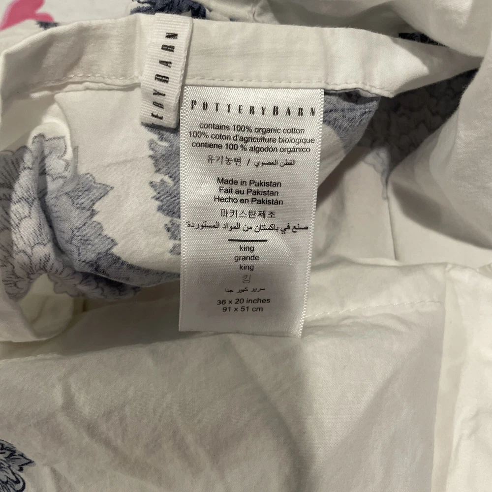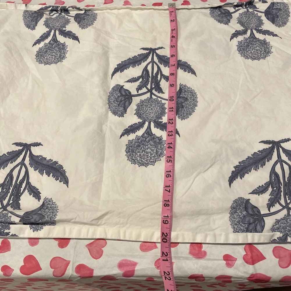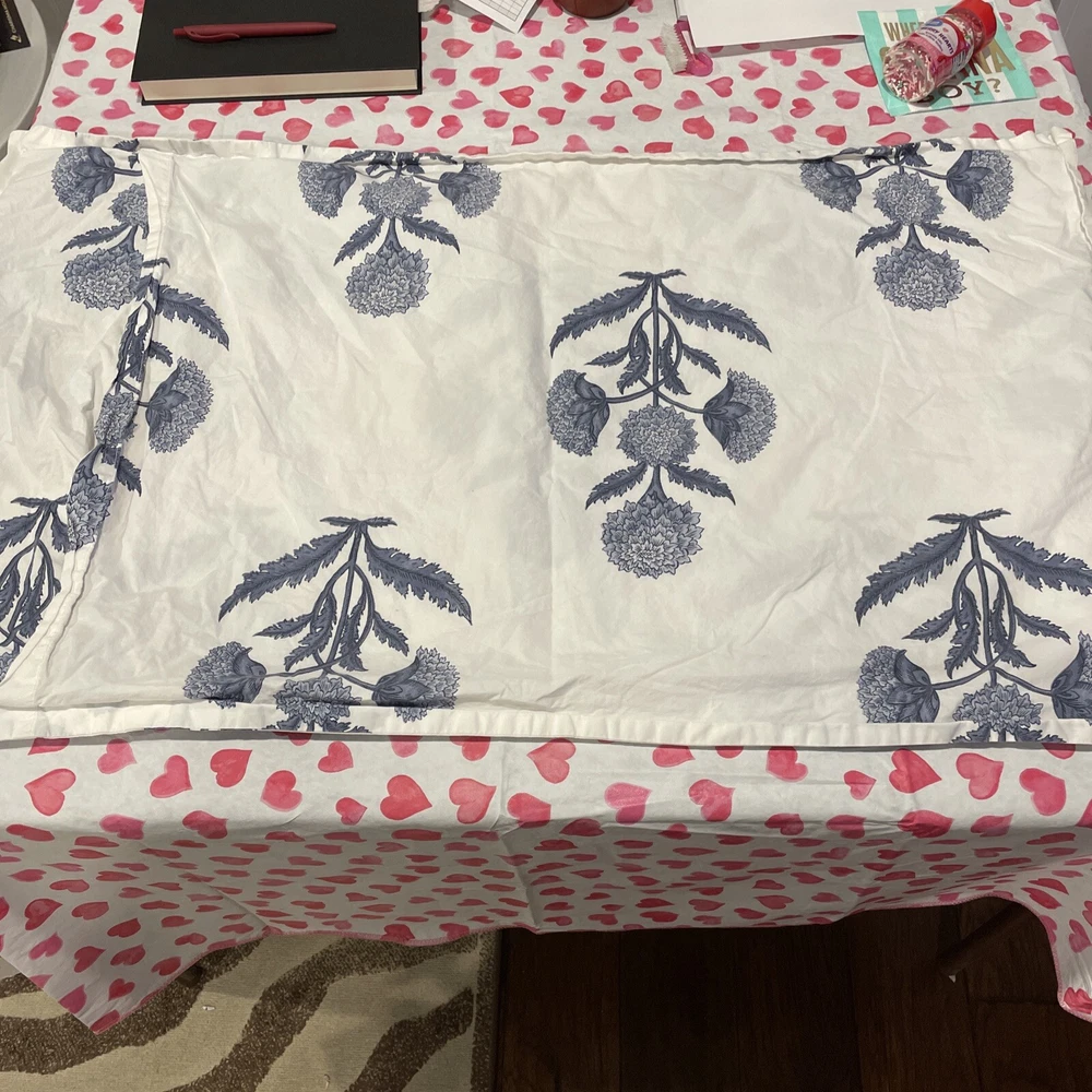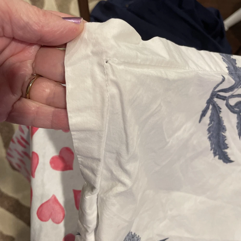 One King sham. Small pinhole where the tag was. Sorry about the hearts that show through on my table. Smoke free home.