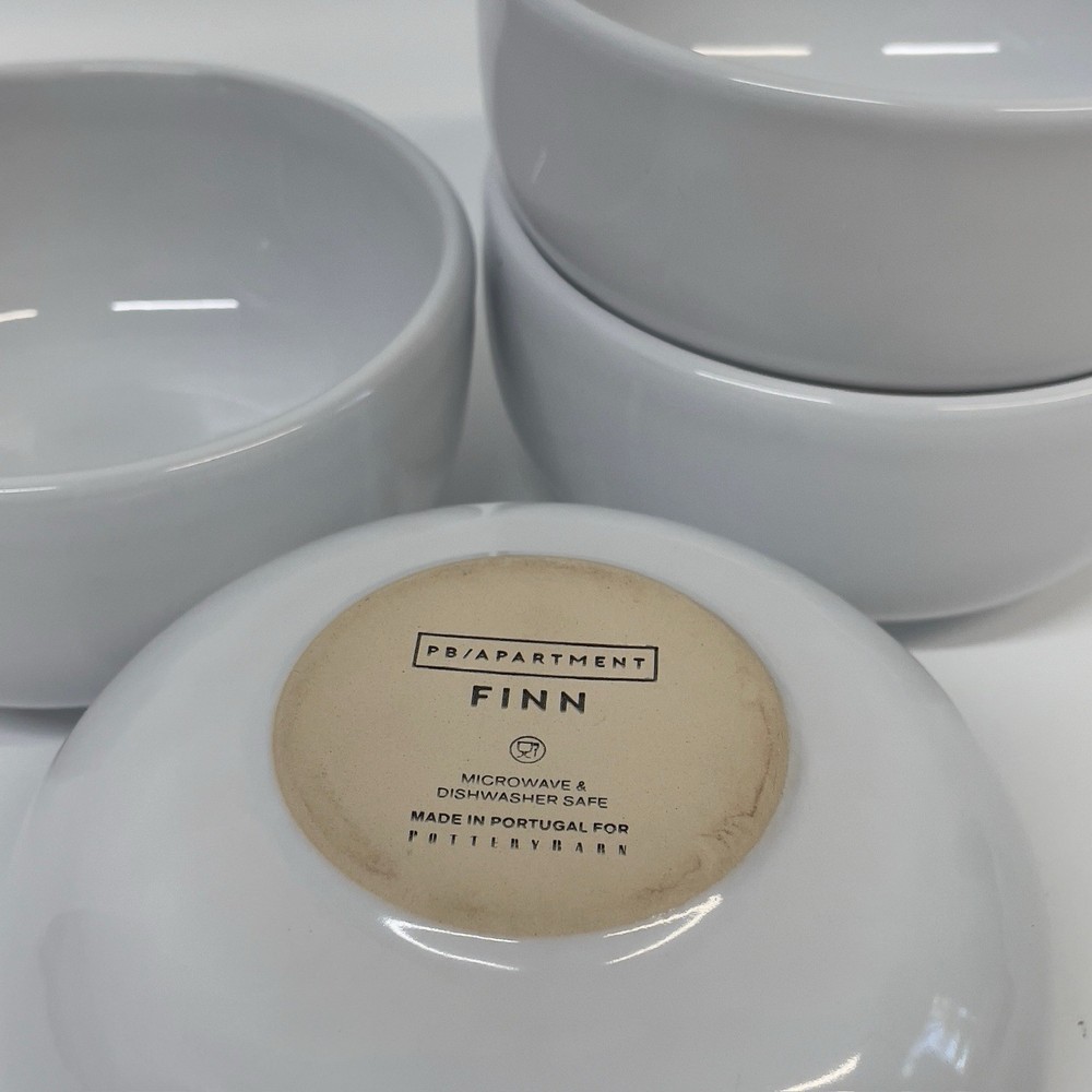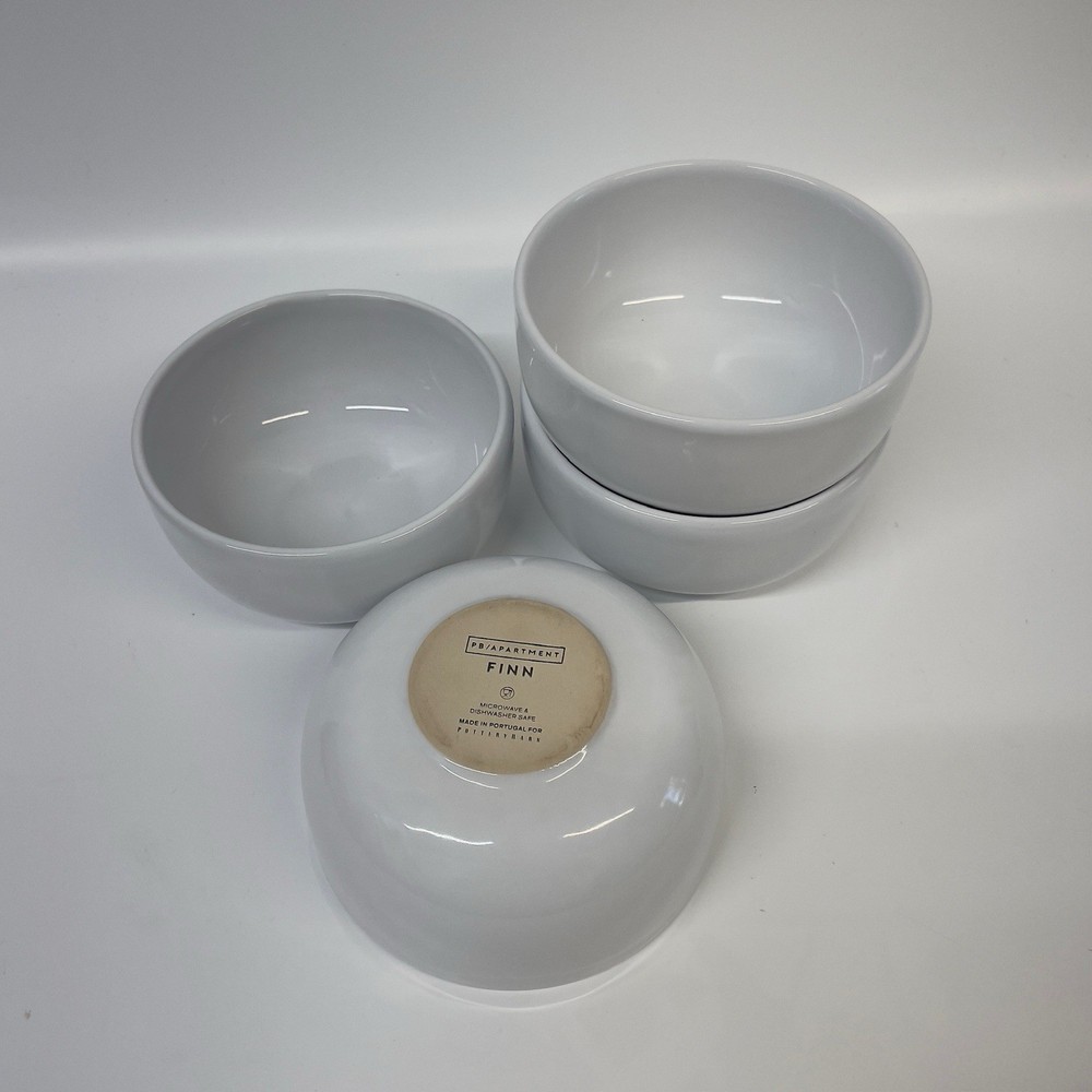 The Pottery Barn Apartment Finn Stoneware 4 Dinnerware Bowls are a stylish and functional addition to any kitchen. Made from durable stoneware, these round bowls feature a sleek modern white color and the decorative Finn pattern. Perfect for serving cereal or snacks, these microwave and dishwasher safe bowls are both practical and eye-catching. The set includes four pieces, making it ideal for small gatherings or everyday use in your apartment. Add a touch of elegance to your table with this chic stoneware bowl set from Pottery Barn. Portugal / Microwave & Dishwasher Safe 4-Piece 5.5" Bowls