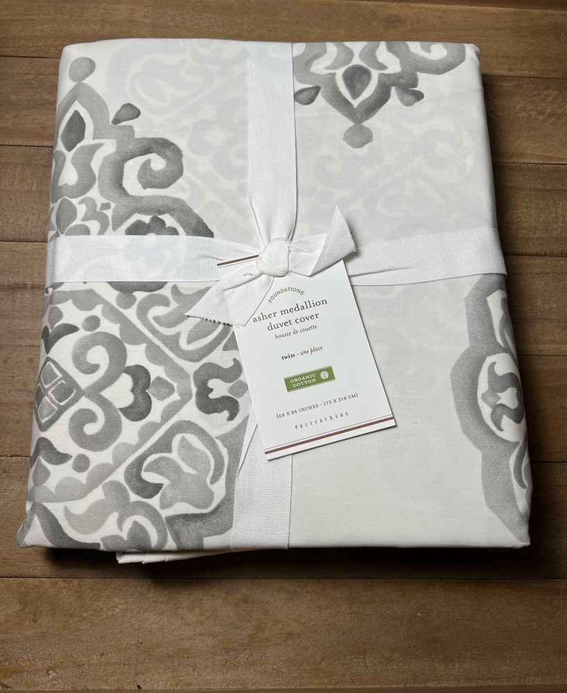 The Pottery Barn "Asher Medallion - Gray Twin Duvet is a stylish and luxurious addition to any bedroom. Made of soft cotton, this duvet cover features a beautiful medallion pattern in a versatile gray color. The set includes everything you need to create a cozy and inviting space, with dimensions of 86" in length and 68" in width. Perfect for a twin bed, this duvet cover is a great choice for those looking to add a touch of elegance to their bedroom decor.