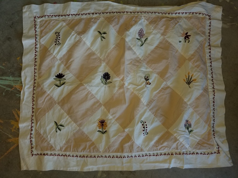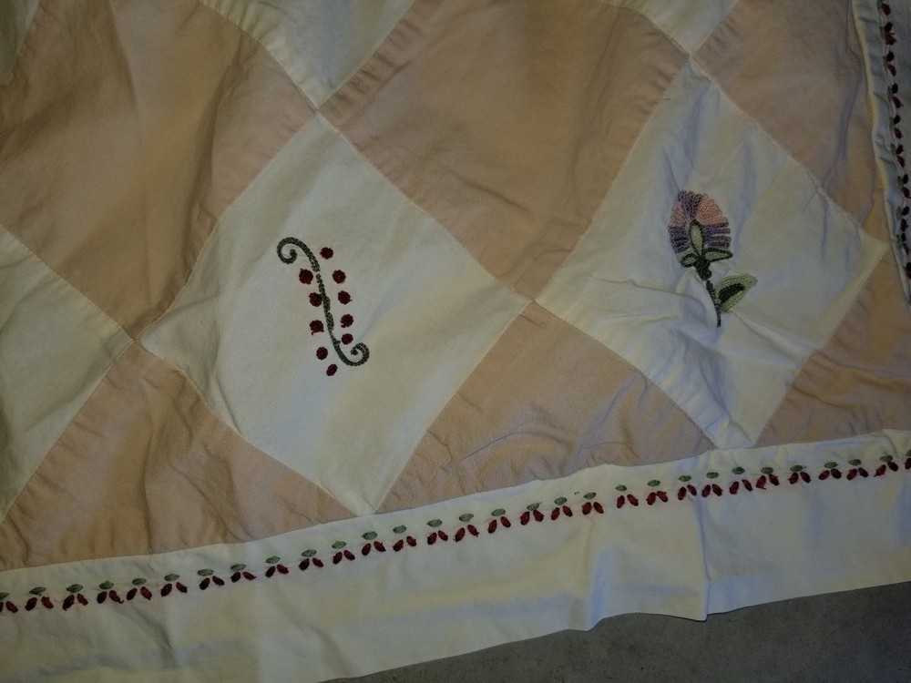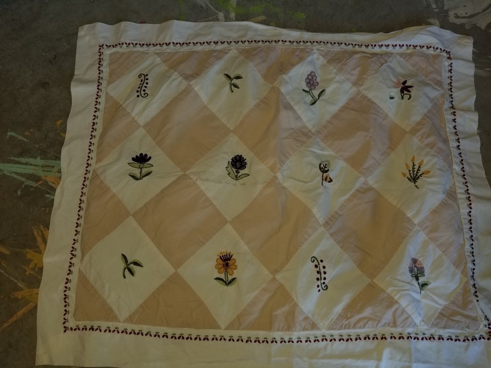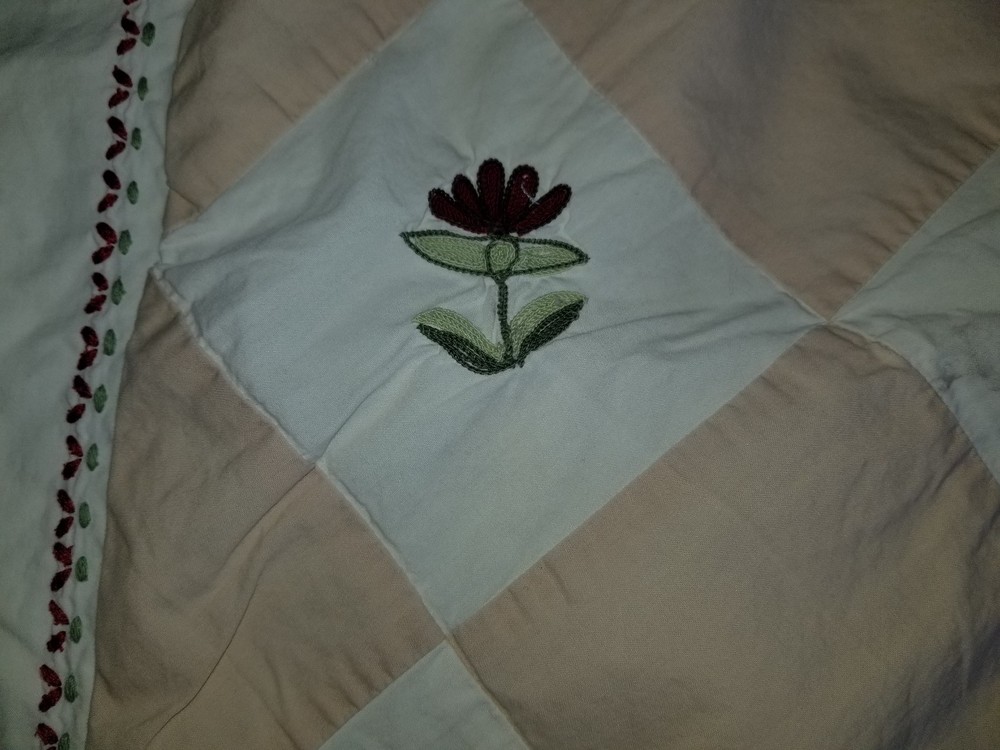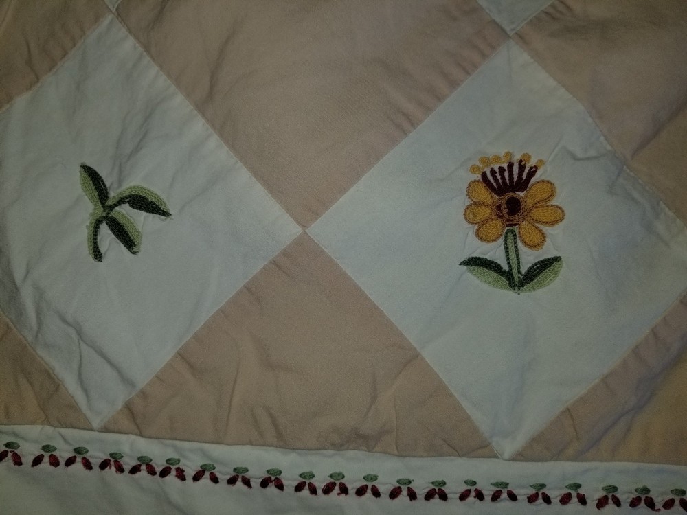 Beautiful! In very good condition, 100% cotton; creamy white/ivory with harlequin pattern in sand with embroidered flowers and leaves; has envelope closure; Will combine shipping for multiple items. Thanks for looking. All items are sold "AS IS" , they are pre-owned unless otherwise stated and will need to be washed ; if you have any questions about the item please ask before purchasing; No refund will be given on a missing part, wrong colors (ex. White not as white as customer wants), wrong pattern, dirt (I live in the desert so it's inevitable – it washes right out), size, grease pencil marks or tag holes. I try to describe item the best that I can and supply numerous photos, please look at photos closely -- I will be more than happy to take different photos, measurements, etc. if needed for you. Thanks for looking!