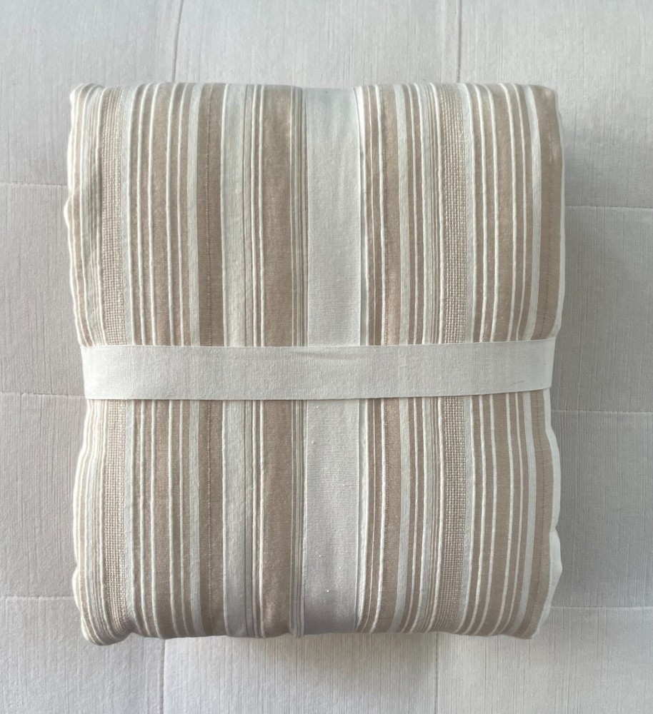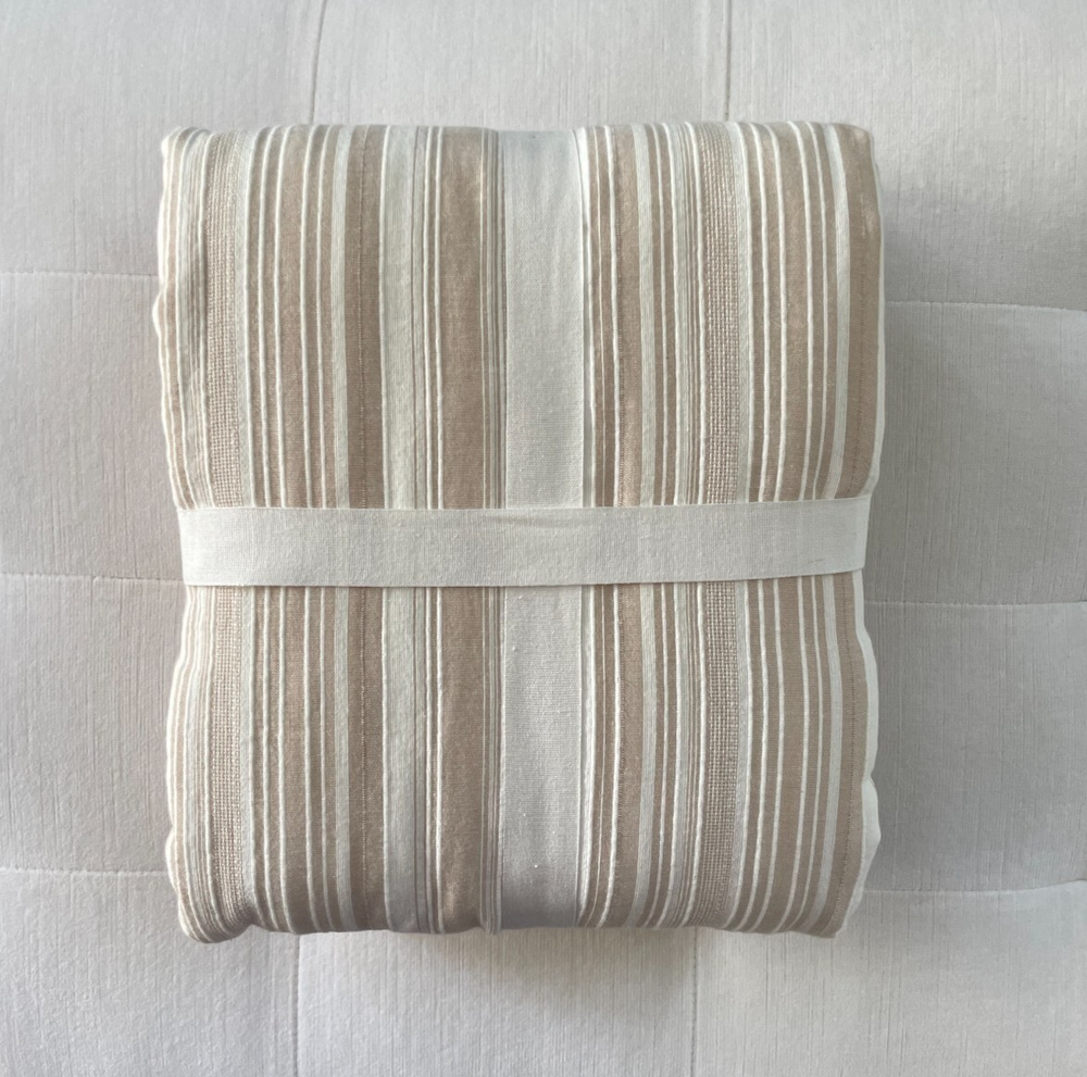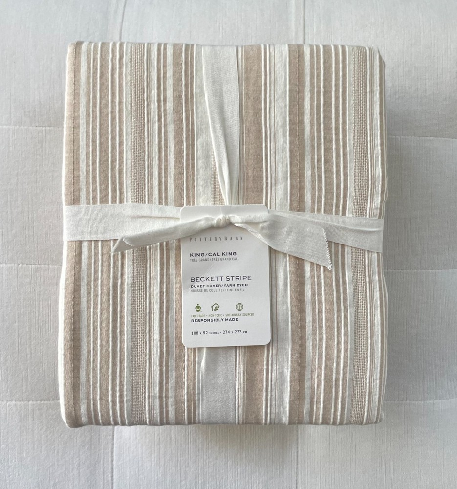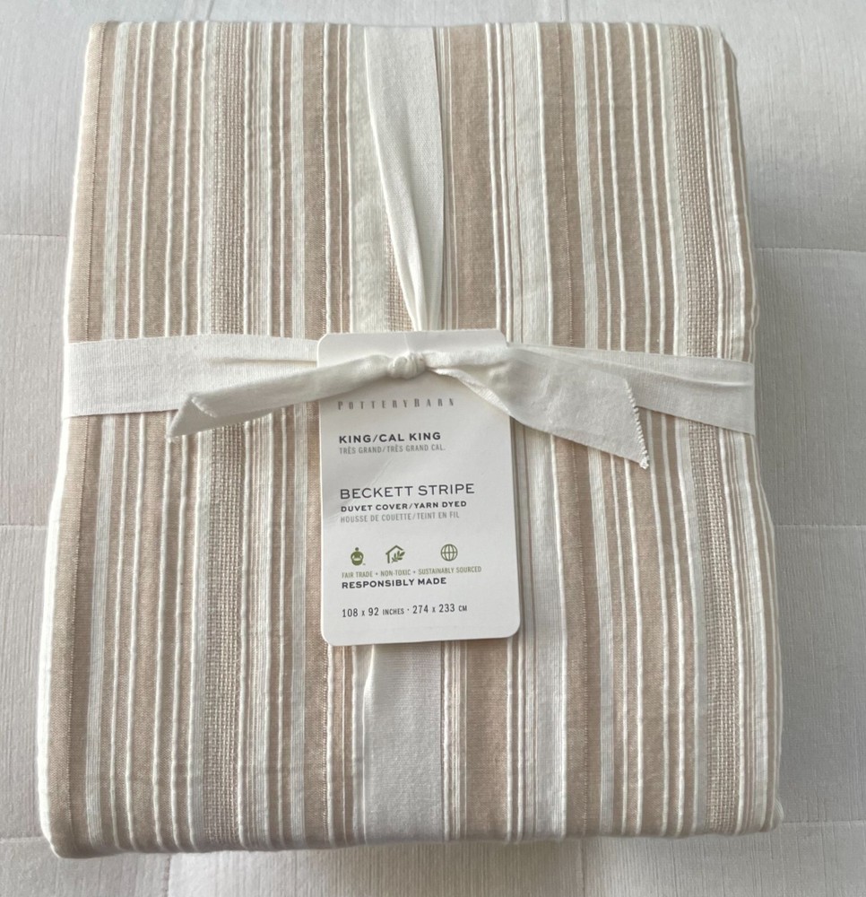 Pottery Barn Beckett Stripe Duvet Cover King/California King ~Khaki New with tags PB describes as: A classic variegated lines with subtle texture duvet that pairs well florals and solid bedding Made of 100% cotton Reverses to solid Duvet has interior ties and a hidden button closure Standard 100 by Oeko Tex certified Pet & Smoke Free Shipped within 1 business day Thank you!