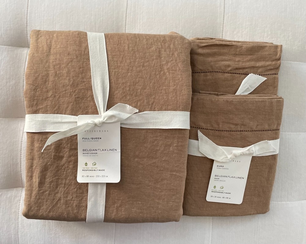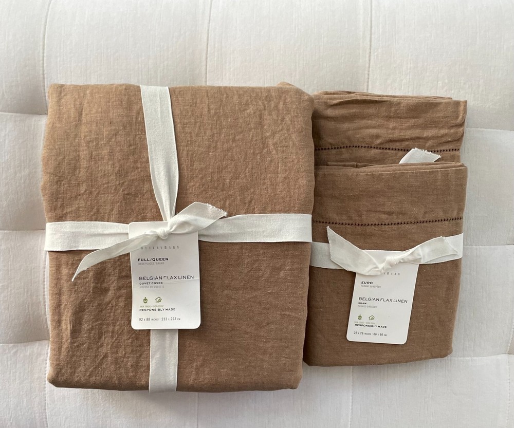 Pottery Barn BELGIAN FLAX LINEN Duvet Full/Queen & 2 Euro Shams ~Bronze New with tags PB describes as: Linen woven from 100% Belgian flax. Prewashed for a supersoft hand feel. Ideal for warm or cool temperatures. STANDARD 100 by OEKO-TEX® certified. Tested in an independent lab and verified to be safe from over 350 harmful substances. Fair Trade Certified™. Duvet features a hidden button closure with inner ties that keep insert in place; sham features an envelope closure. Machine wash. Imported. Full/Queen Duvet Cover: 88" w x 92" l Euro Sham: 26" sq. Pet & Smoke Free Shipped within 1 business day Thank you!