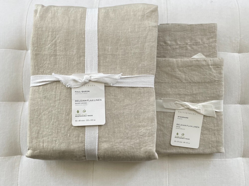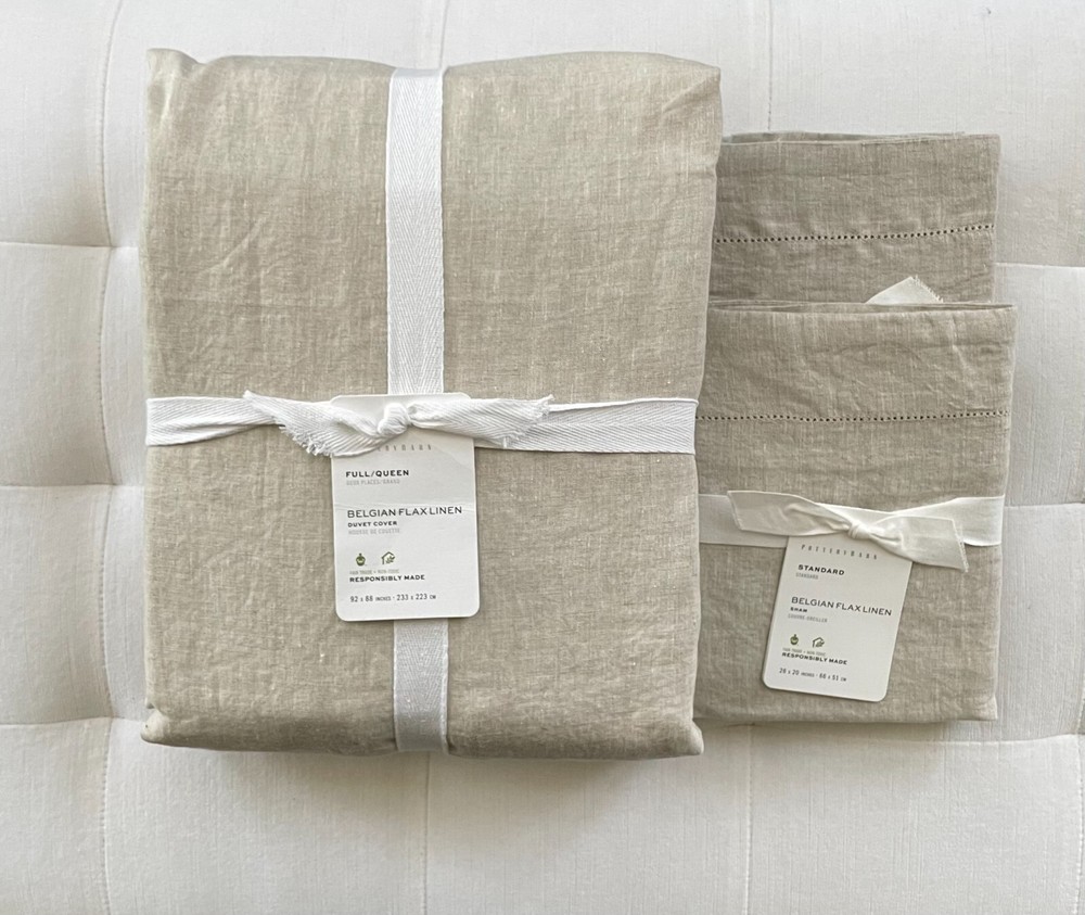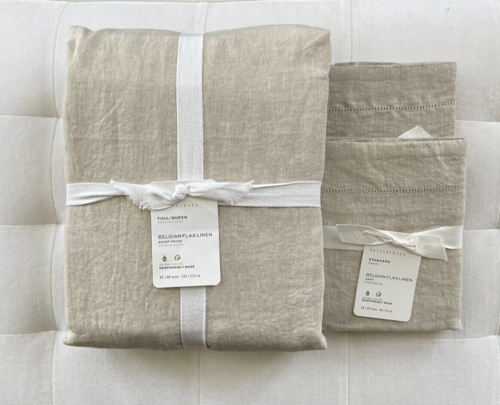 Pottery Barn BELGIAN FLAX LINEN Duvet Full/Queen & 2 Standard Shams ~Flax New with tags PB describes as: Linen woven from 100% Belgian flax. Prewashed for a supersoft hand feel. Ideal for warm or cool temperatures. STANDARD 100 by OEKO-TEX® certified. Tested in an independent lab and verified to be safe from over 350 harmful substances. Fair Trade Certified™. Duvet features a hidden button closure with inner ties that keep insert in place; sham features an envelope closure. Machine wash. Imported. Pet & Smoke Free Shipped within 1 business day Thank you!