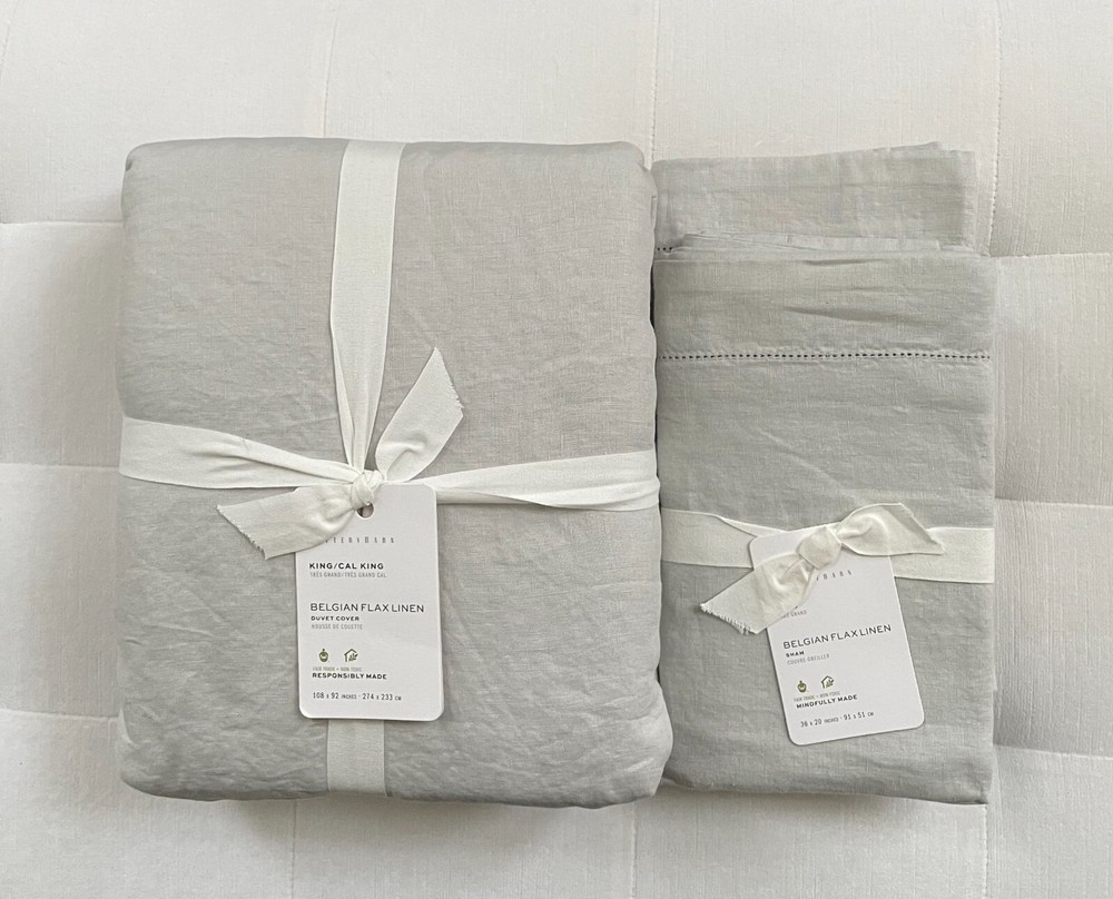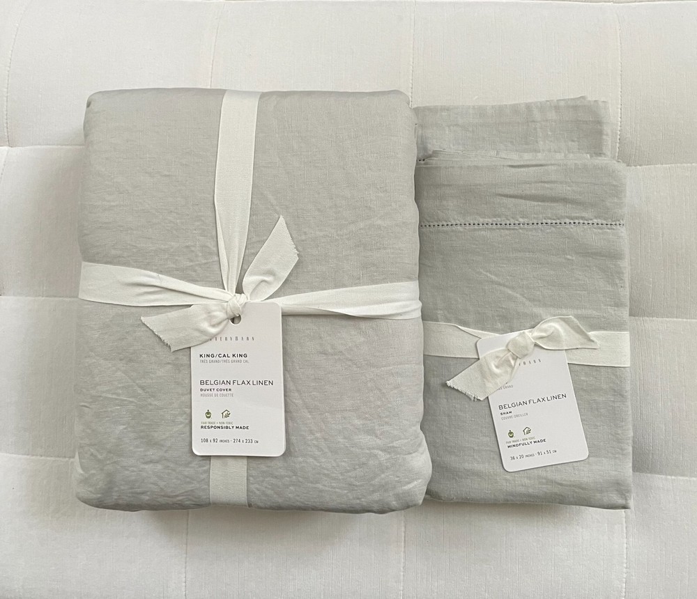 Pottery Barn BELGIAN FLAX LINEN Duvet Cover King/Cali King & Two King Shams ~Soft Gray New with tags PB describes: Effortless, timeless, and made for layering, our heirloom linen bedding is the epitome of casual luxury. Woven from the world’s finest Belgian flax, it’s specially washed for incredible softness that only gets better with time. One of our absolute favorite fabrics, linen keeps you cool when it’s warm and warm when it’s cold. This is proudly made at a Fair Trade Certified™ factory. Linen woven from 100% Belgian flax. Specially washed for a super soft hand feel. Ideal for warm or cool temperatures. STANDARD 100 by OEKO-TEX® Certified: WSI Certificate #: 14.HUS.42449: tested for 350+ harmful substances to keep you and your family safe from chemicals common to textile manufacturing. Fair Trade Certified™. The purchase of this product helps ensure fair and safe labor practices, improve livelihoods, and empower workers to invest in their communities. Duvet features a hidden button closure with inner ties that keep insert in place; sham features an envelope closure. Insert sold separately. Machine wash. Imported. King/Cal. King: 92" l x 108" w King: 36" w x 20" h Flange: 2" Retail $479 Pet & Smoke Free Ships within 1 business day Thank you!