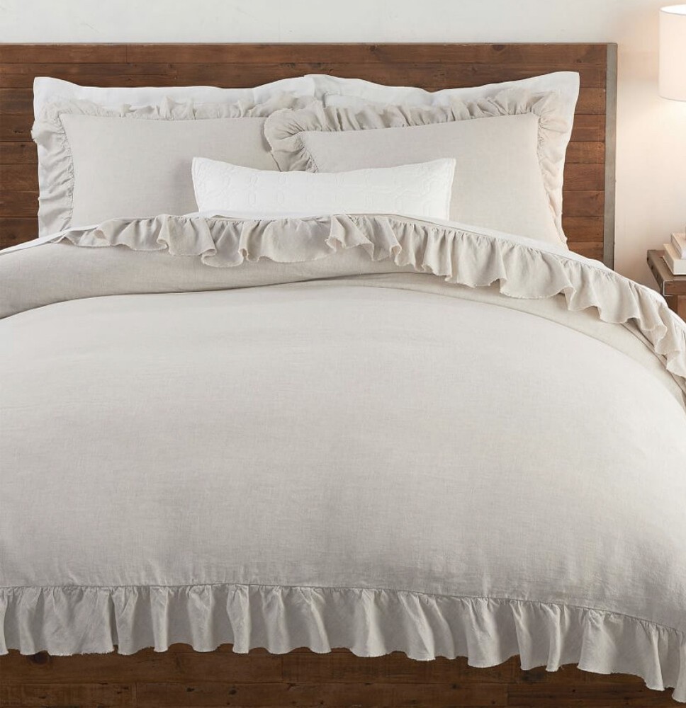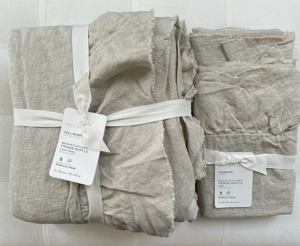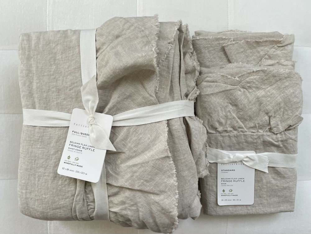 Pottery Barn BELGIAN FLAX LINEN FRINGE RUFFLE Full/Queen Duvet & Two Standard Shams ~Flax New with tags PB describes as: Front is woven from 100% Belgian Flax; reverse is 75% cotton and 25% linen. Breathable Belgian flax linen is ideal for warm or cool temperatures and its durability lets you love it for years. Designed with a waffle texture. Soft and cool to the touch. Pre-washed for a super soft hand feel. STANDARD 100 by OEKO-TEX® Certified: tested for 350+ harmful substances to keep you and your family safe from chemicals common to textile manufacturing. Fair Trade Certified™. The purchase of this product helps ensure fair and safe labor practices, improve livelihoods, and empower workers to invest in their communities. Insert sold separately. Imported. Full/Queen Duvet: 88" l x 92" w Standard Sham: 20" h x 26" w Flange: 2" Retail $437.00 Pet & Smoke Free Ships within 1 business day Thank you