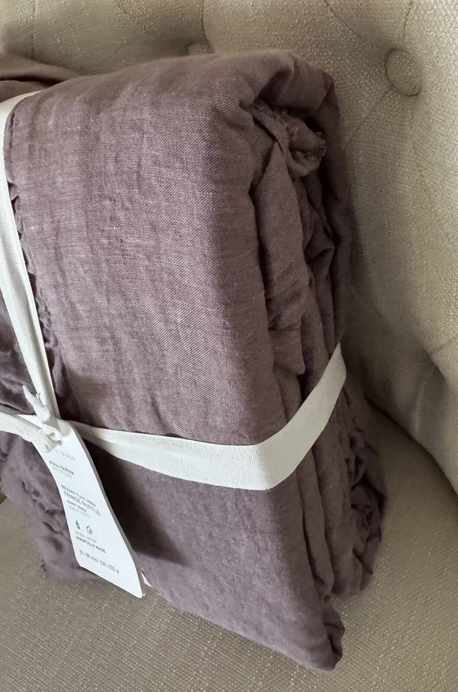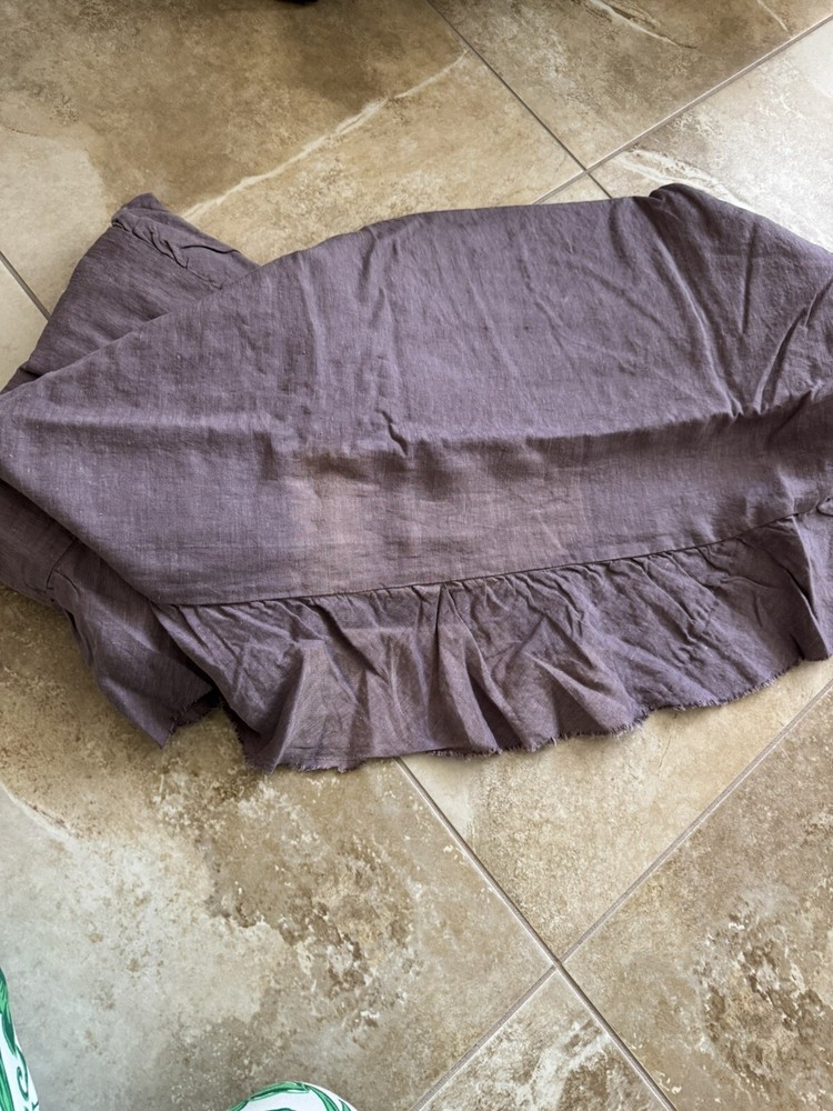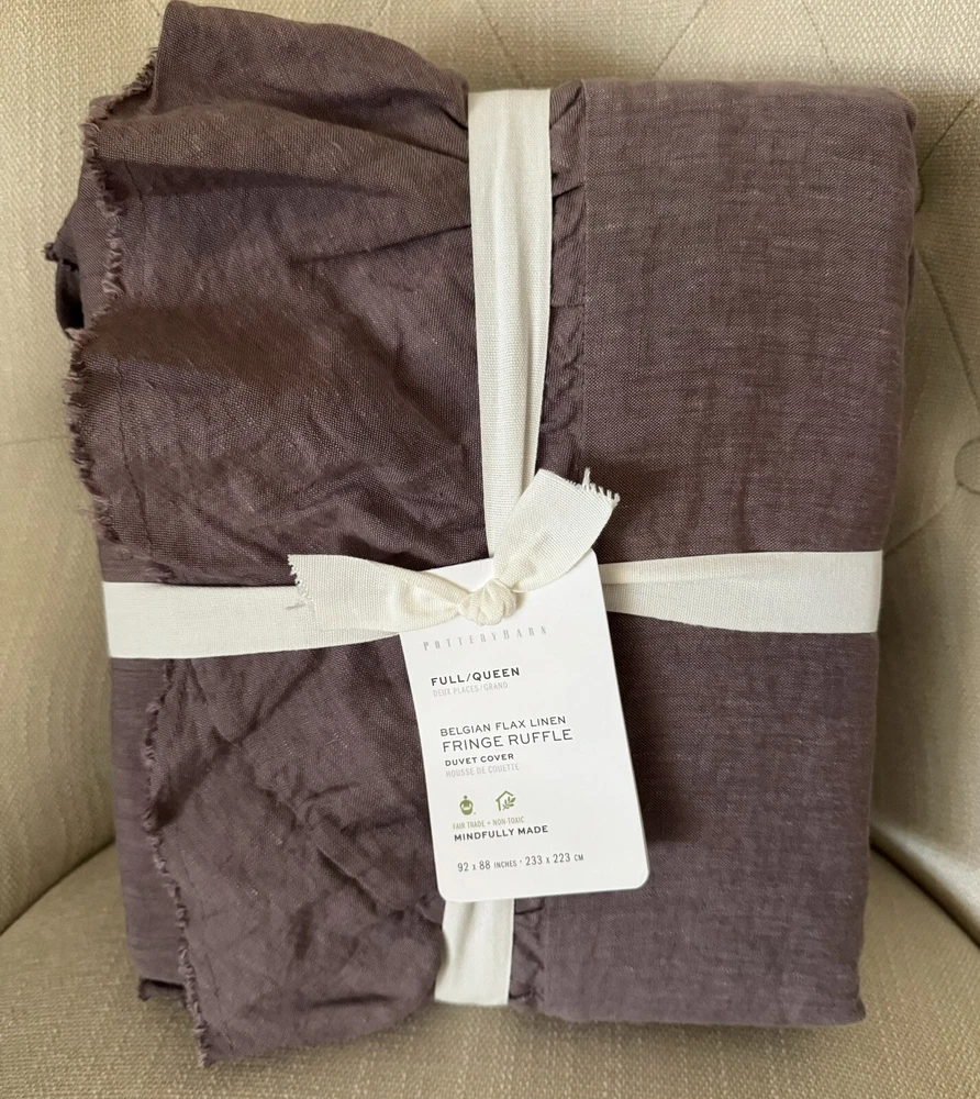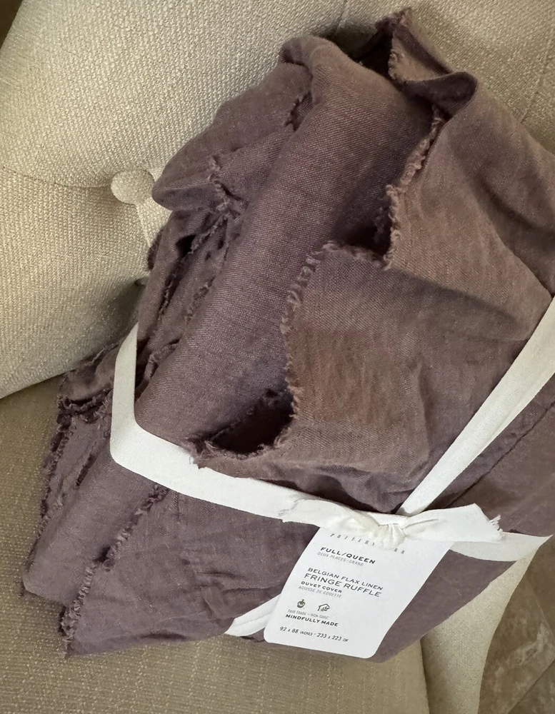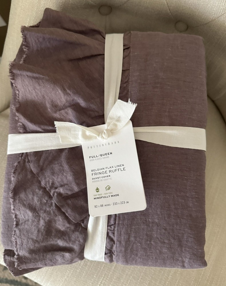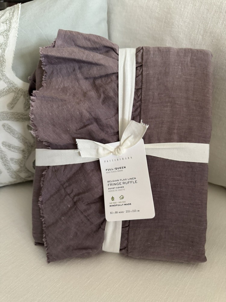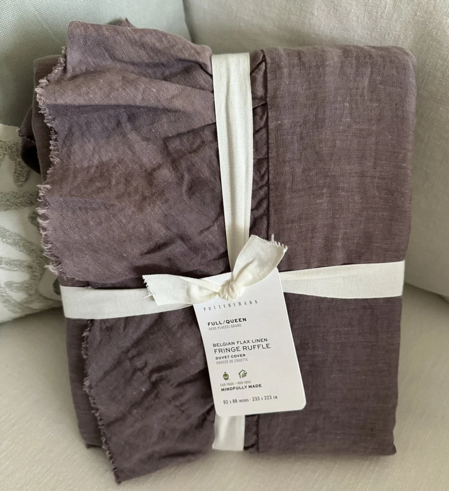Brand New With Tags / Defects Pottery Barn ~Belgian Flax Fringe Ruffle~ Full/Queen Duvet Cover. Color: Fig *** PLEASE NOTE - The duvet cover has a small section where the color is slightly faded. I suspect that it’s from being exposed to day/sun light as it’s just the top portion of the folded duvet. I believe that the fading is on the top of the duvet and it’s on one side. Flipping the duvet cover over or placing the lighter area closest to a wall would solve the problem. It’s really not a large area, and I’ve checked to ensure that the fading is only in the one area. Please take a look at all pictures and please understand that this item will be a final sale (returns only at buyers expense and must include tags and be in new condition). Duvet cover retails for $300 plus tax and shipping, and the price has been drastically reduced due to this imperfection.*** Our romantic ruffled bedding with fringe detail and raw edges is tailored from the world’s finest Belgian flax. Prewashed for softness – that only gets softer with each wash – it’s also naturally insulating, keeping you warm when it’s cold and cool when it’s warm. Linen woven from 100% Belgian flax; reverse is 75% cotton and 25% linen blend. Breathable Belgian flax linen is ideal for warm or cool temperatures, and its durability lets you love it for years. Prewashed for a super soft hand feel. Designed with romantic ruffle edges. OEKO-TEX® STANDARD 100:m Duvet features a hidden button closure with inner ties that keep insert in place; sham features an envelope closure. Duvet cover, insert and shams sold separately. Imported. Linen will get softer with every wash. Machine wash in cold water separately on gentle cycle. Use only non-chlorine bleach, if needed. Line or tumble dry on a low temperature. Full/Queen Duvet: 88" l x 92" w Please let me know if you have any questions or would like additional pics. Also, please ask all questions prior to bidding as I do not normally accept returns, unless I have made a mistake while listing the item. At this time, I am only able to ship to confirmed US addresses... Item comes from a clean, non-pet and non-smoking home. Thanks for taking the time to view this great item, and Happy Shopping!! 😄